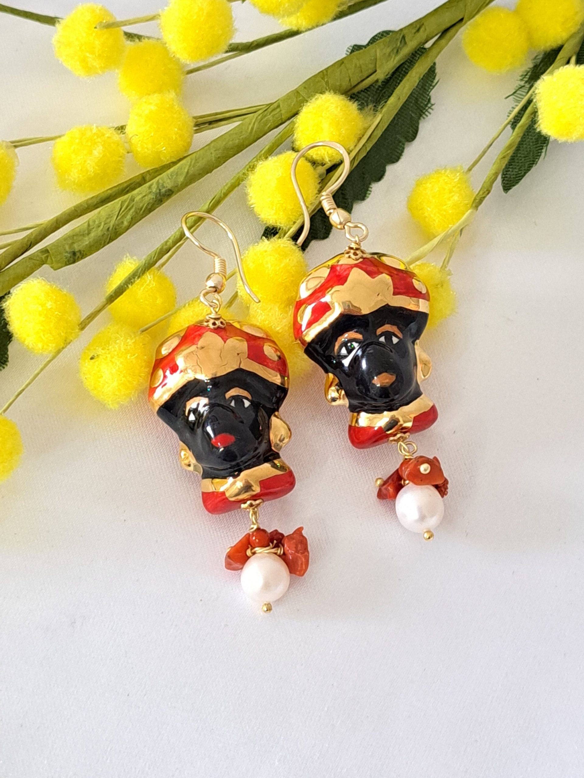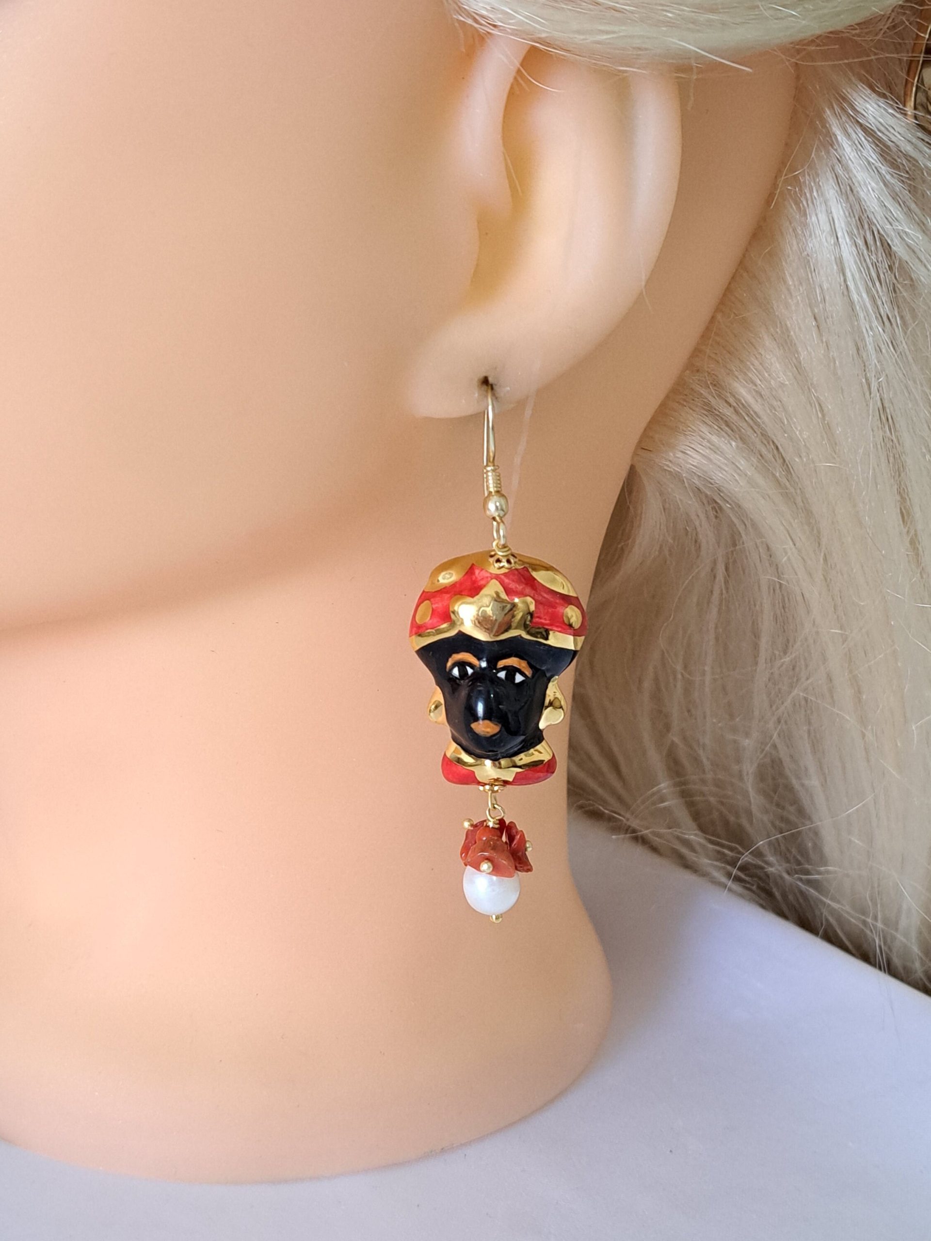Orecchini pendenti con teste di moro in ceramica di Caltagirone realizzata e dipinta a mano, con applicazioni foglia oro 22 kt, grandi 3 cm cm dimensioni, perle naturali bianche, corallo rosso mediterraneo , chiusura a monachelle in argento placcato oro, lunghezza totale 6,5 cm.