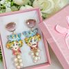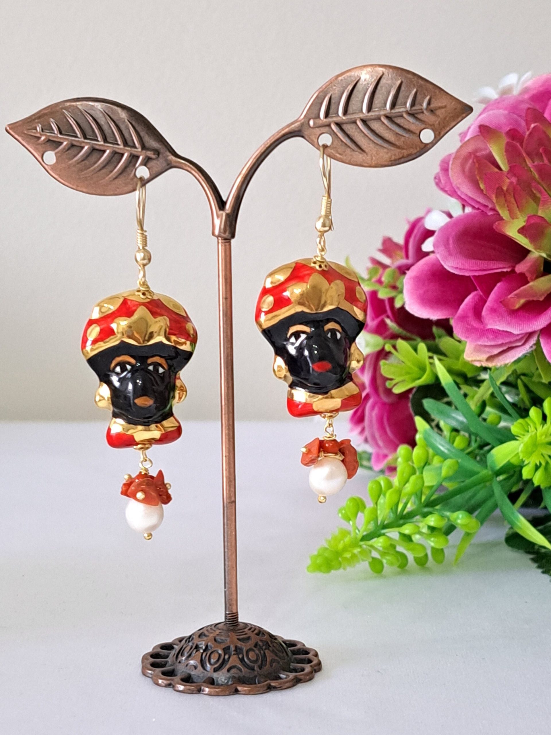 Orecchini ceramica Caltagirone, orecchini teste di moro con rose corallo bianco e gocce imitazione avorio , orecchini siciliani