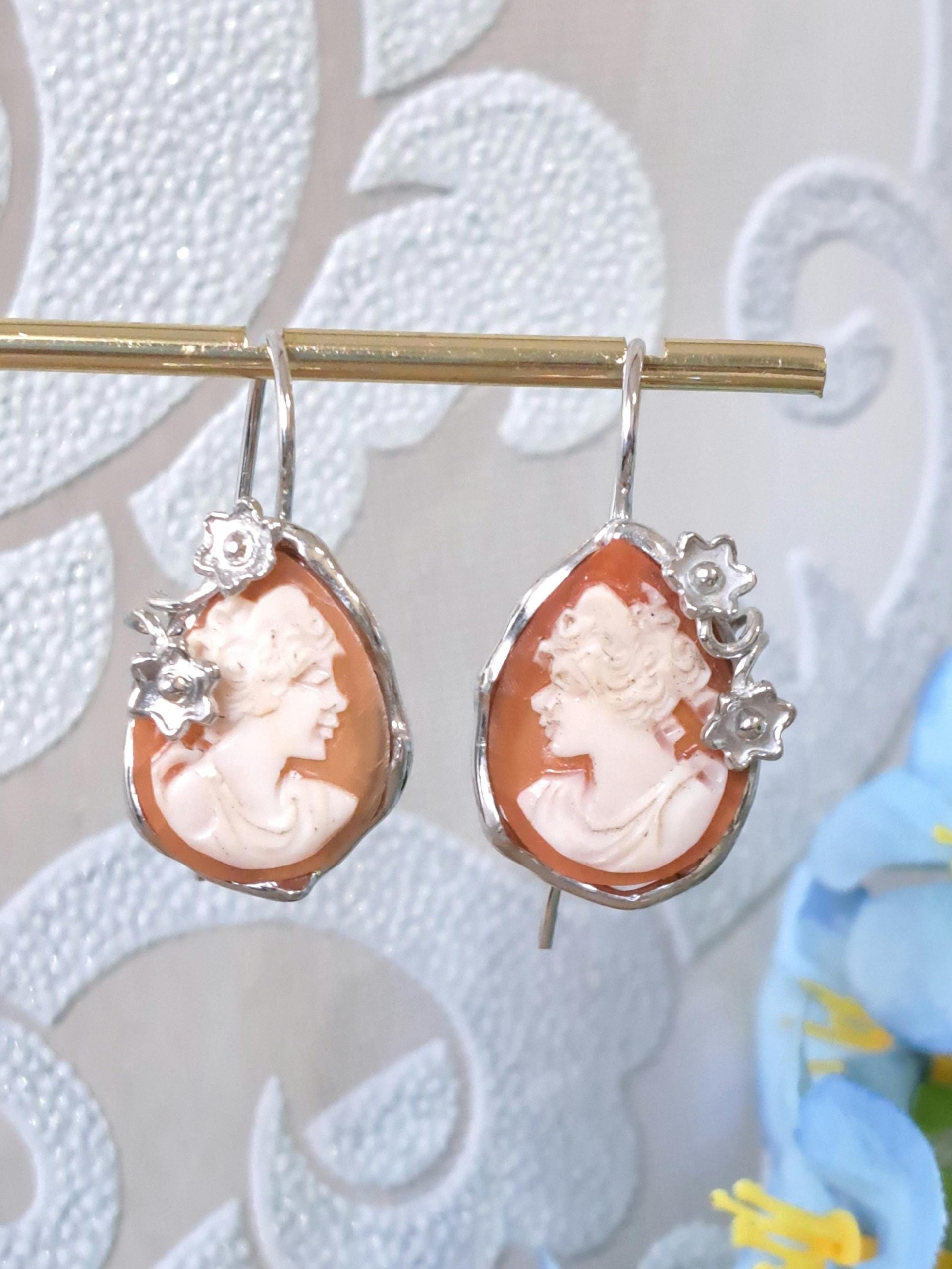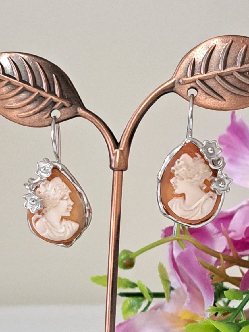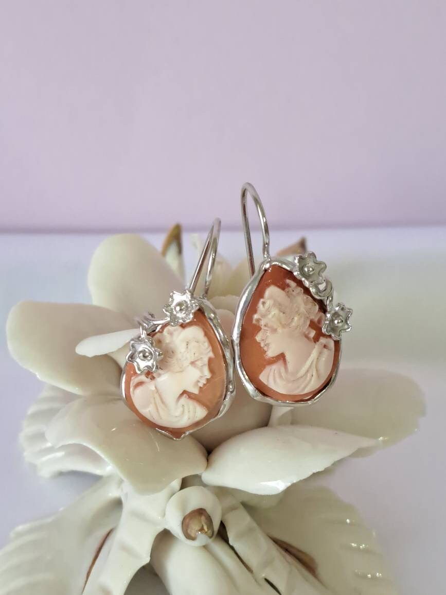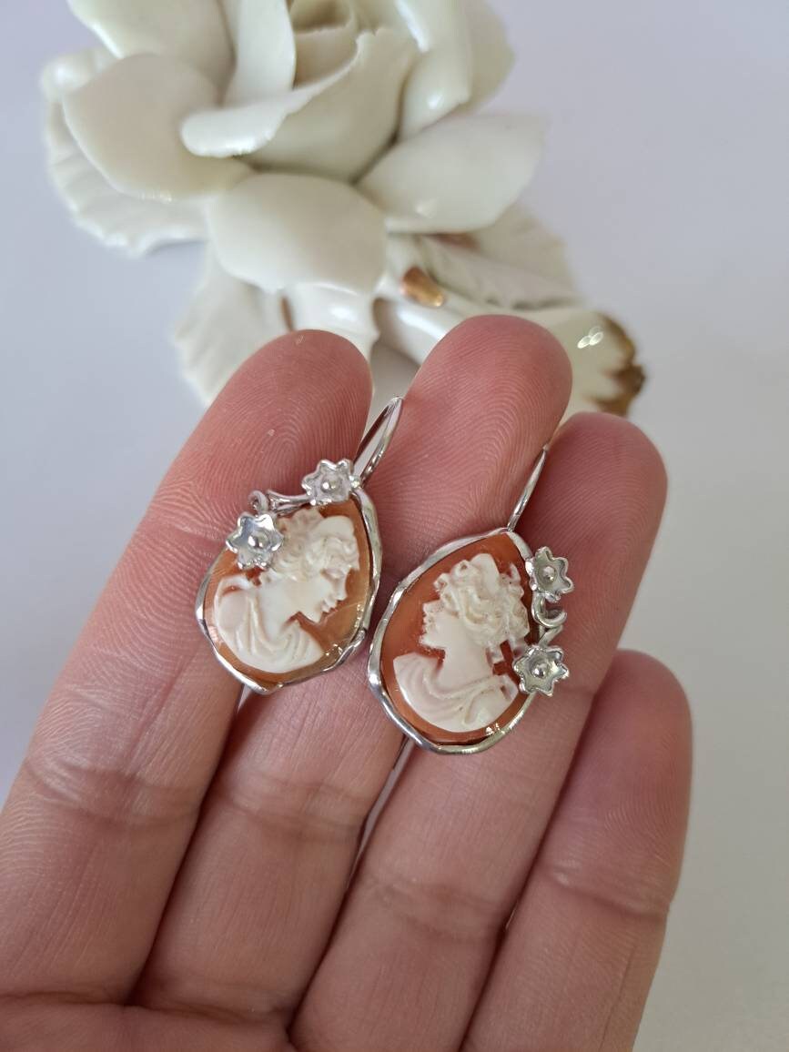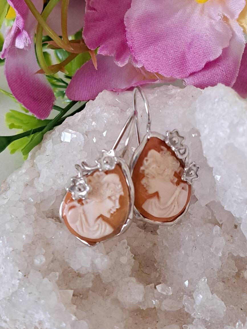 Orecchini artigianali con cammeo conchiglia sardonica scolpito a mano a Torre del greco raffigurante volto di donna, 2,2×1,7 cm dimensioni , cornice con fiori e chiusura a gancetto in argento 925 .