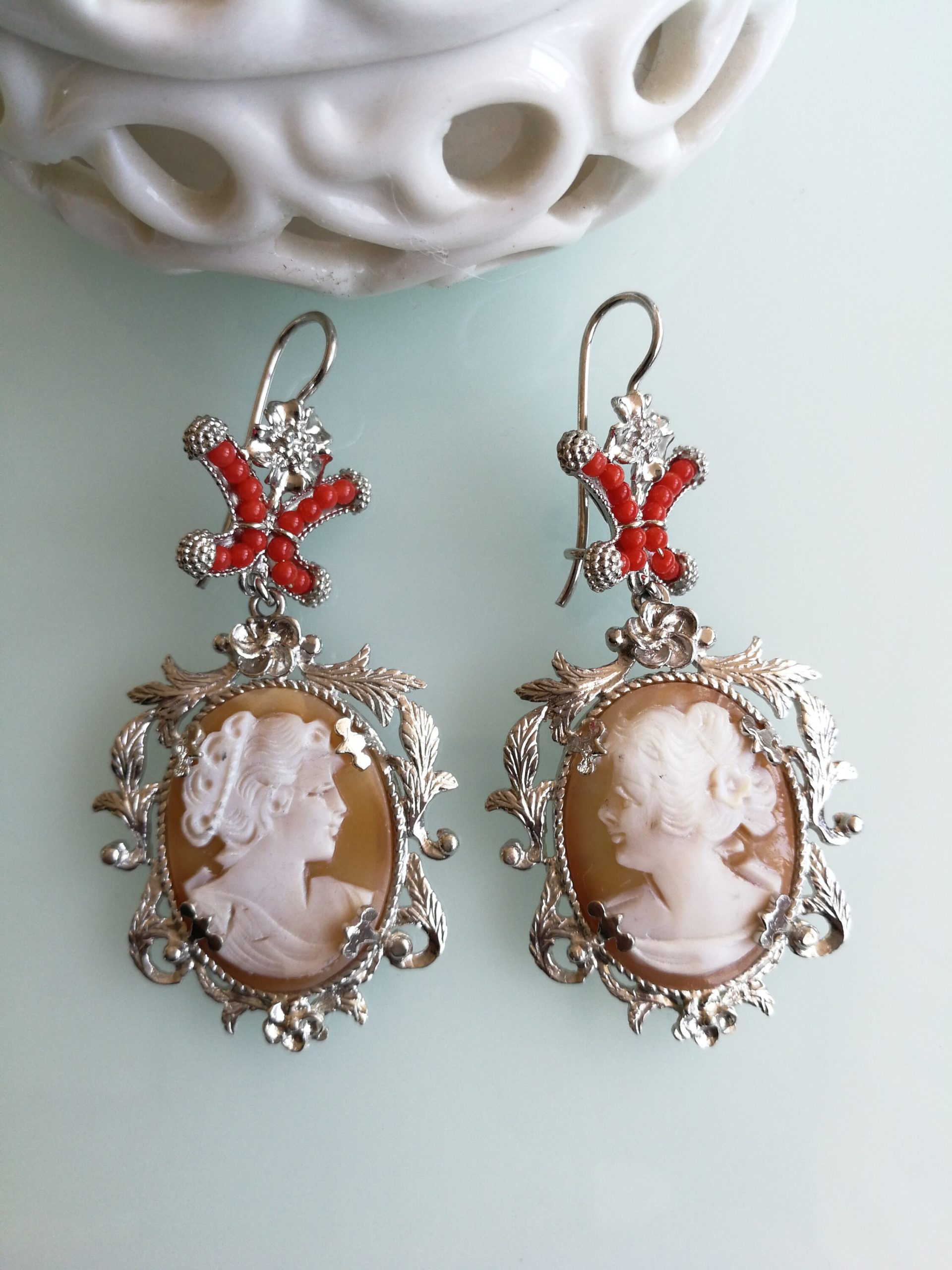 Bellissimi ed esclusi orecchini antichi con cammeo conchiglia originale che raffigura volto di donna,su montatura in argento 925 con lavorazione artigianale antica a cornice. Monachella in argento con piccoli coralli rossi del mediterraneo. Pezzo unico da antiquariato. Antique jewelry.
