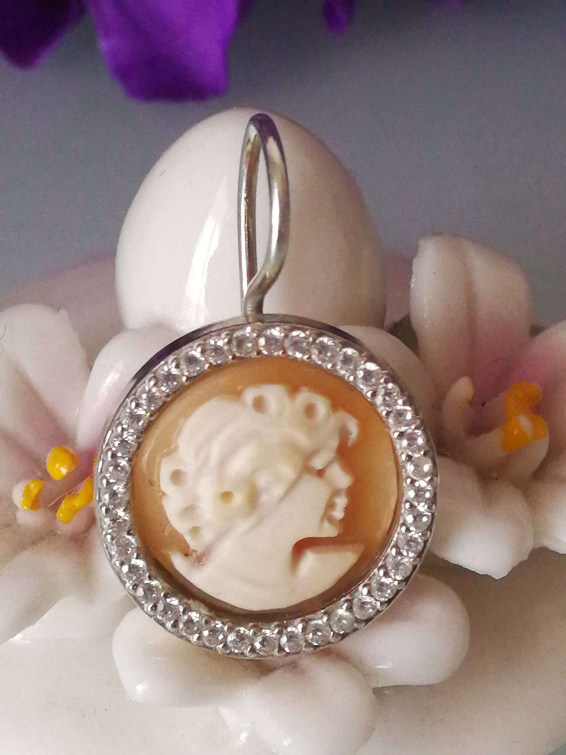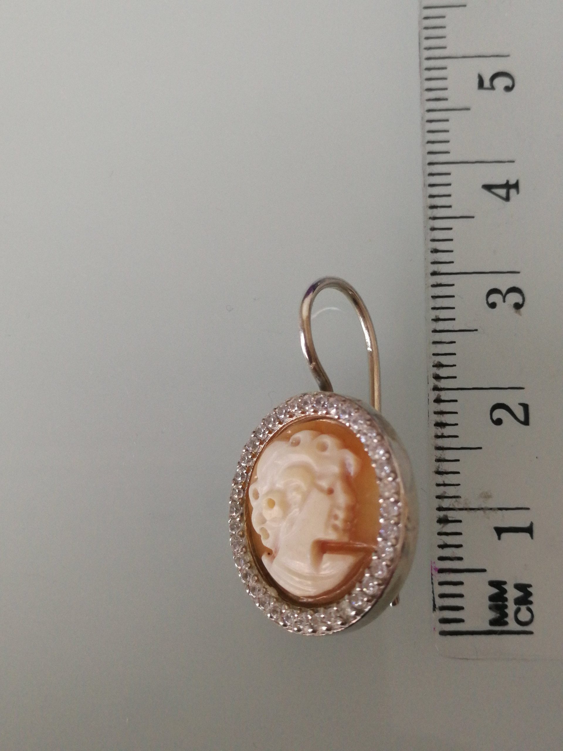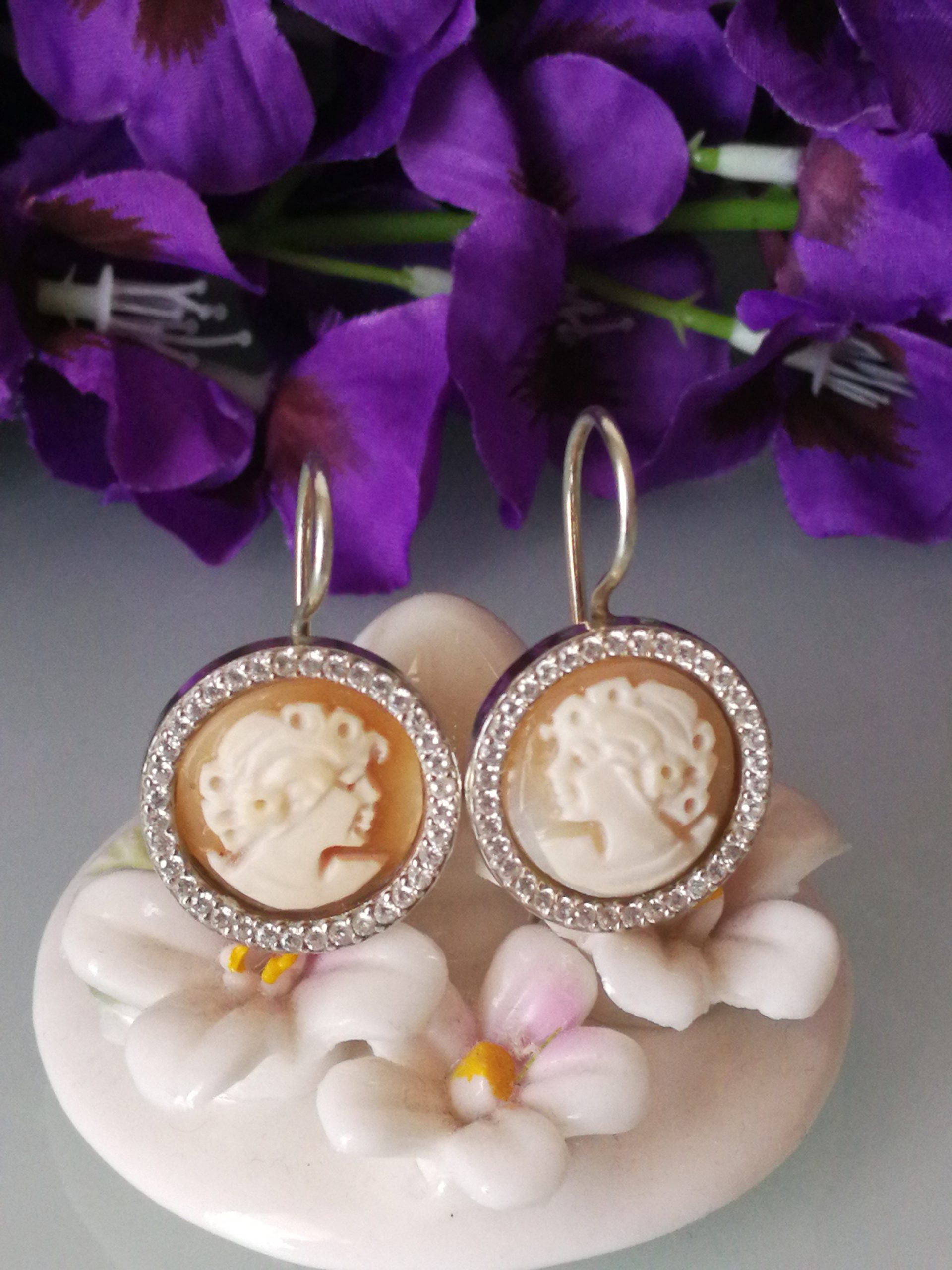 Orecchini cammeo conchiglia originale e zirconi bianchi.Orecchini argento. Cammeo sardonico