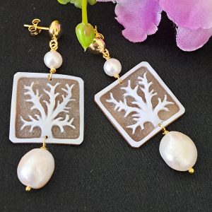 Orecchini cammeo corallo e perle bianche barocche , orecchini argento 925 , gioielli italiani