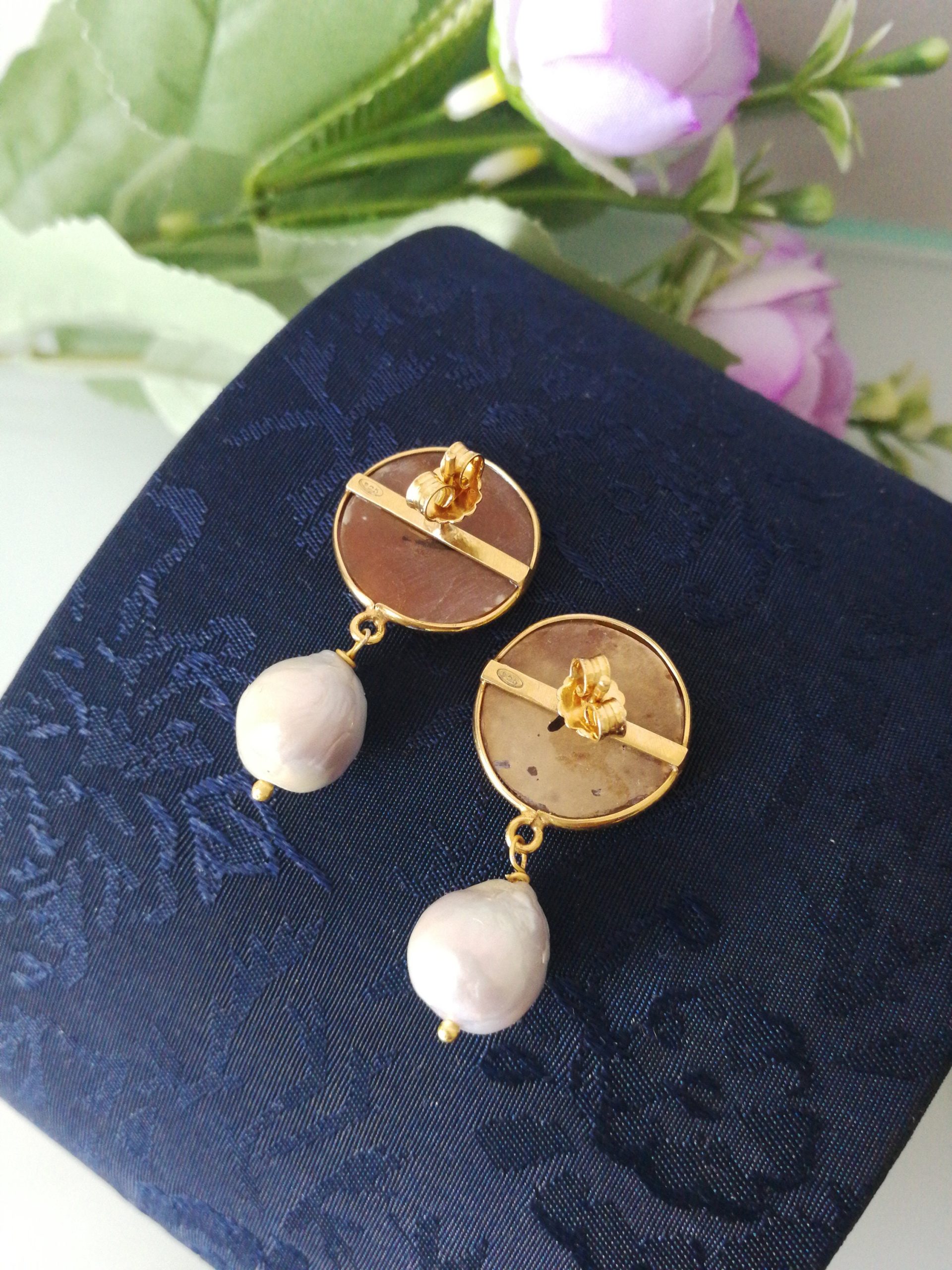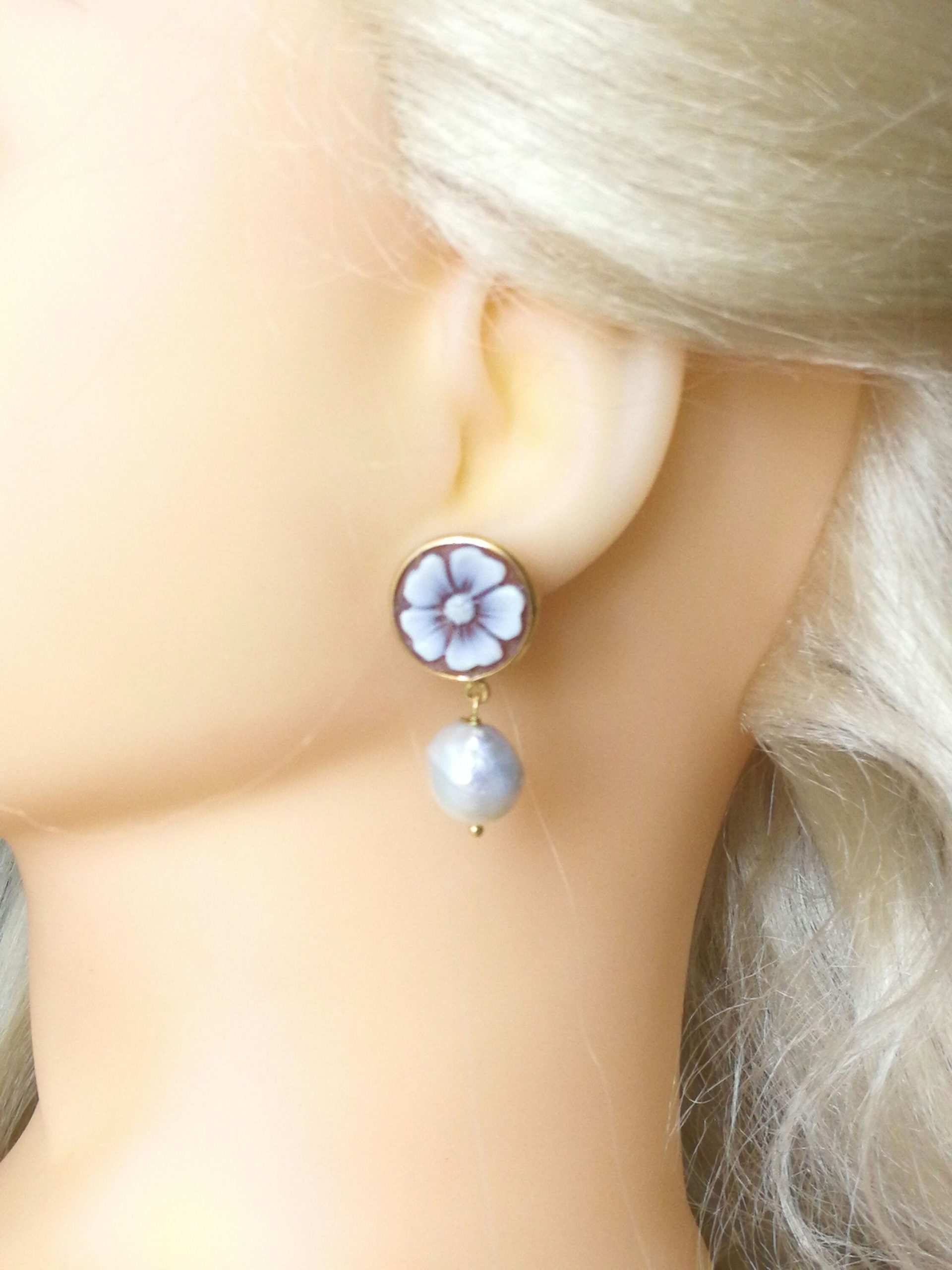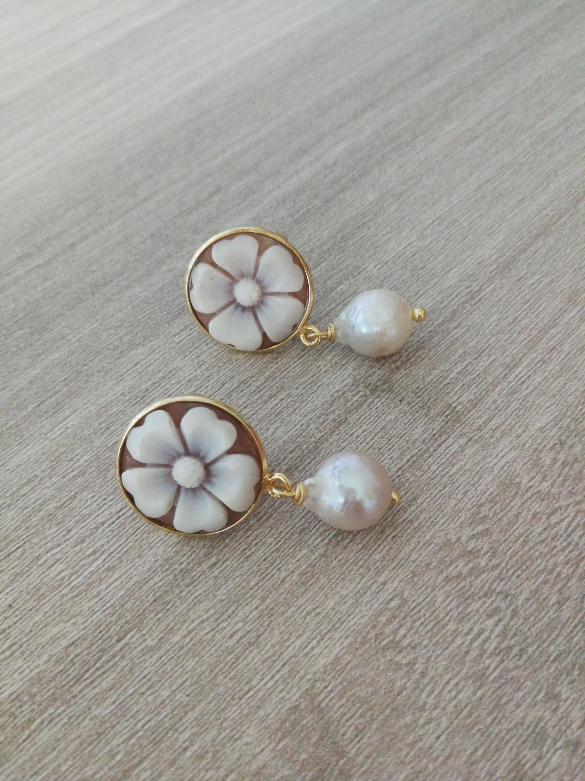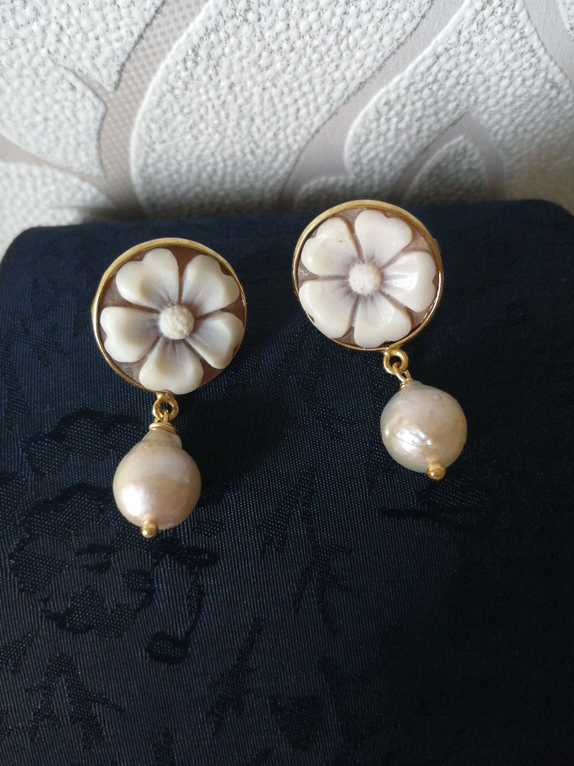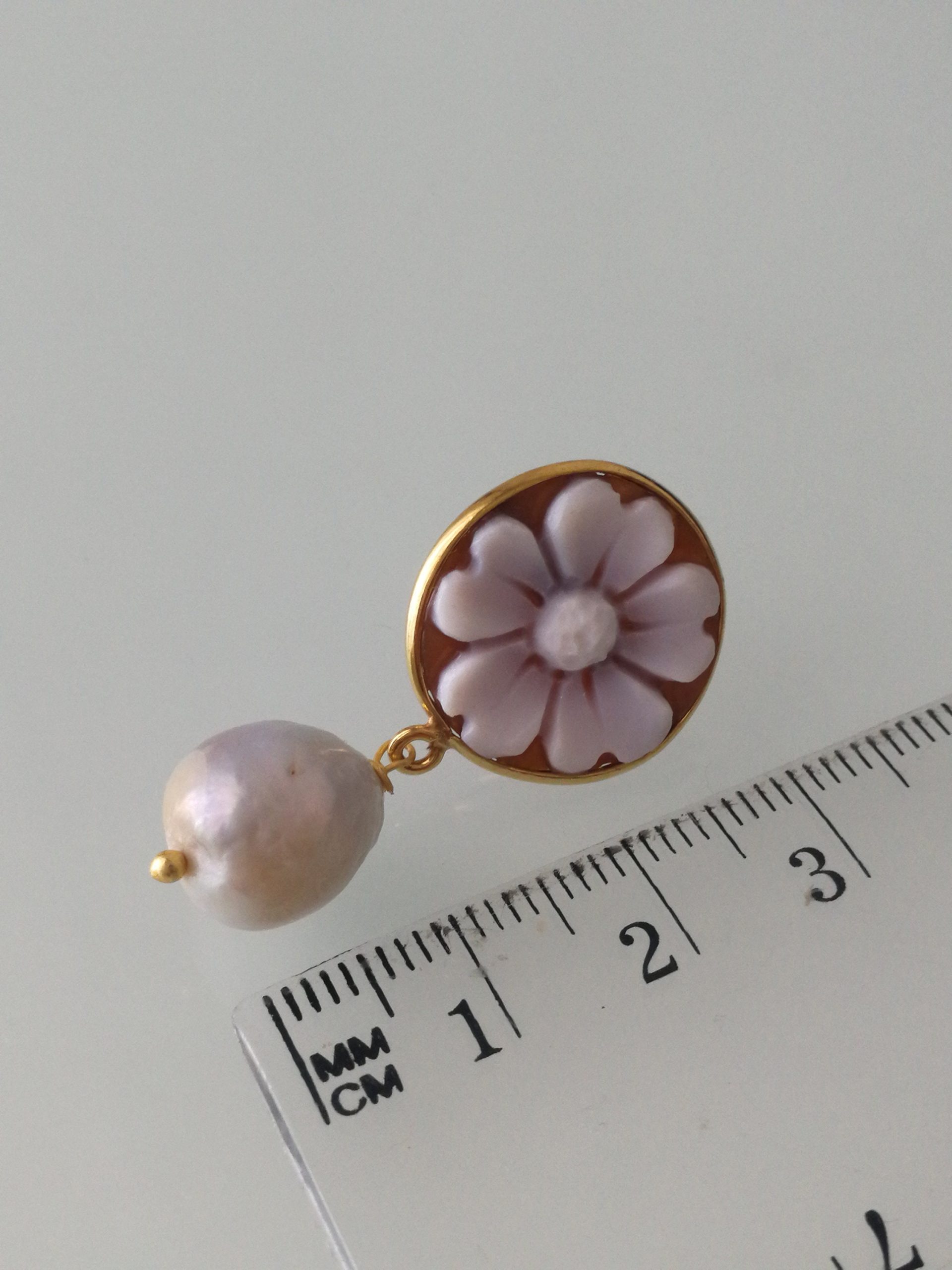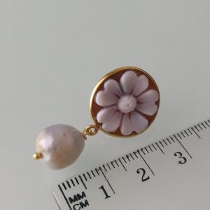 Orecchini a perno con cammeo conchiglia originale che raffigura fiore, cornice in argento placcata oro a lavorazione artigianale, perla naturale barocca bianca finale. Misura cammeo 15 mm. Misura lunghezza orecchini 3 cm.Cammeo perfetto.
