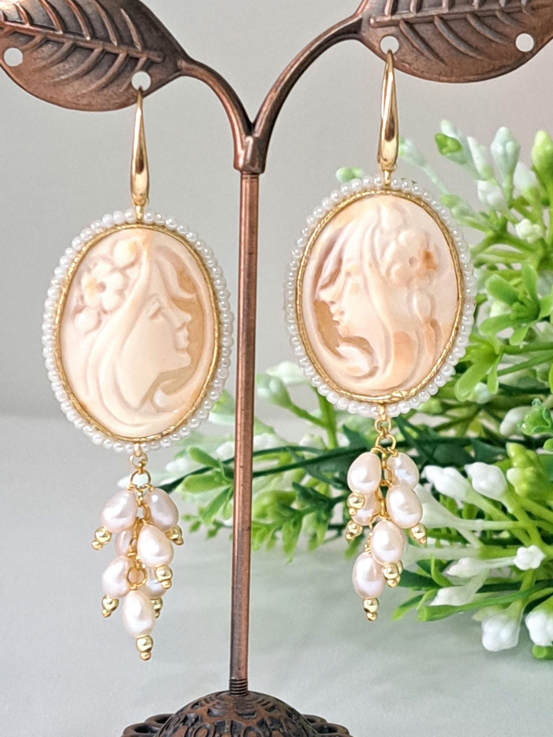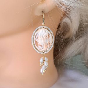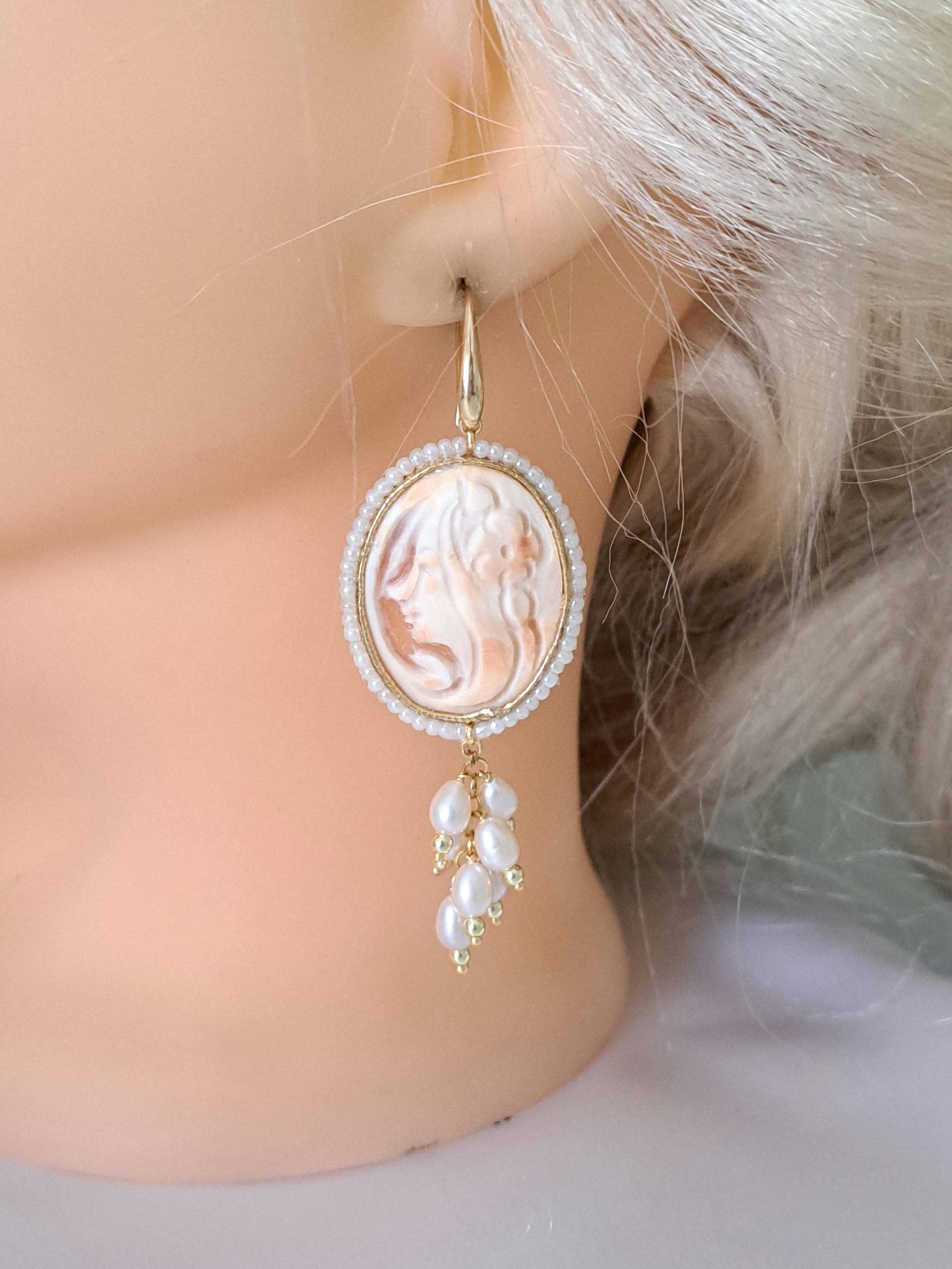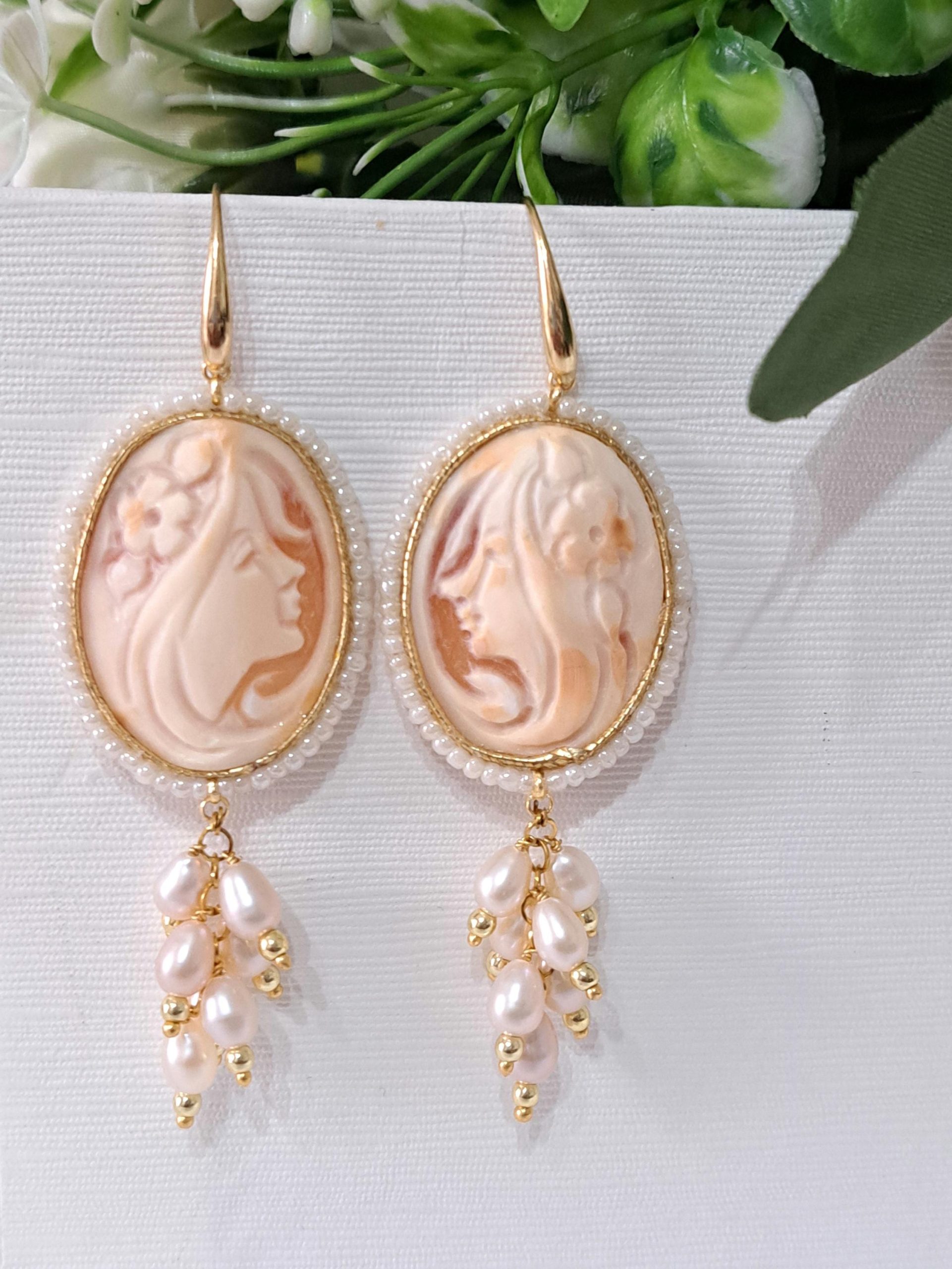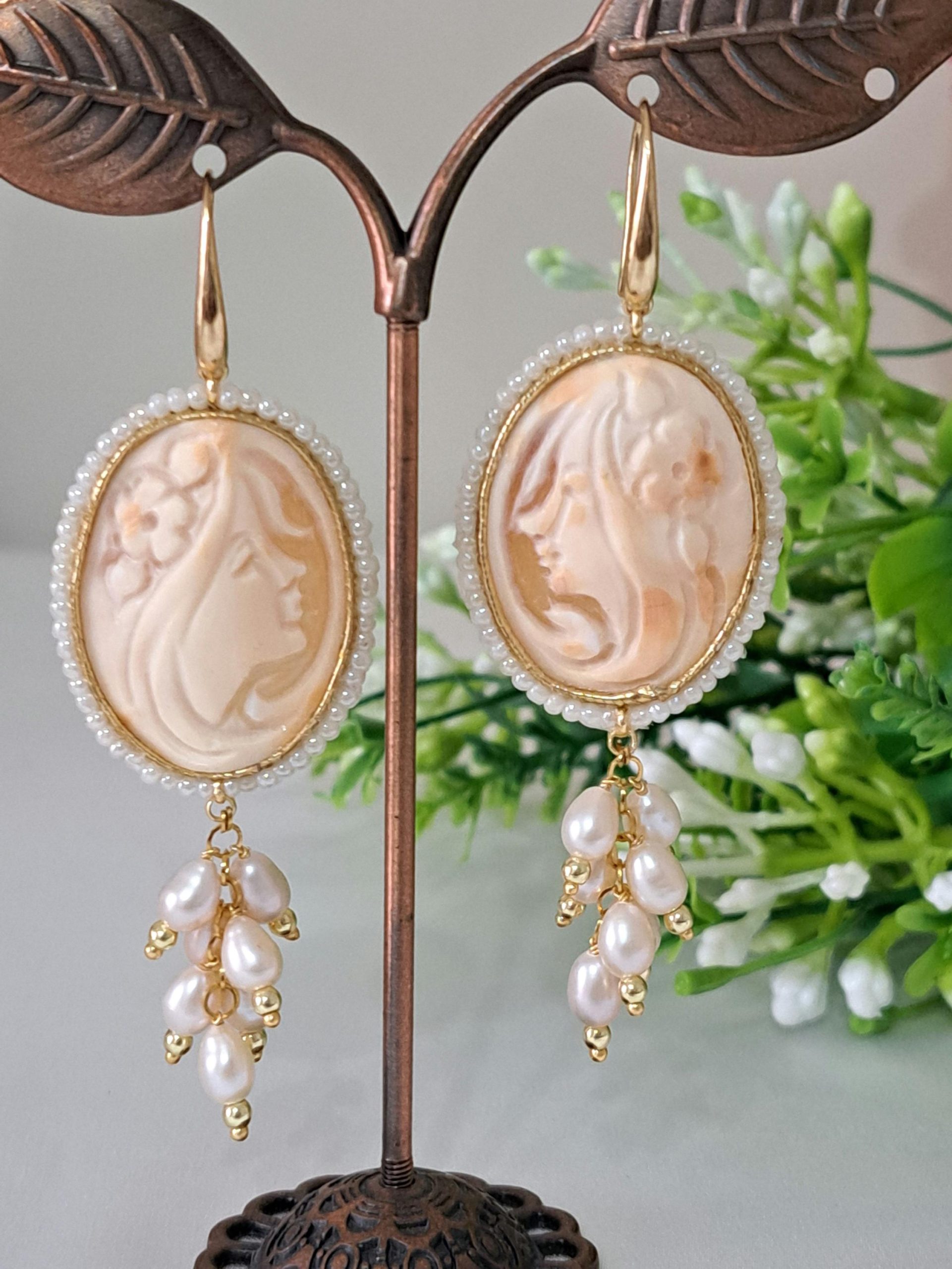 Orecchini cammeo conchiglia sardonica con grappolo perle bianche , gioielli italiani