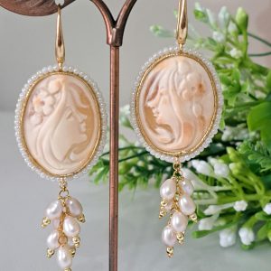 Orecchini pendenti con cammeo autentico in conchiglia sardonica , realizzati a mano a Torre del greco raffigurante volto di donna, con cornice perline bianche naturali 3,5×2,8 cm dimensioni , grappolo perle naturali bianche, chiusura a monachelle in ottone dorato anallergico.