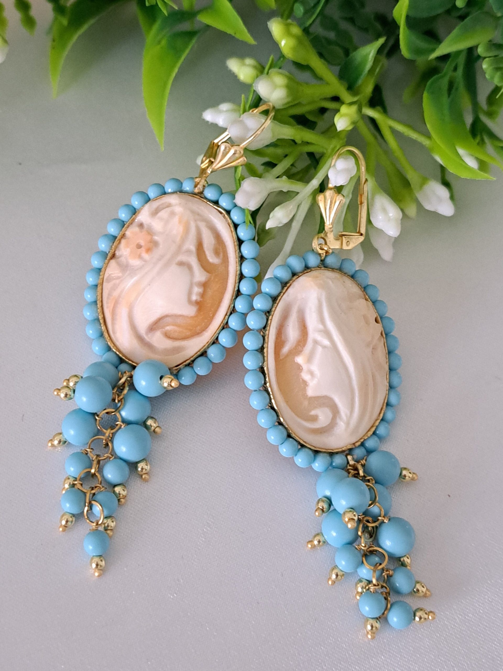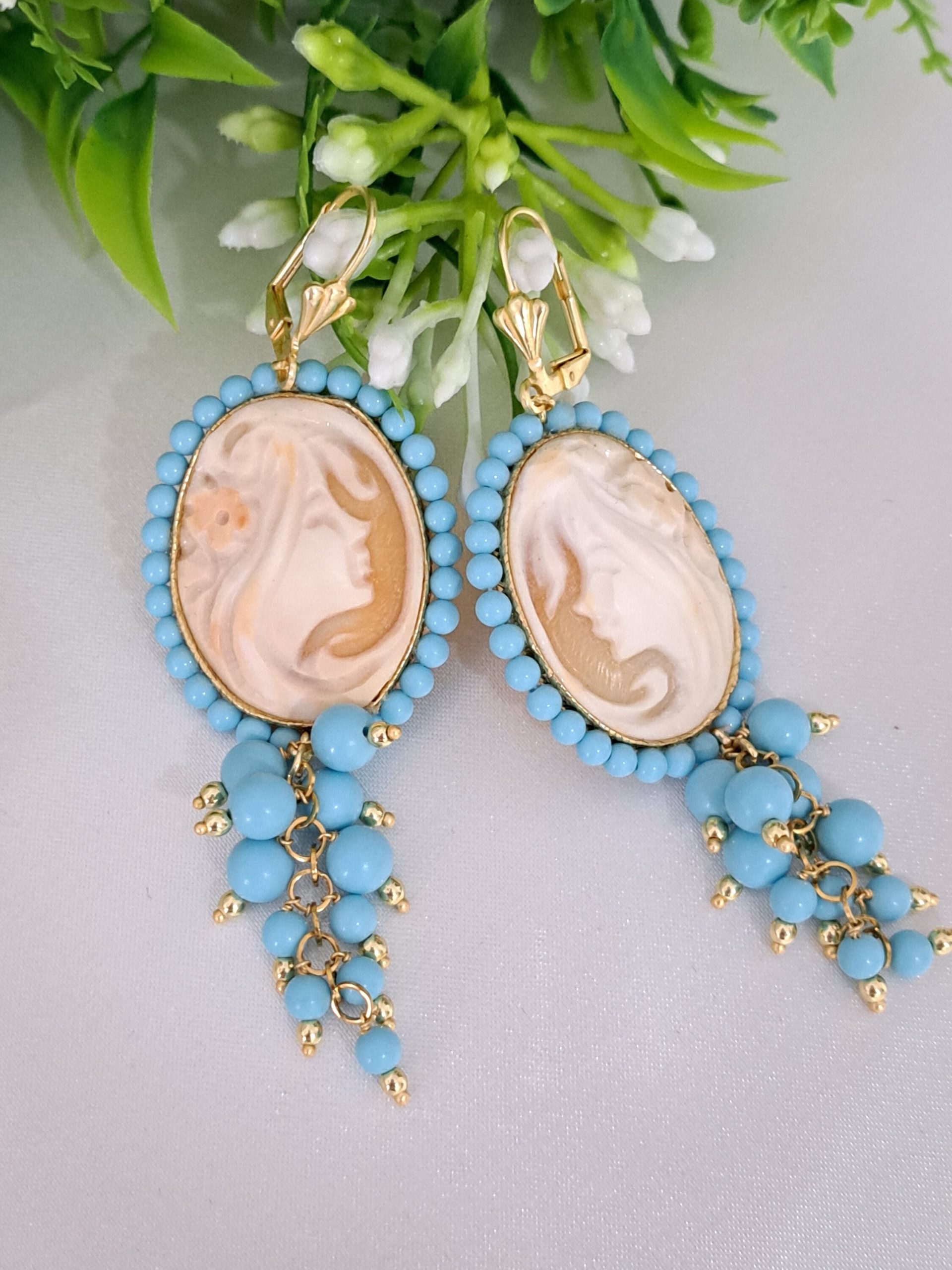 Orecchini cammeo conchiglia sardonica con grappolo perle turchese , gioielli italiani