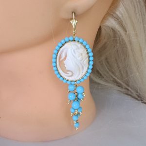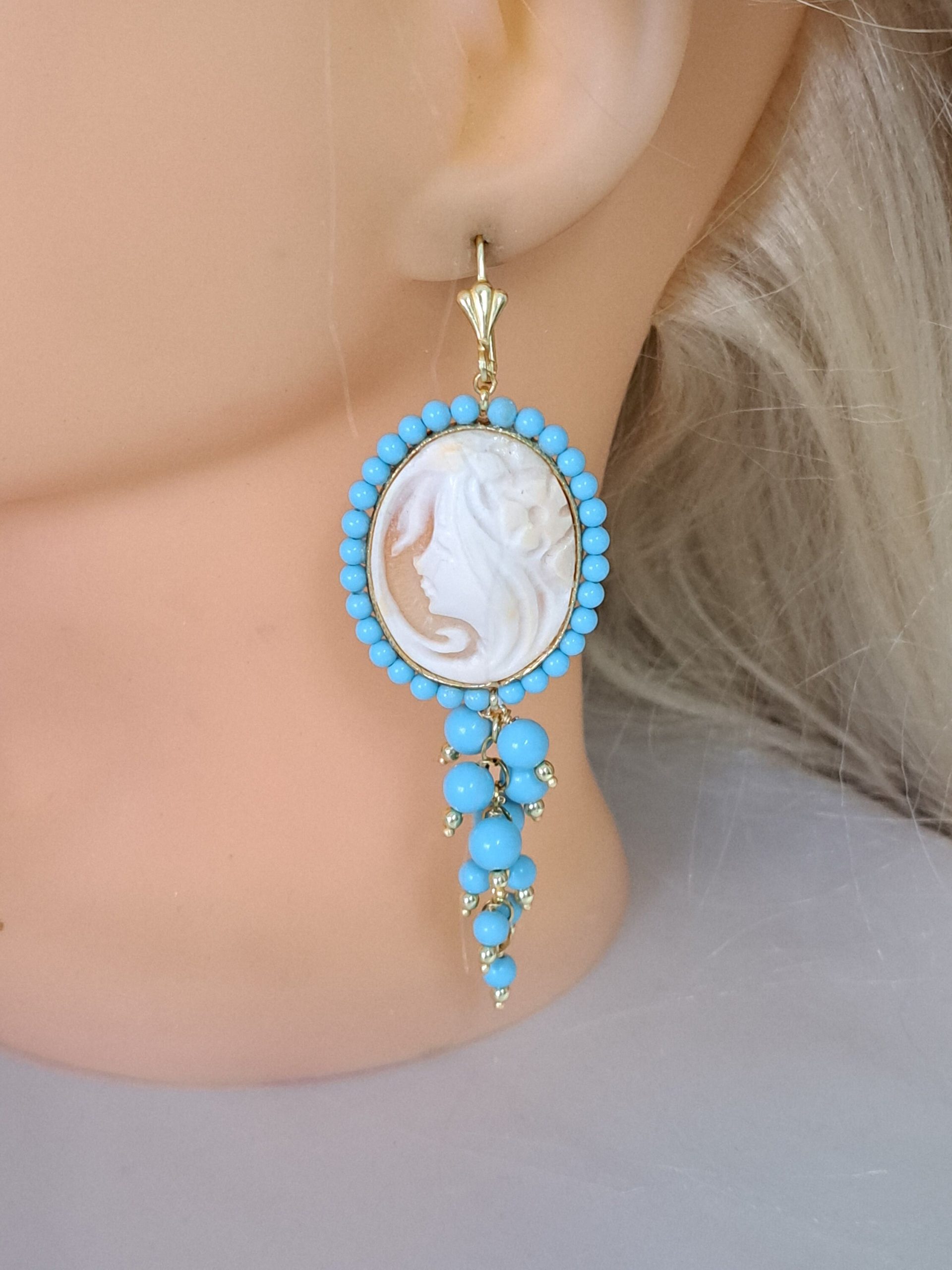 Orecchini pendenti con cammeo autentico in conchiglia sardonica scolpiti a mano a Torre del greco raffigurante volto di donna, 4×3 cm dimensioni con cornice e grappolo perle pasta di turchese imitazione.