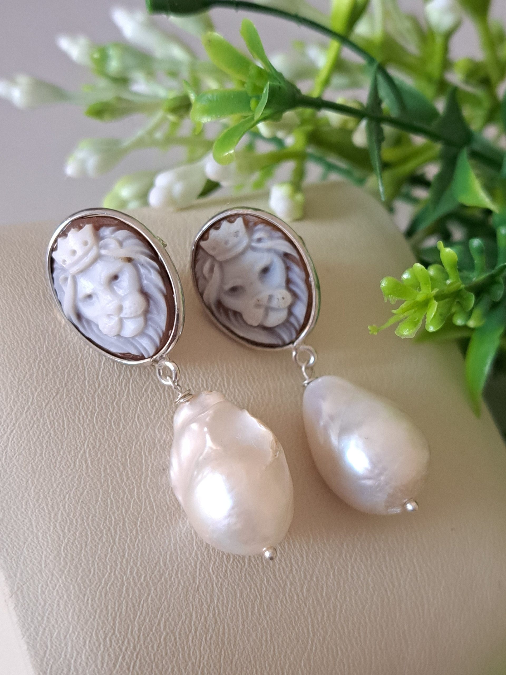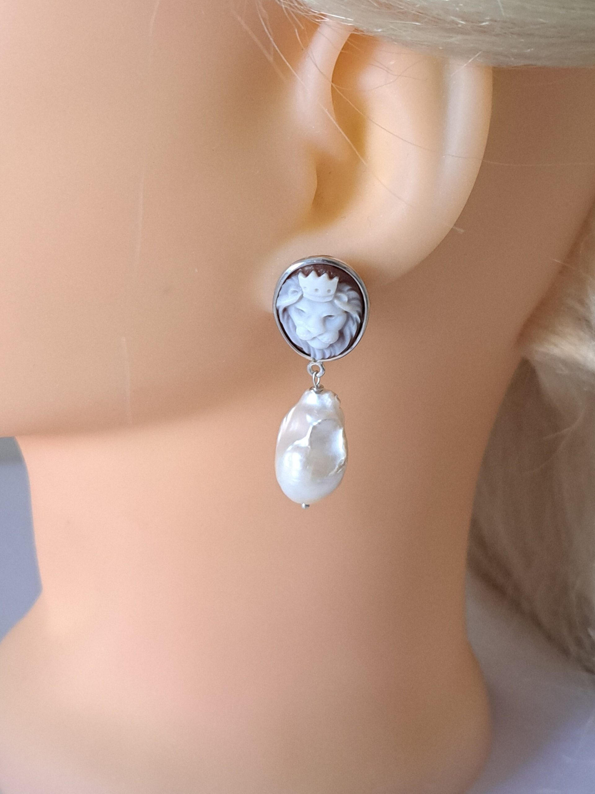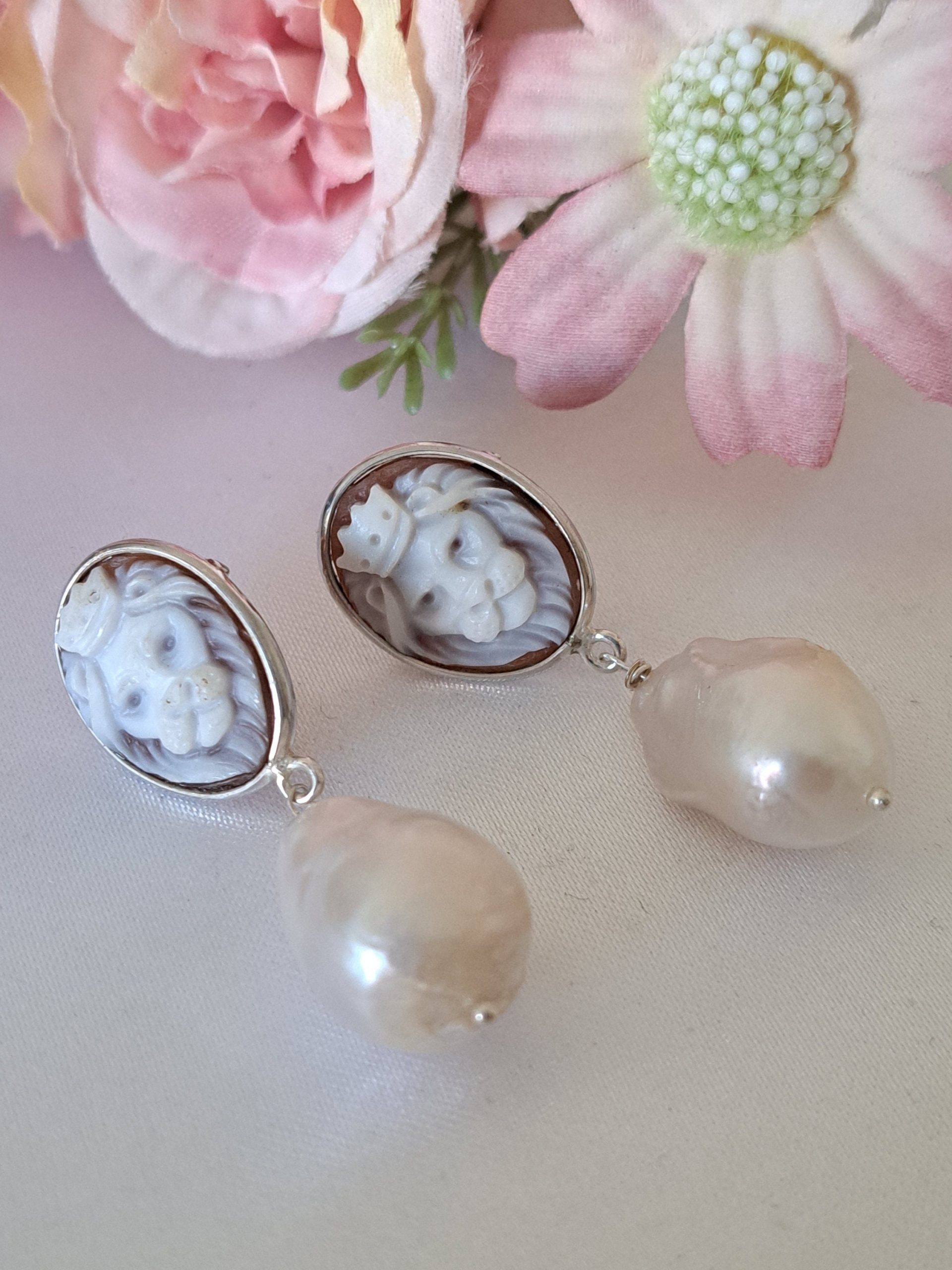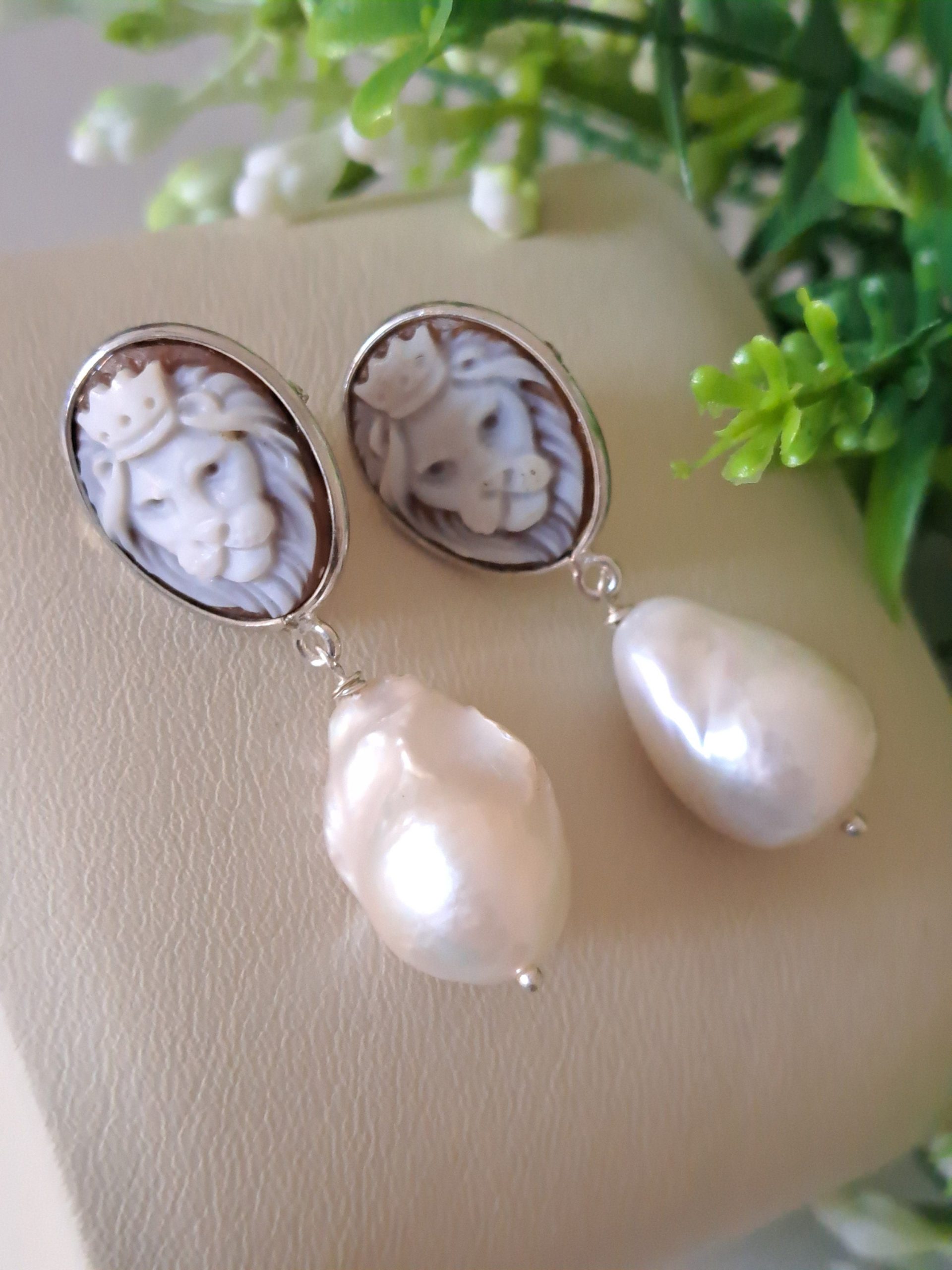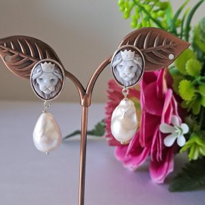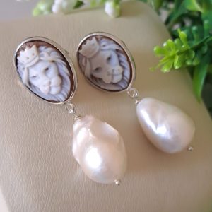 Orecchini artigianali in argento 925 con cammeo autentico raffigurante teste di leone in conchiglia sardonica incise a mano a Torre del greco, 1,8×1,4 cm dimensioni e perle bianche barocche , chiusura a perno con farfallina.