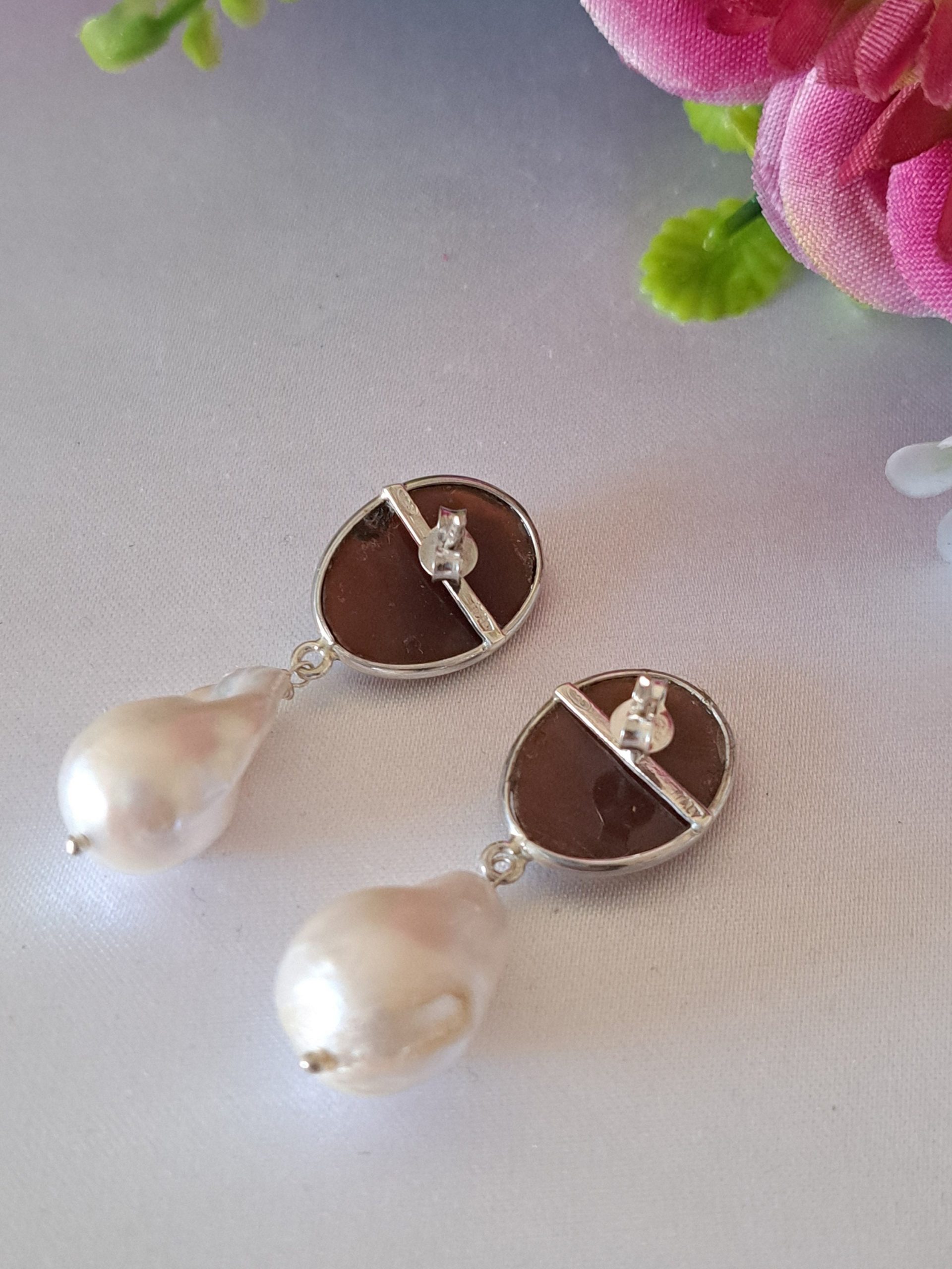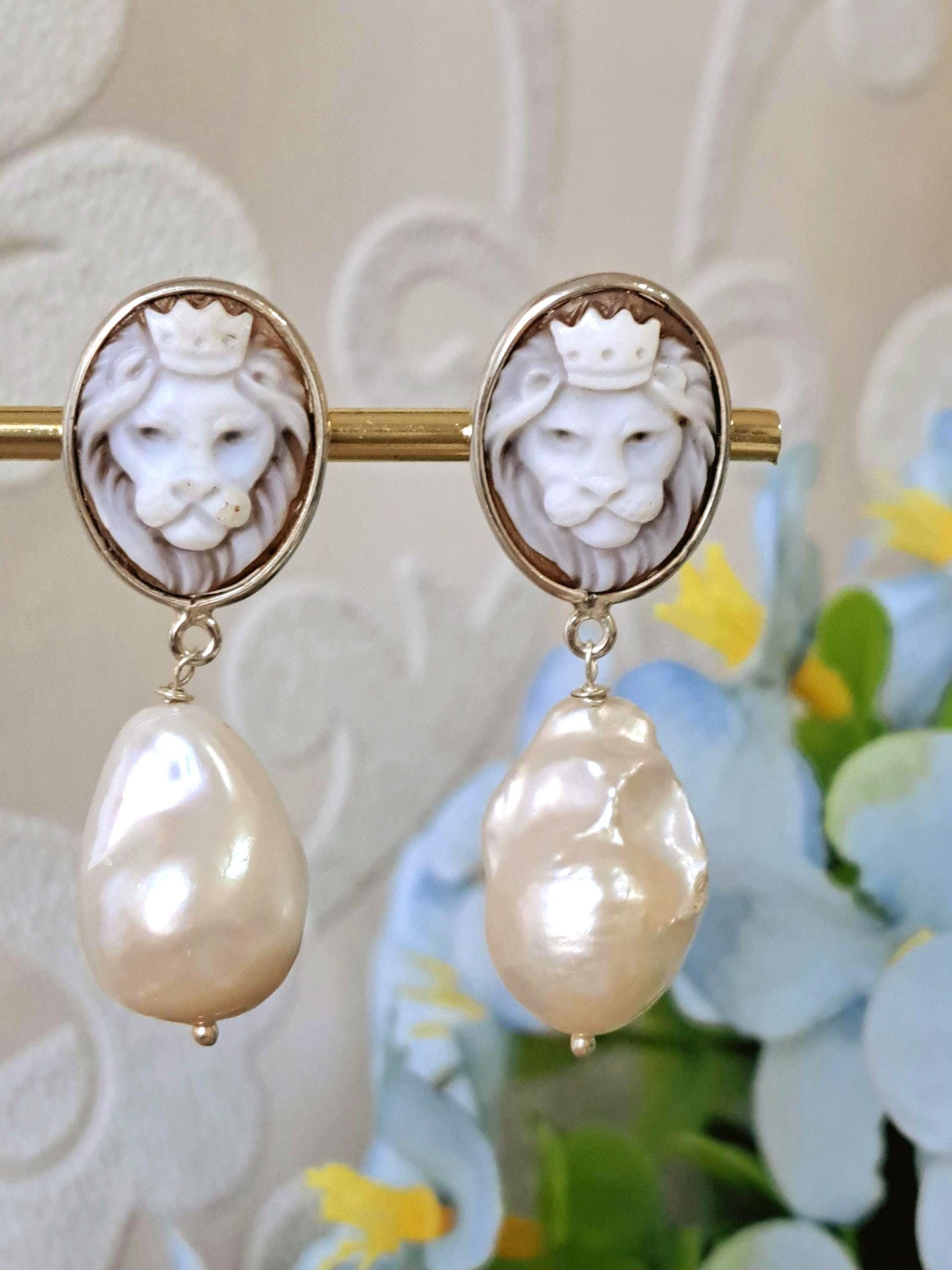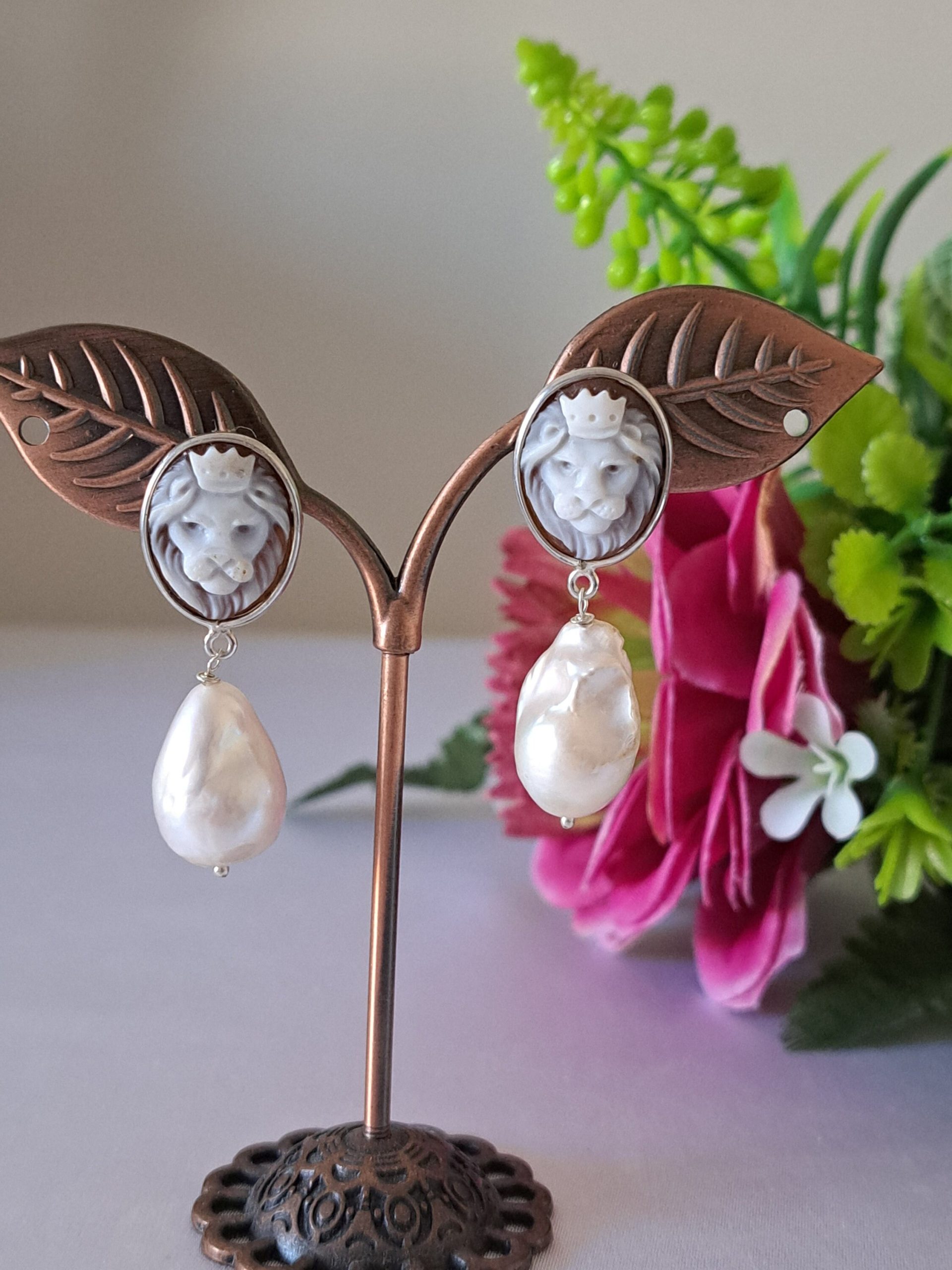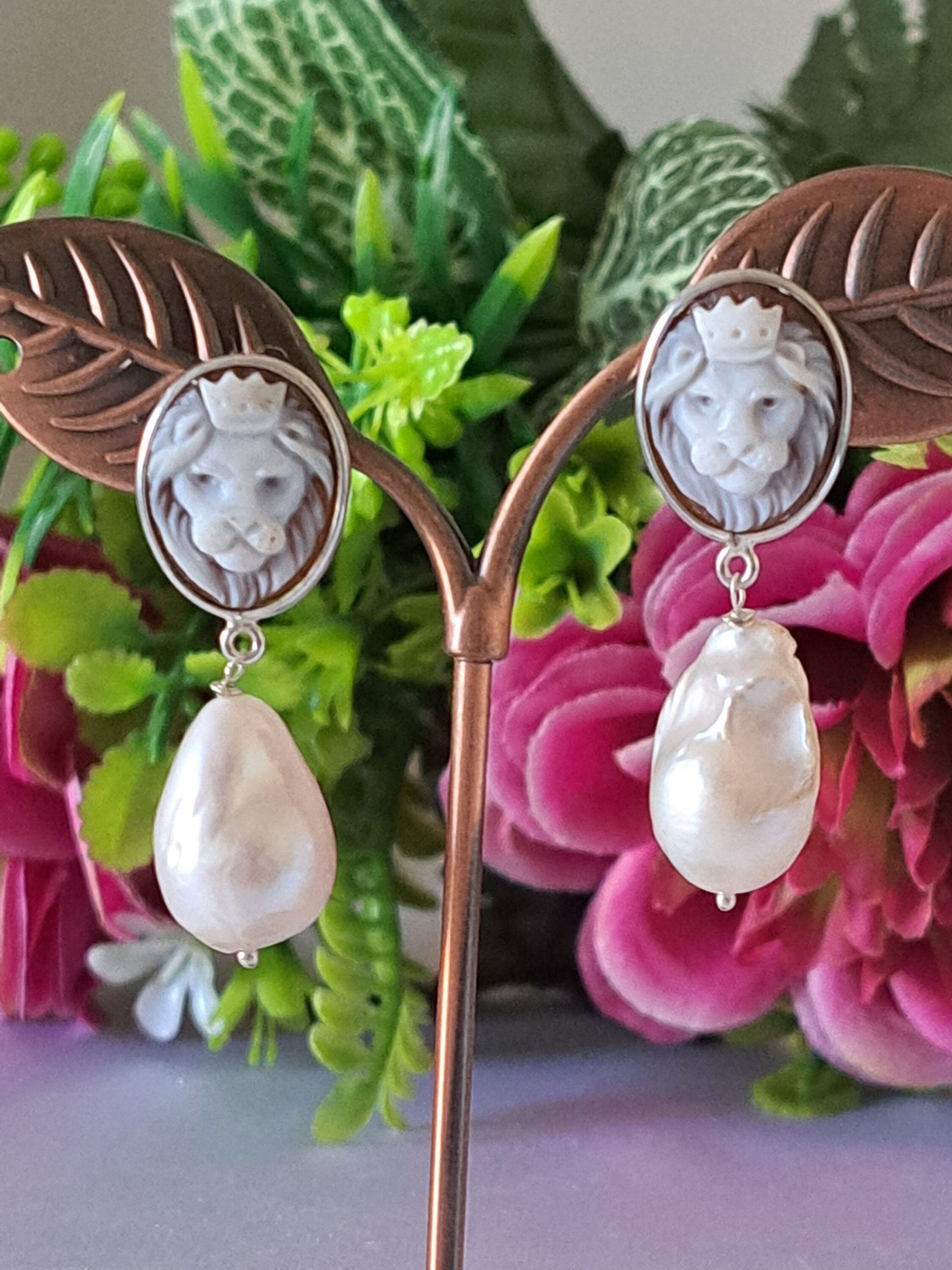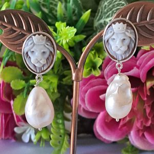 Orecchini artigianali in argento 925 con cammeo autentico raffigurante teste di leone in conchiglia sardonica incise a mano a Torre del greco, 1,8×1,4 cm dimensioni e perle bianche barocche , chiusura a perno con farfallina.