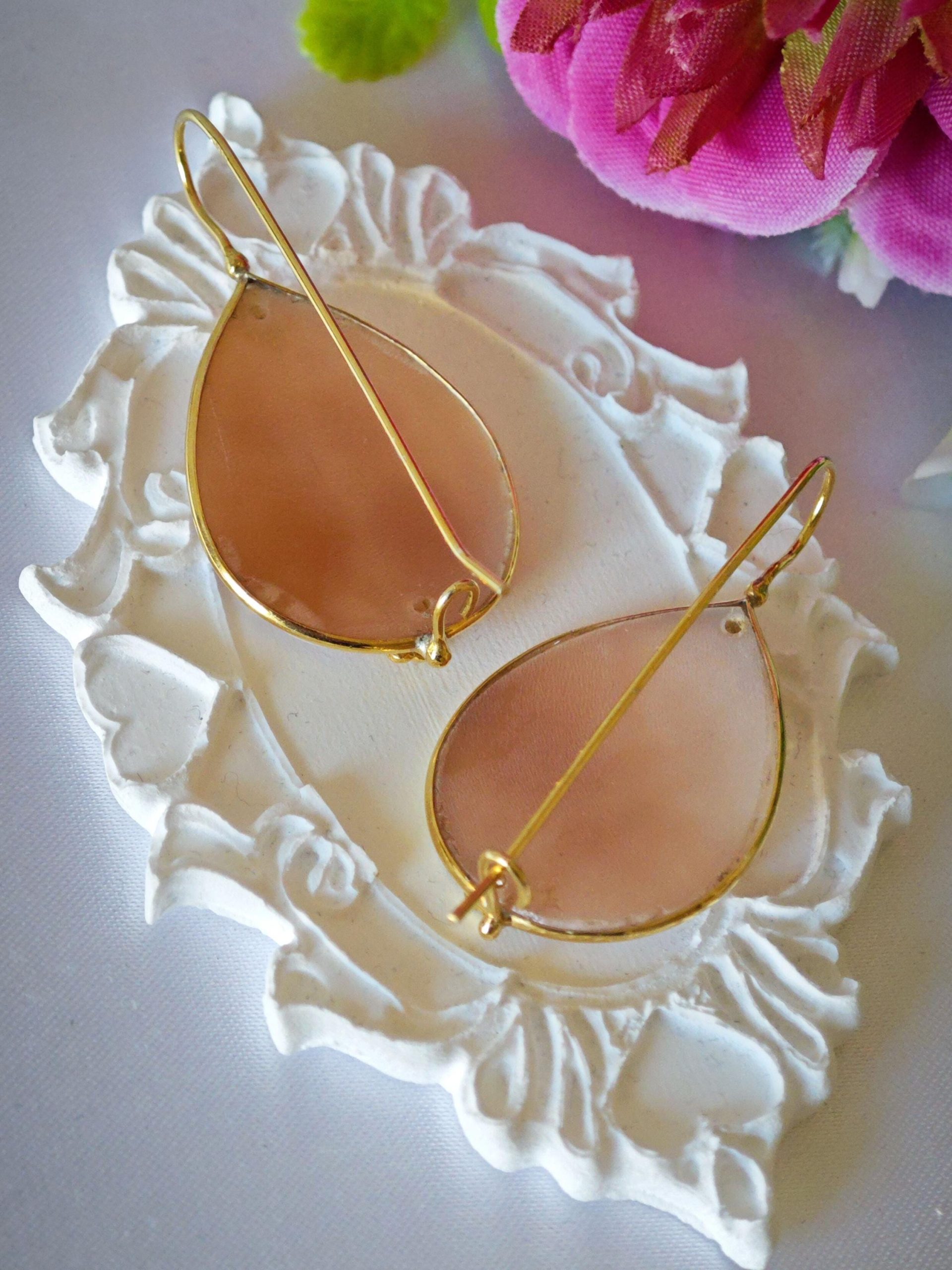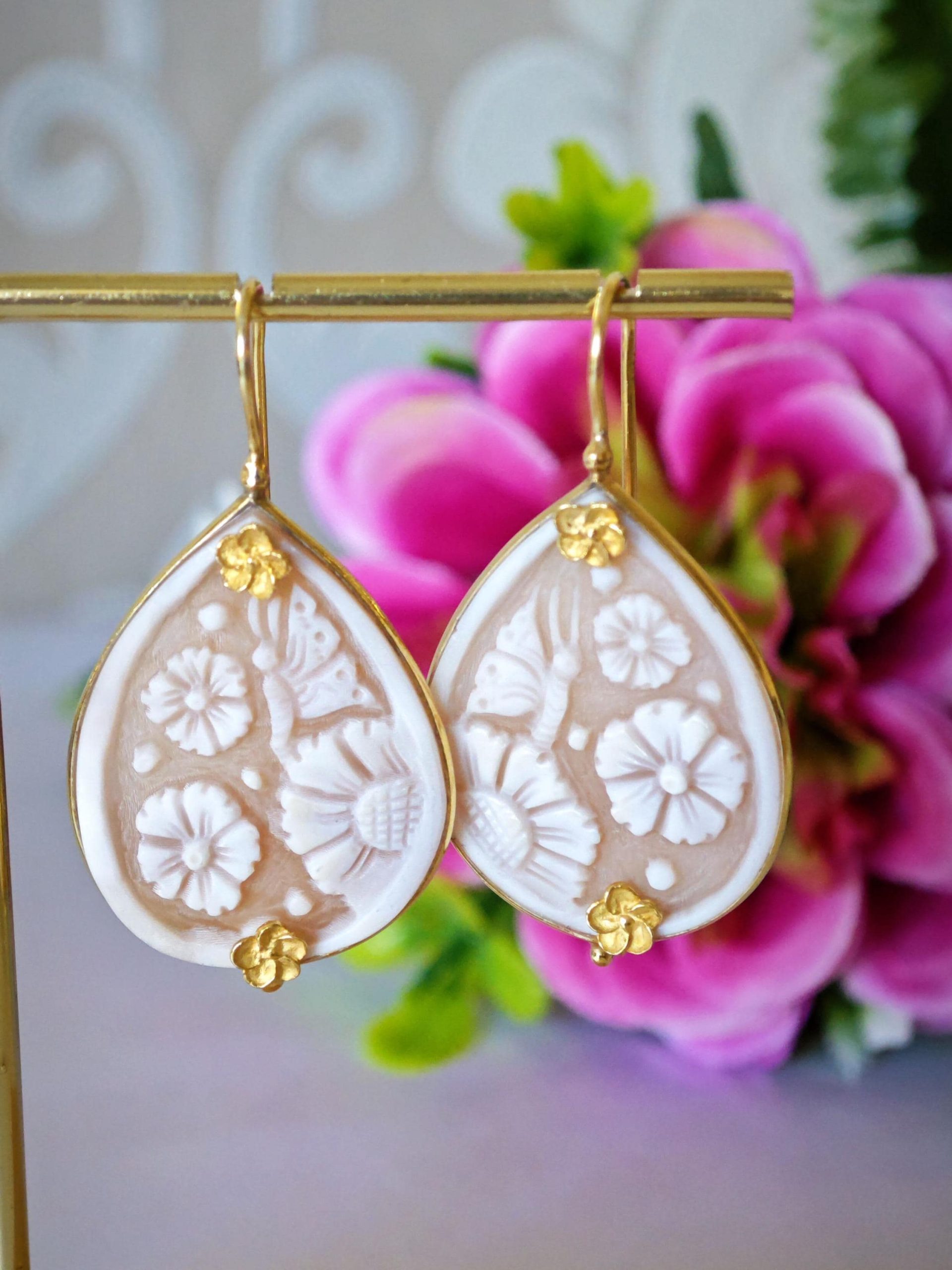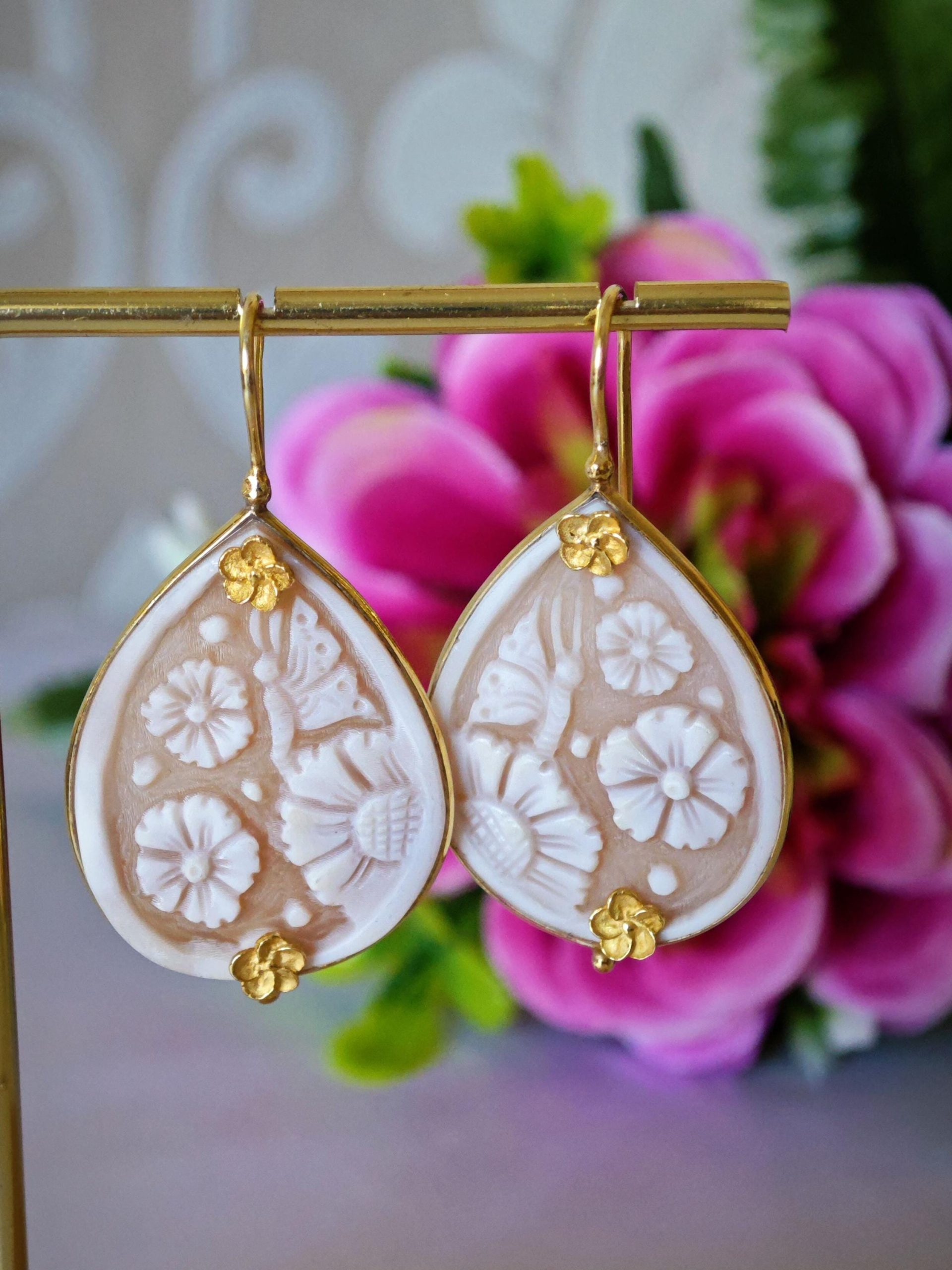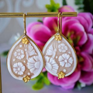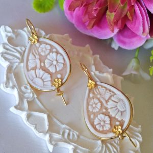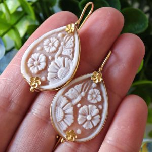 Orecchini pendenti artigianali con cornice in argento 925 placcato con cammeo autentico in conchiglia sardonica scolpiti a mano a Torre del greco, raffigurante fiori, 3×2,3 cm dimensioni , chiusura a monachelle chiuse con gancetto dietro in argento 925 placcato oro.