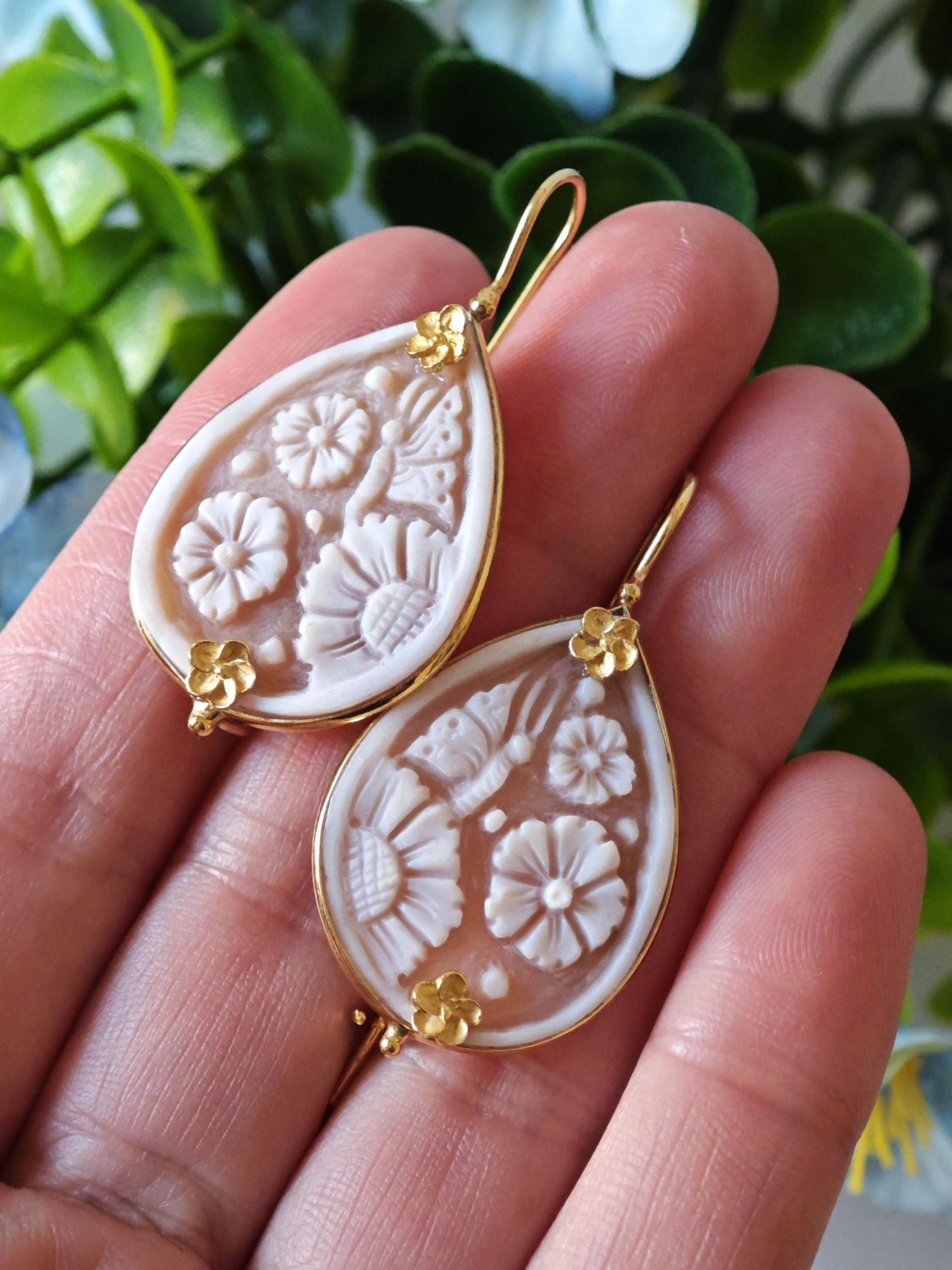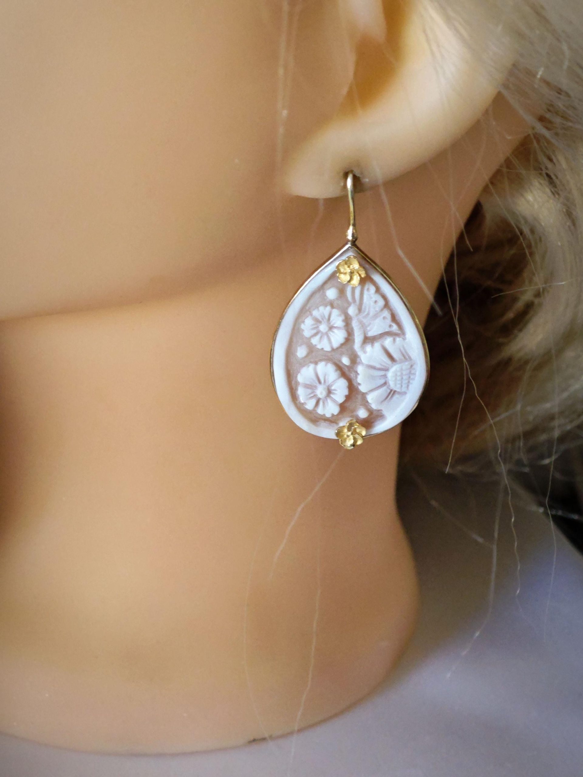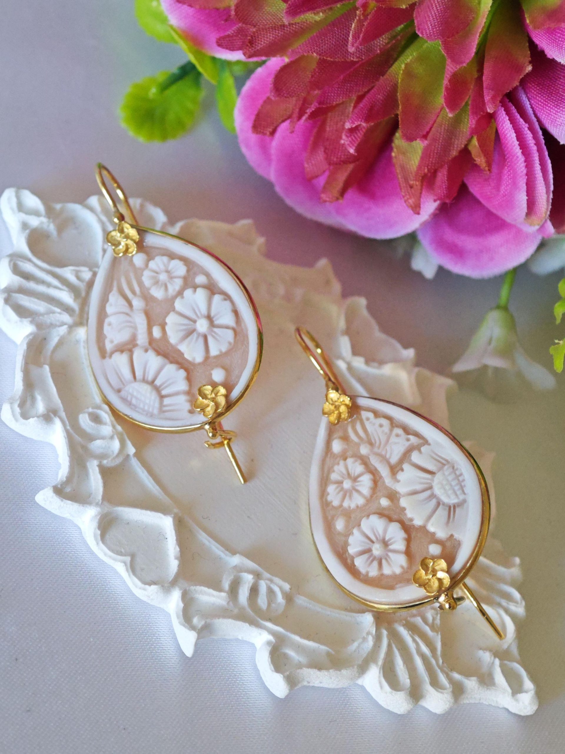 Orecchini cammeo conchiglia sardonica e fiori argento 925 placcato oro , gioielli italiani