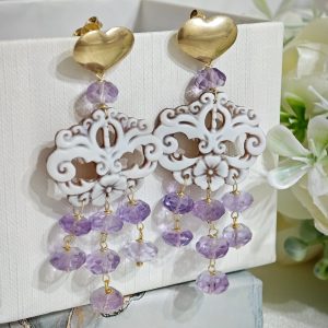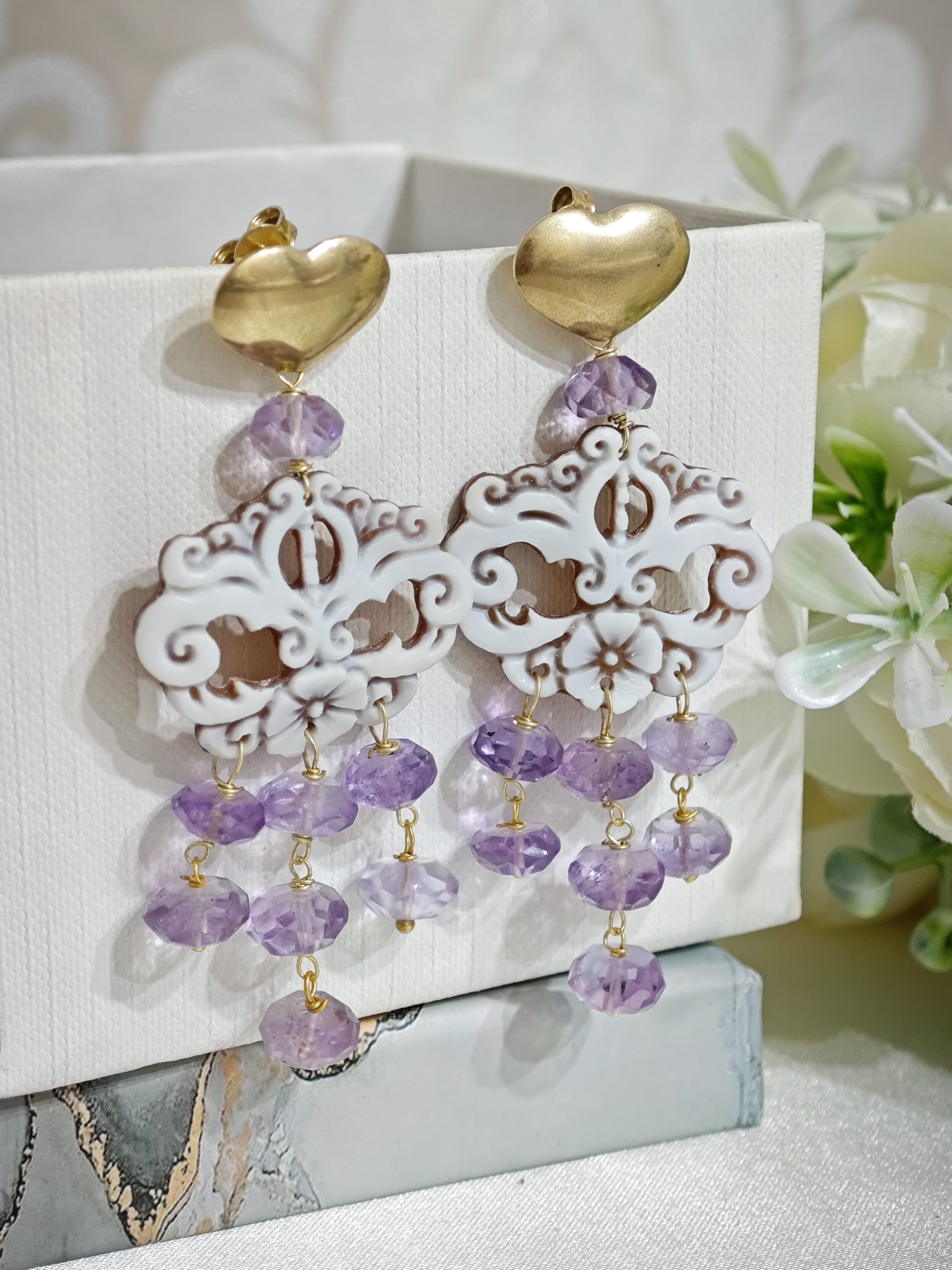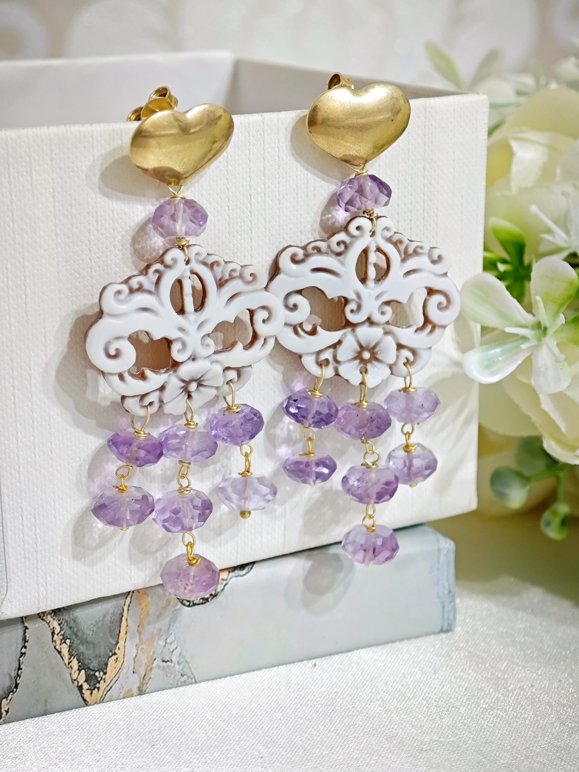 Orecchini pendenti maxi con cammeo in conchiglia sardonica scolpita a mano a Torre del greco raffigurante fiori , 3x 2,5 cm dimensioni con pietre dure ametista a rondella .