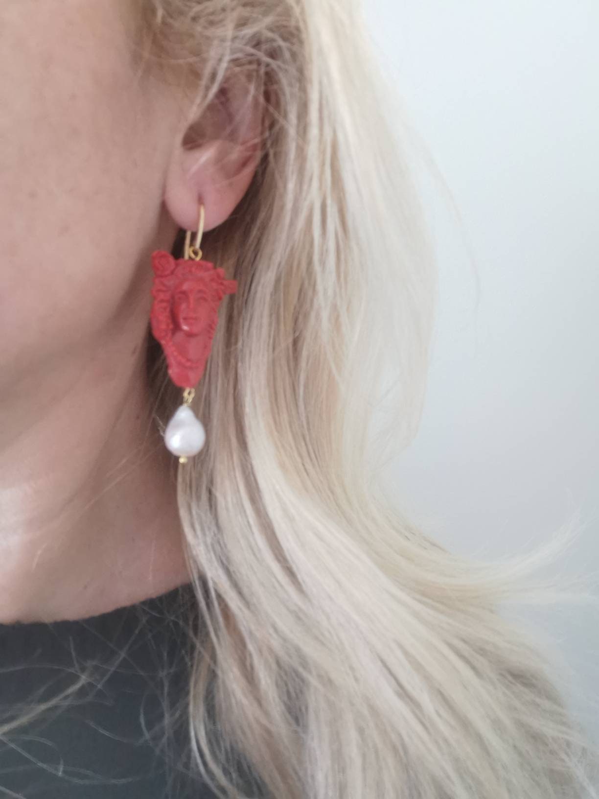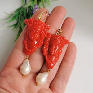 Orecchini pendenti con cammeo in pasta di corallo realizzato a mano a Torre del greco raffigurante volto di donna 3,5×2,5 cm dimensioni, perle bianche barocche , chiusura a monachelle in argento 925 placcato oro .