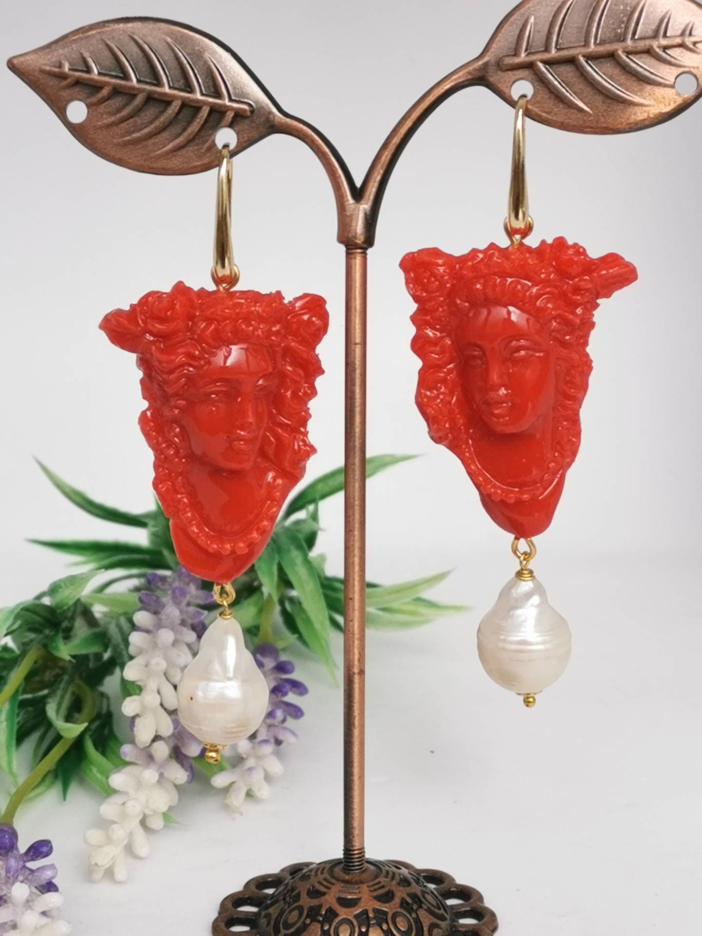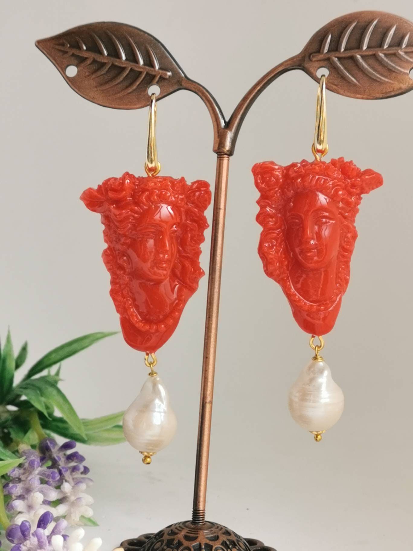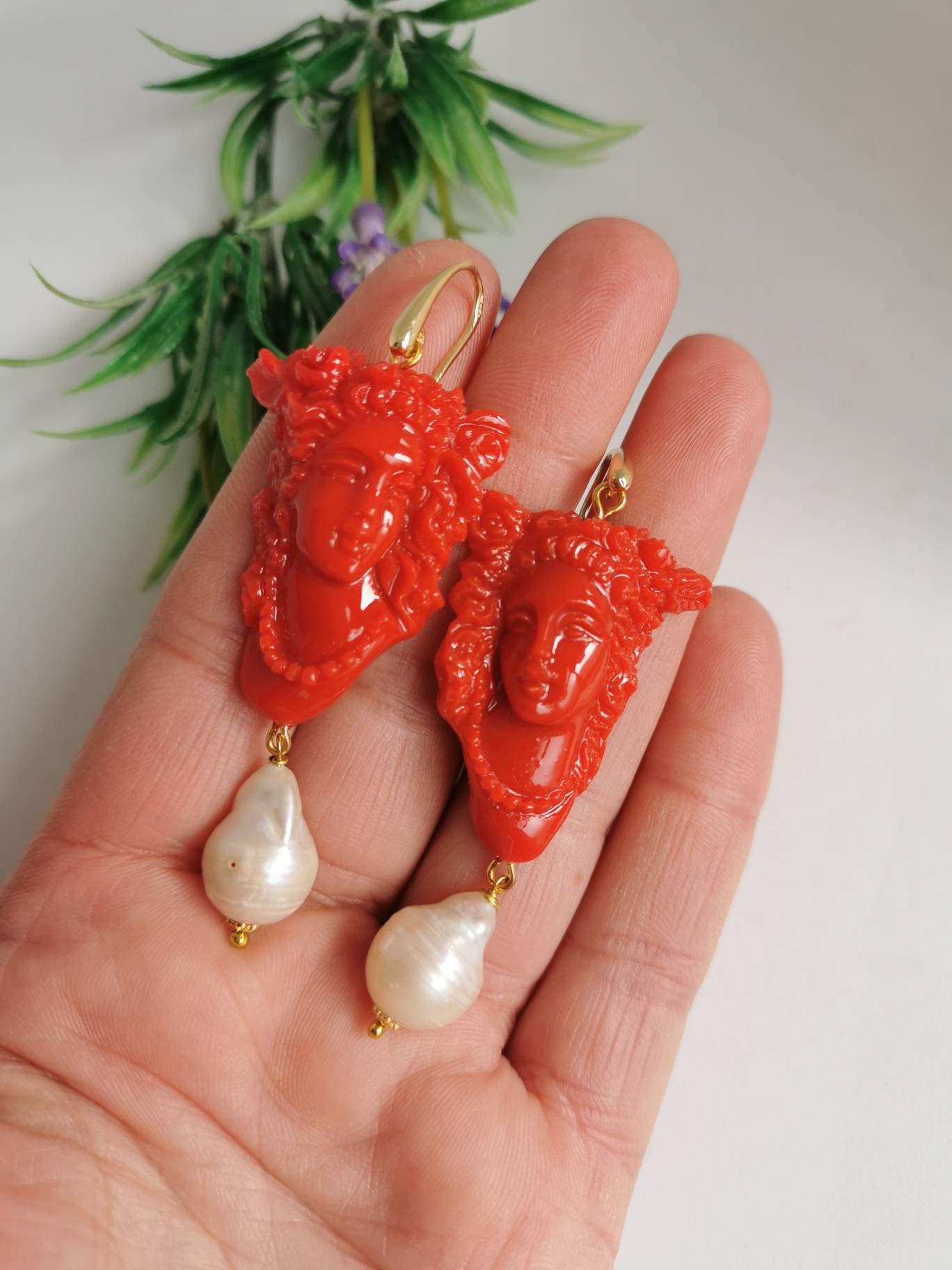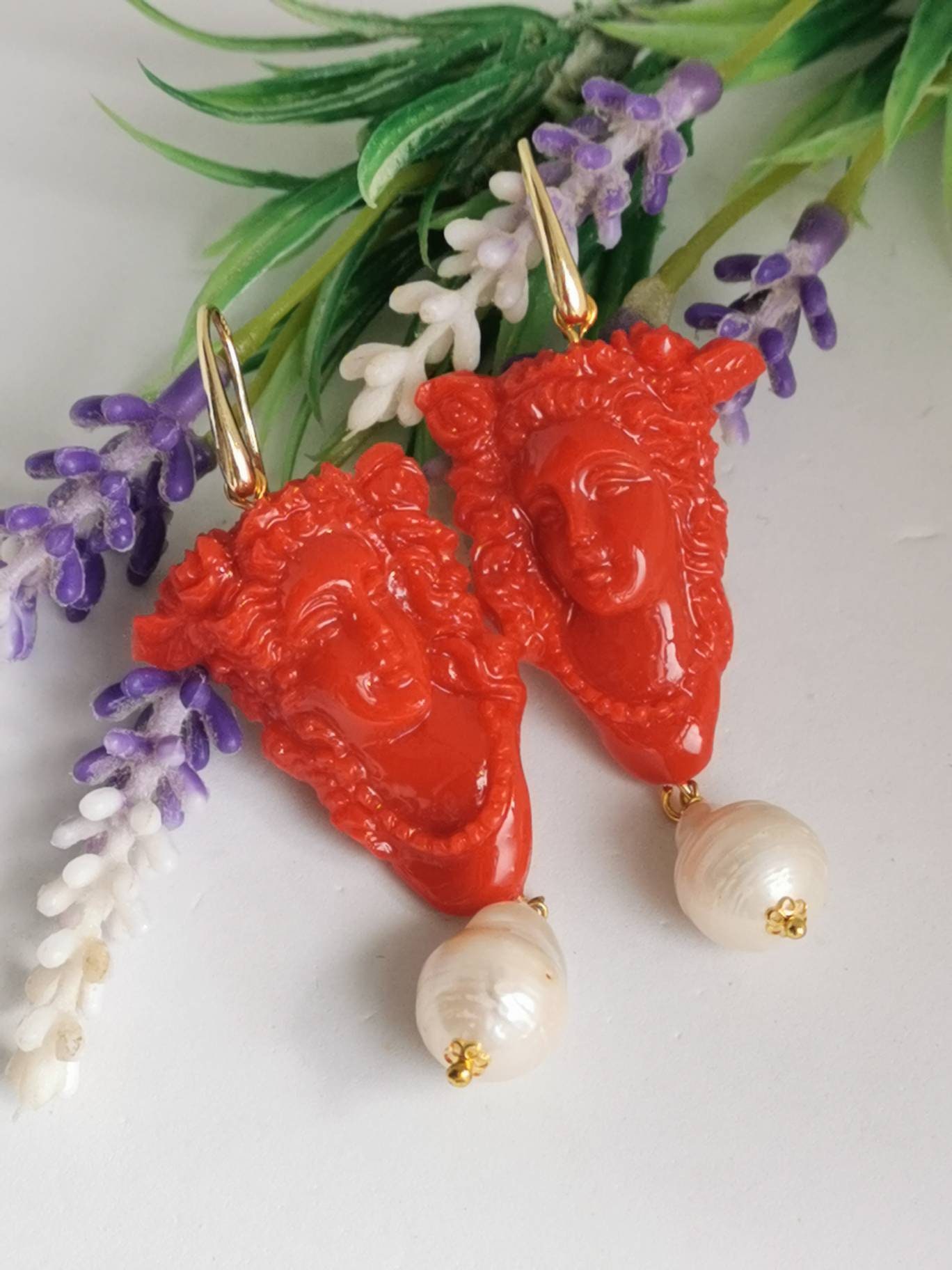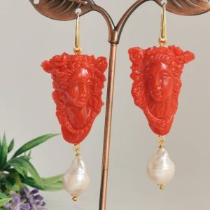Orecchini cammeo corallo e perle bianche barocche , orecchini argento 925 , gioielli italiani