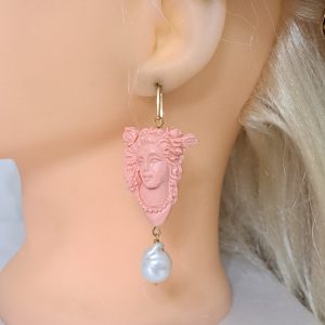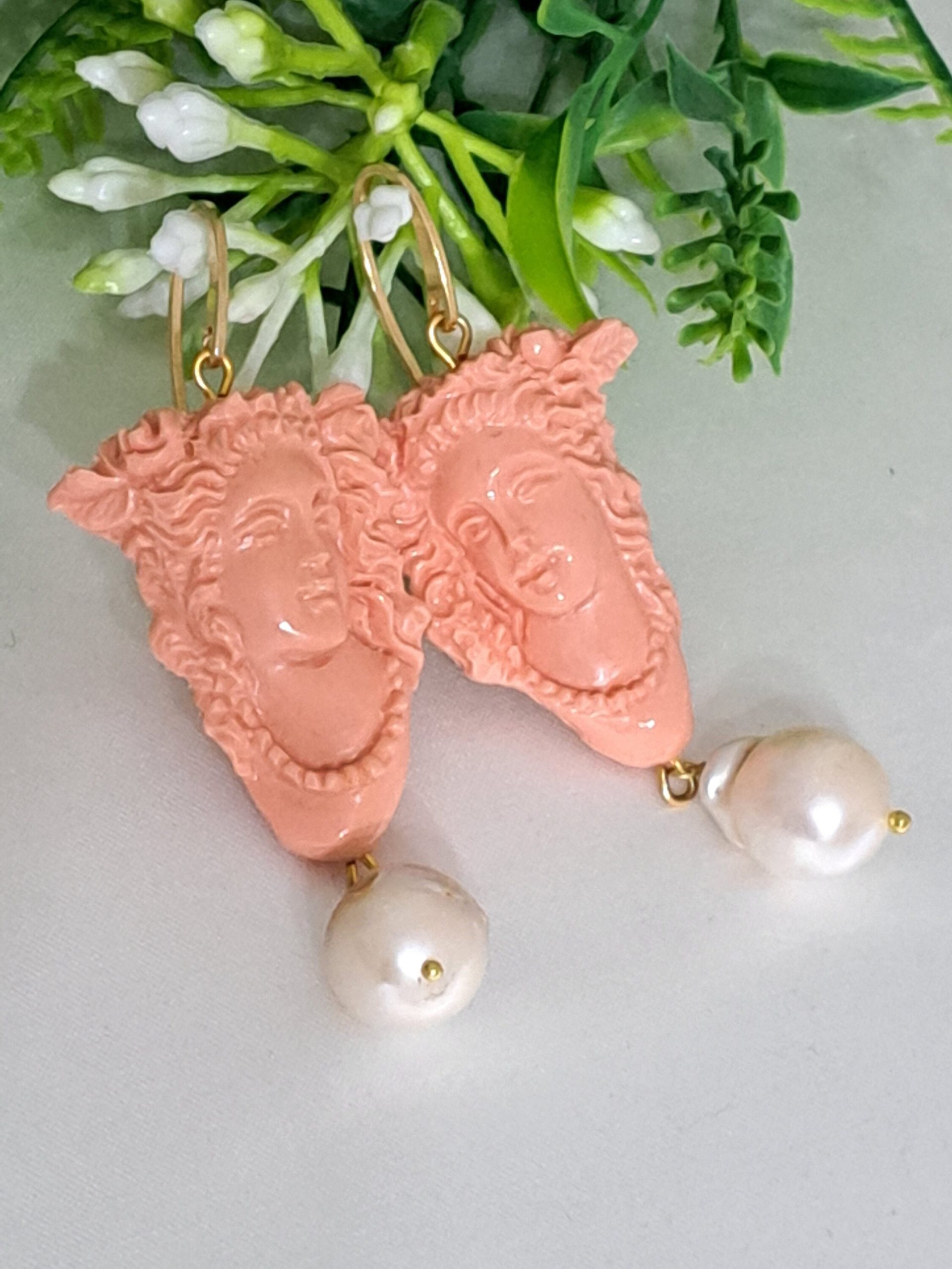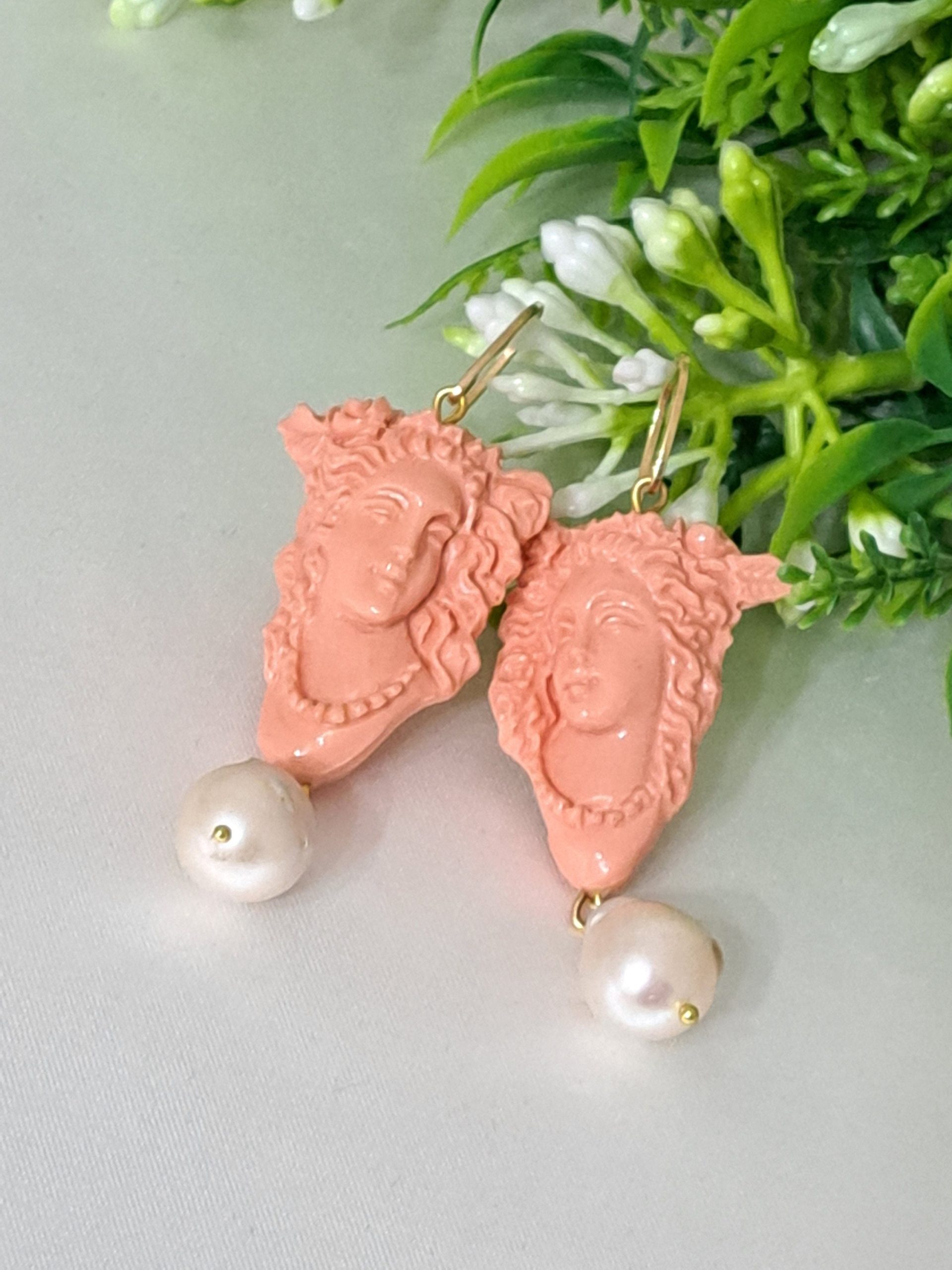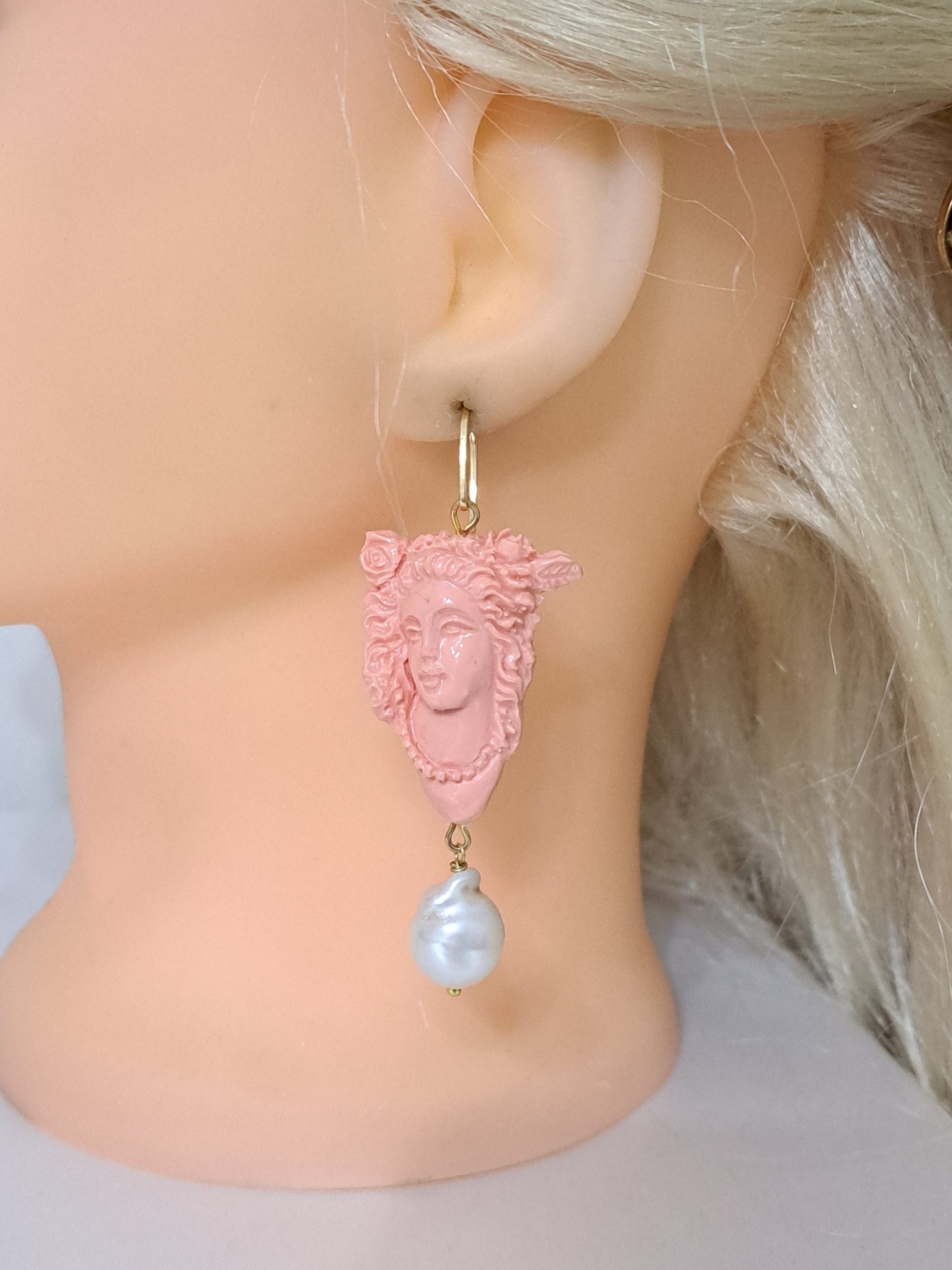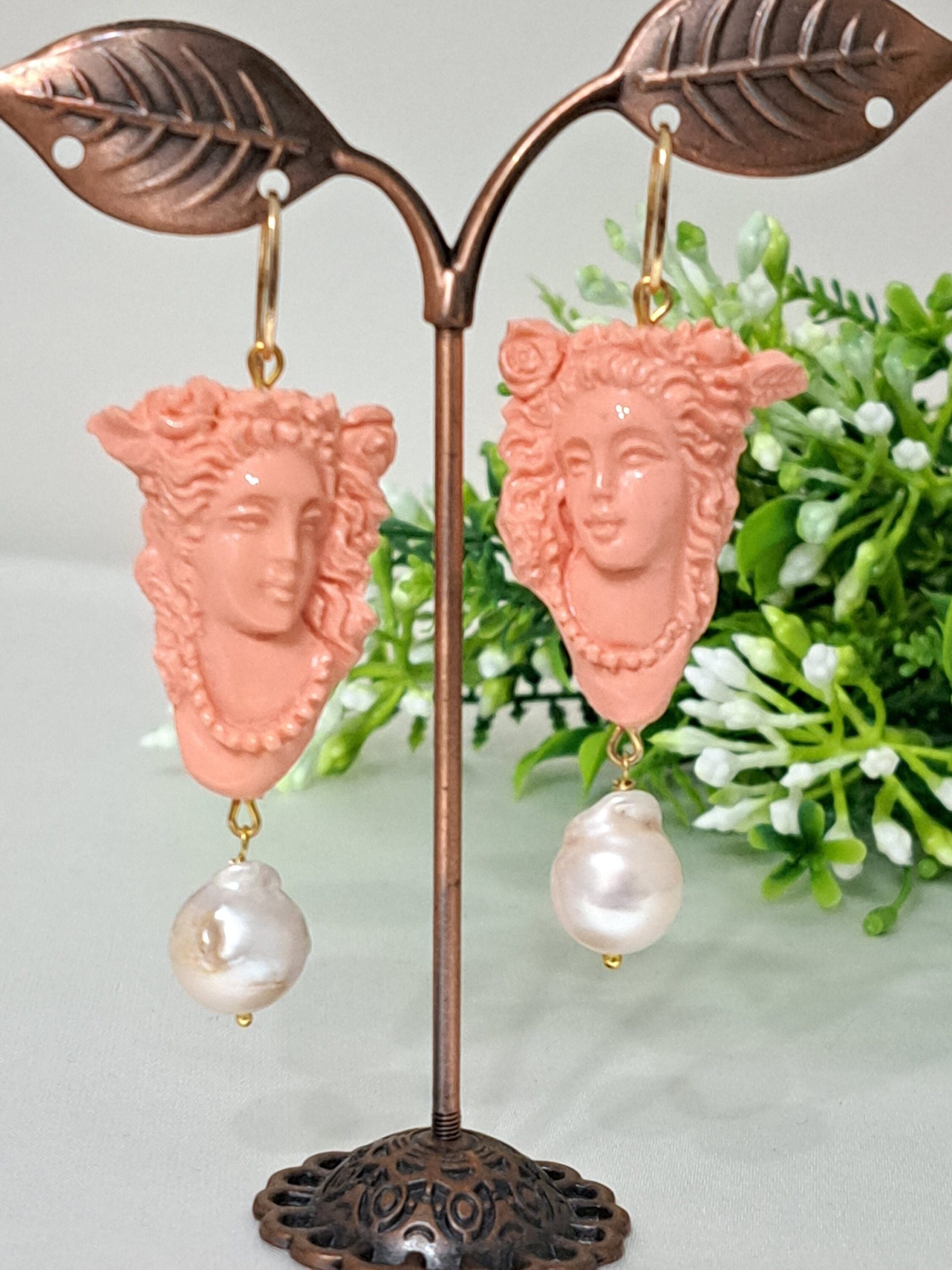 Orecchini pendenti con cammeo in pasta di corallo rosa realizzato a mano a Torre del greco raffigurante volto di donna 3,5×2,5 cm dimensioni, perle bianche barocche goccia , chiusura a monachelle in argento 925.