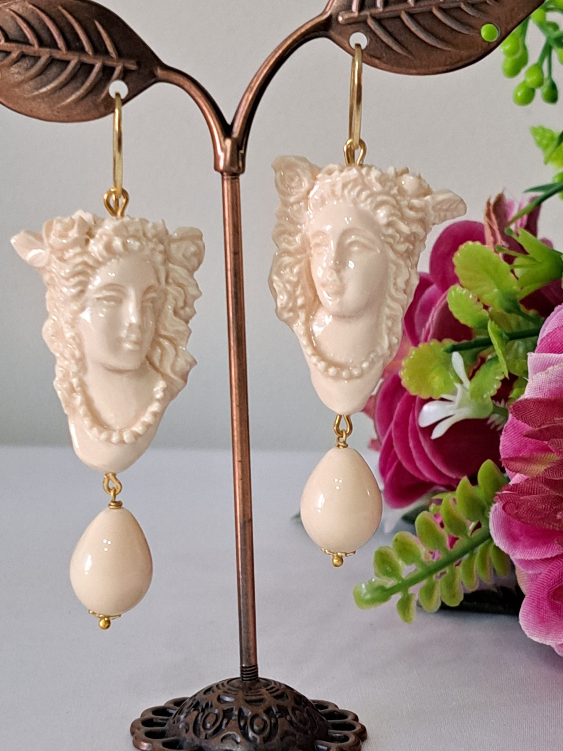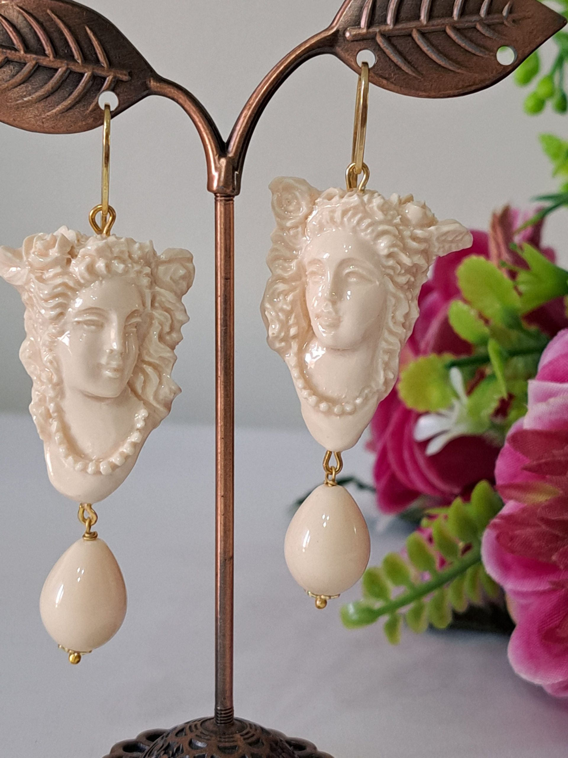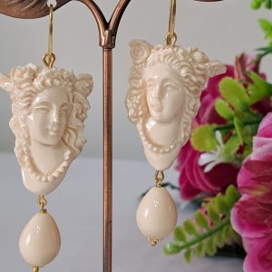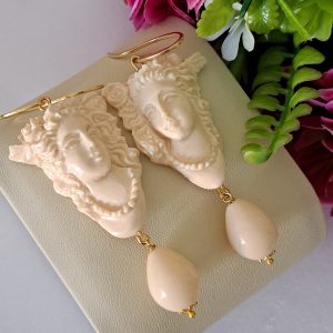 Orecchini pendenti con cammeo in pasta di avorio imitazione realizzato a mano a Torre del greco raffigurante volto di donna 3,5×2,5 cm dimensioni, gocce imitazione avorio, chiusura a monachelle in argento 925 placcato oro .