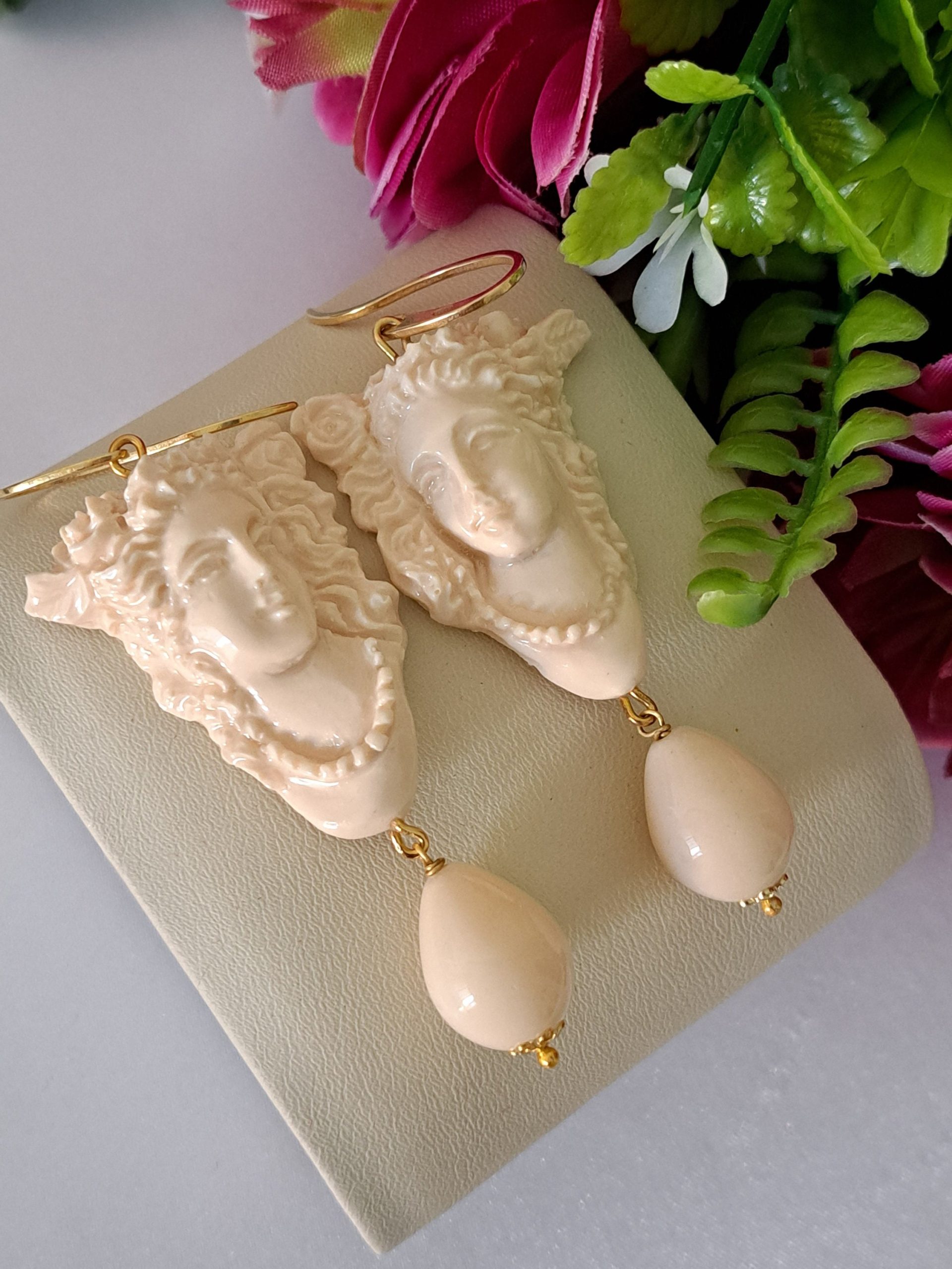 Orecchini cammeo e gocce pasta di avorio imitazione , orecchini argento 925 , gioielli italiani