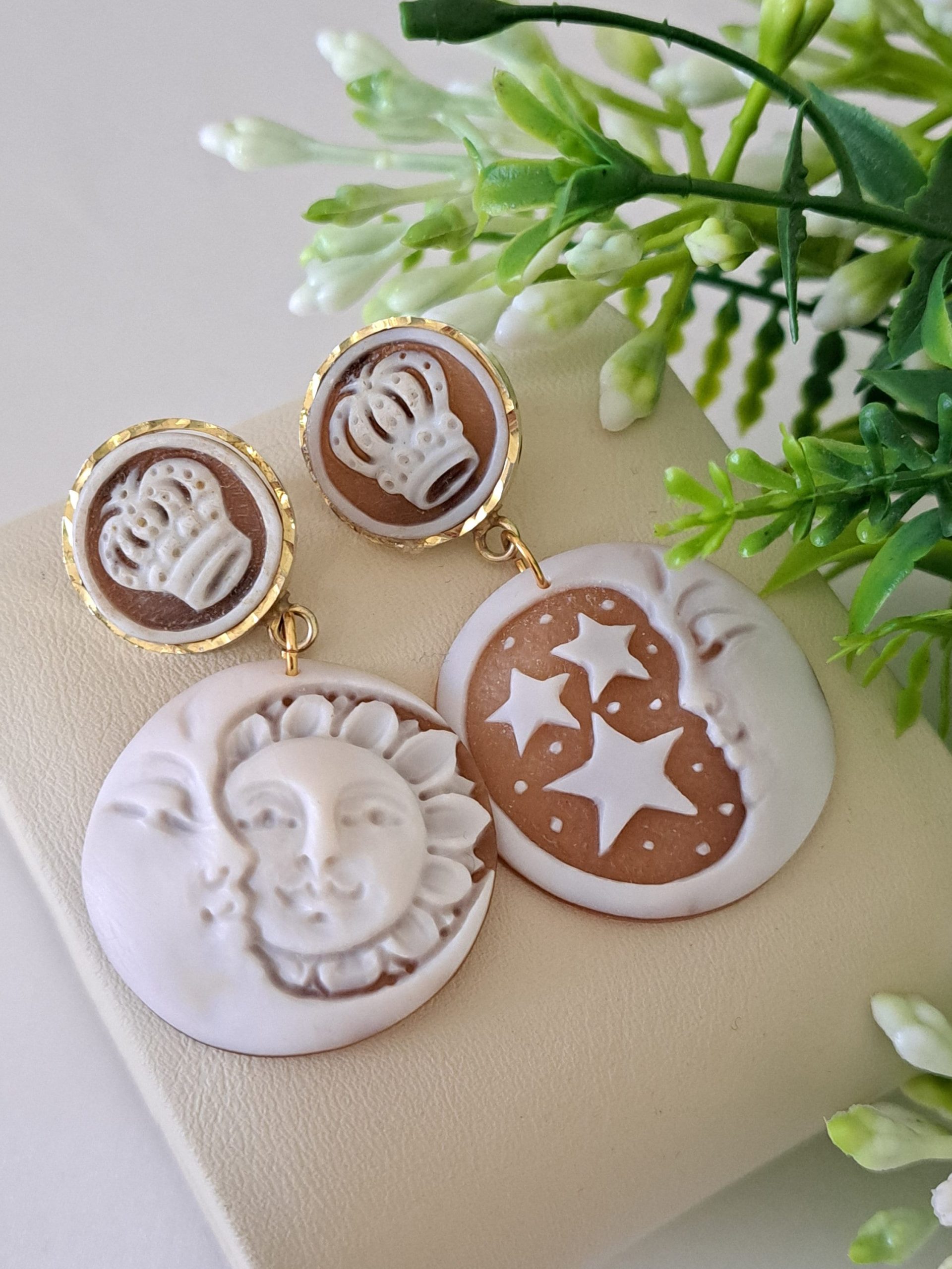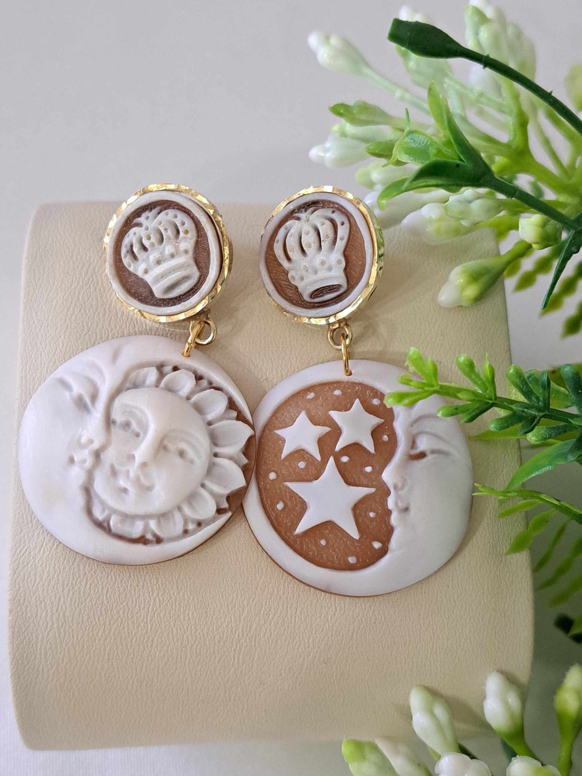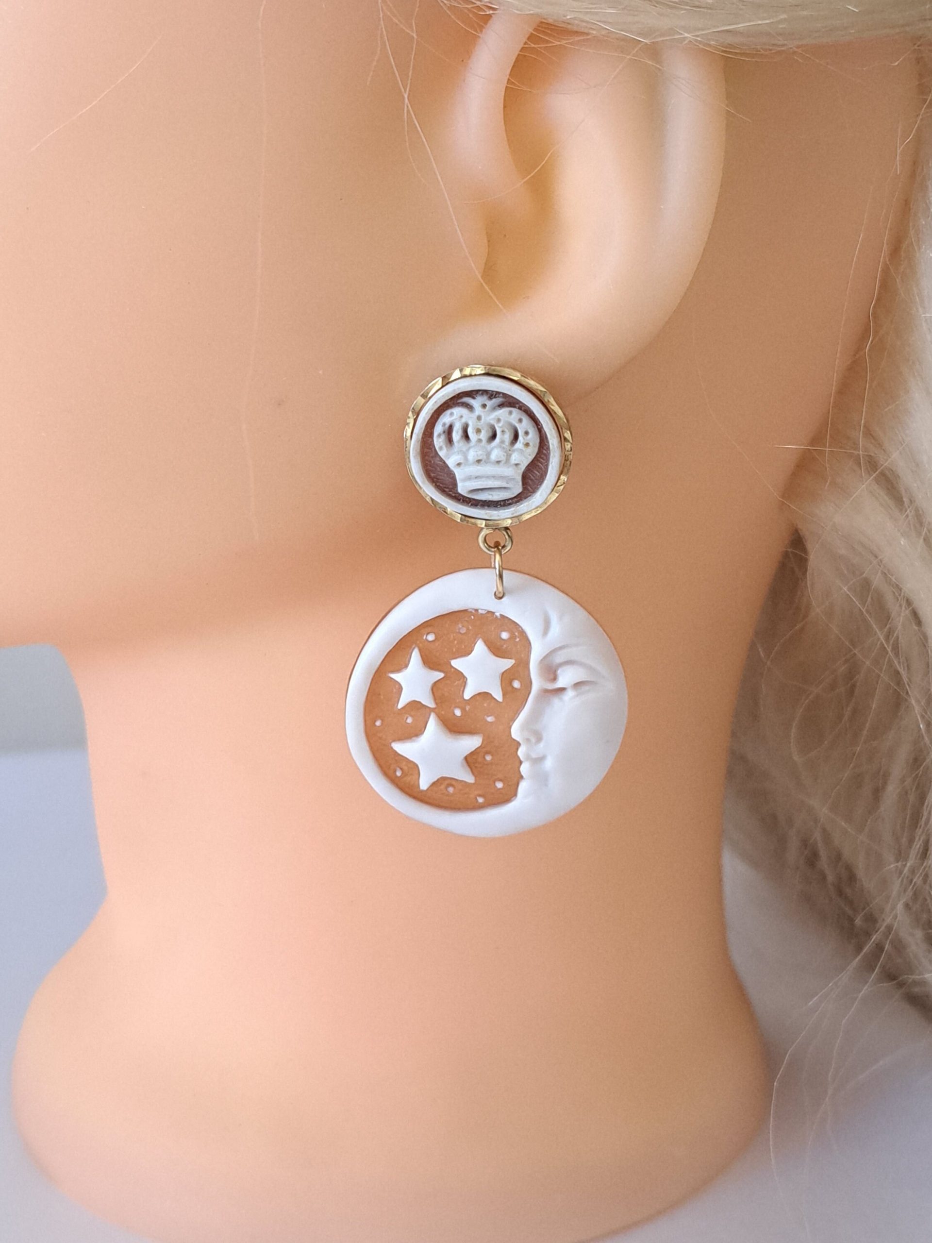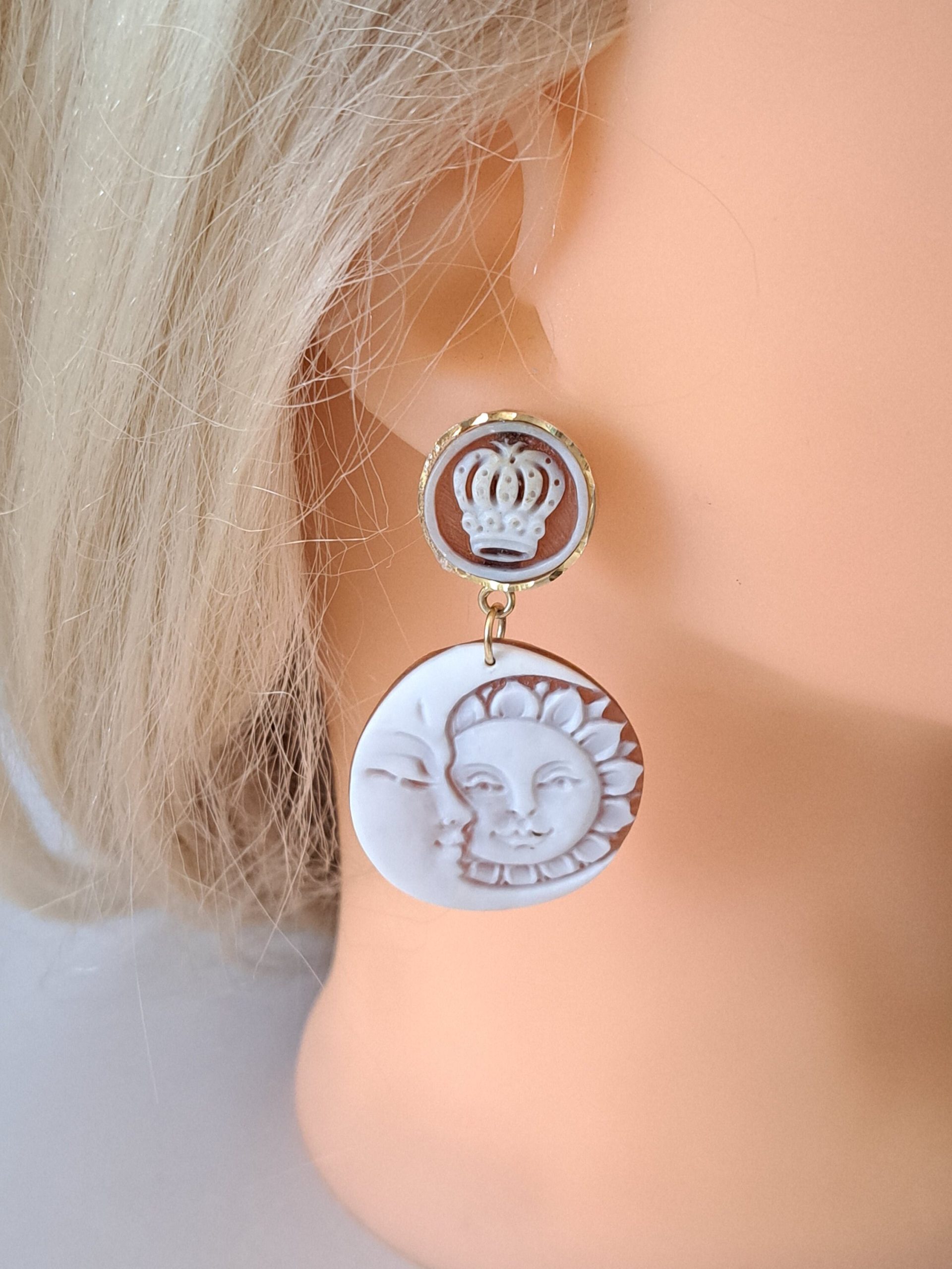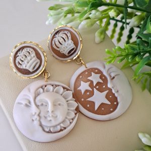 Orecchini cammeo Sole e Luna e cammeo corona in conchiglia sardonica , orecchini argento 925 placcato oro, gioielli italiani