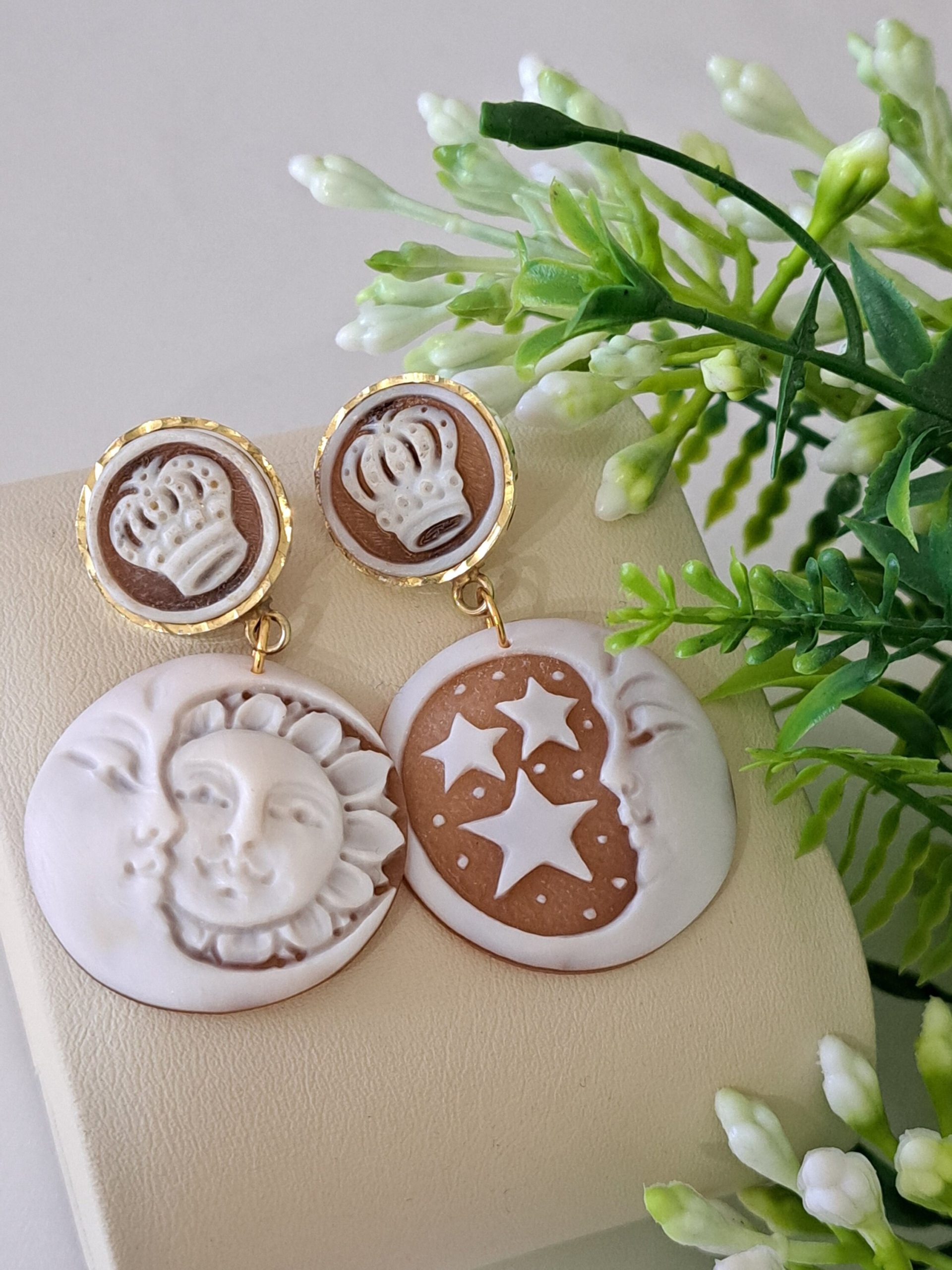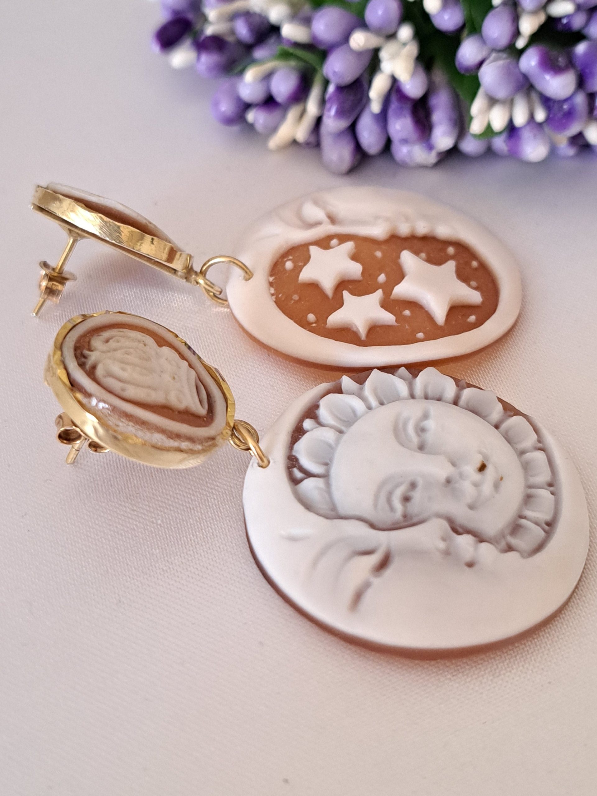 Orecchini cammeo Sole e Luna e cammeo fiori in conchiglia sardonica , orecchini argento 925 placcato oro, gioielli italiani