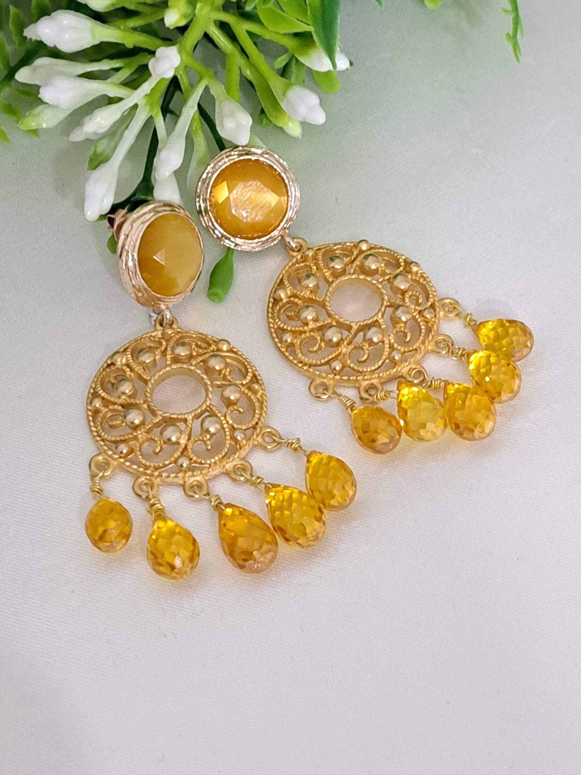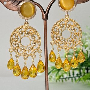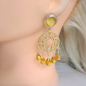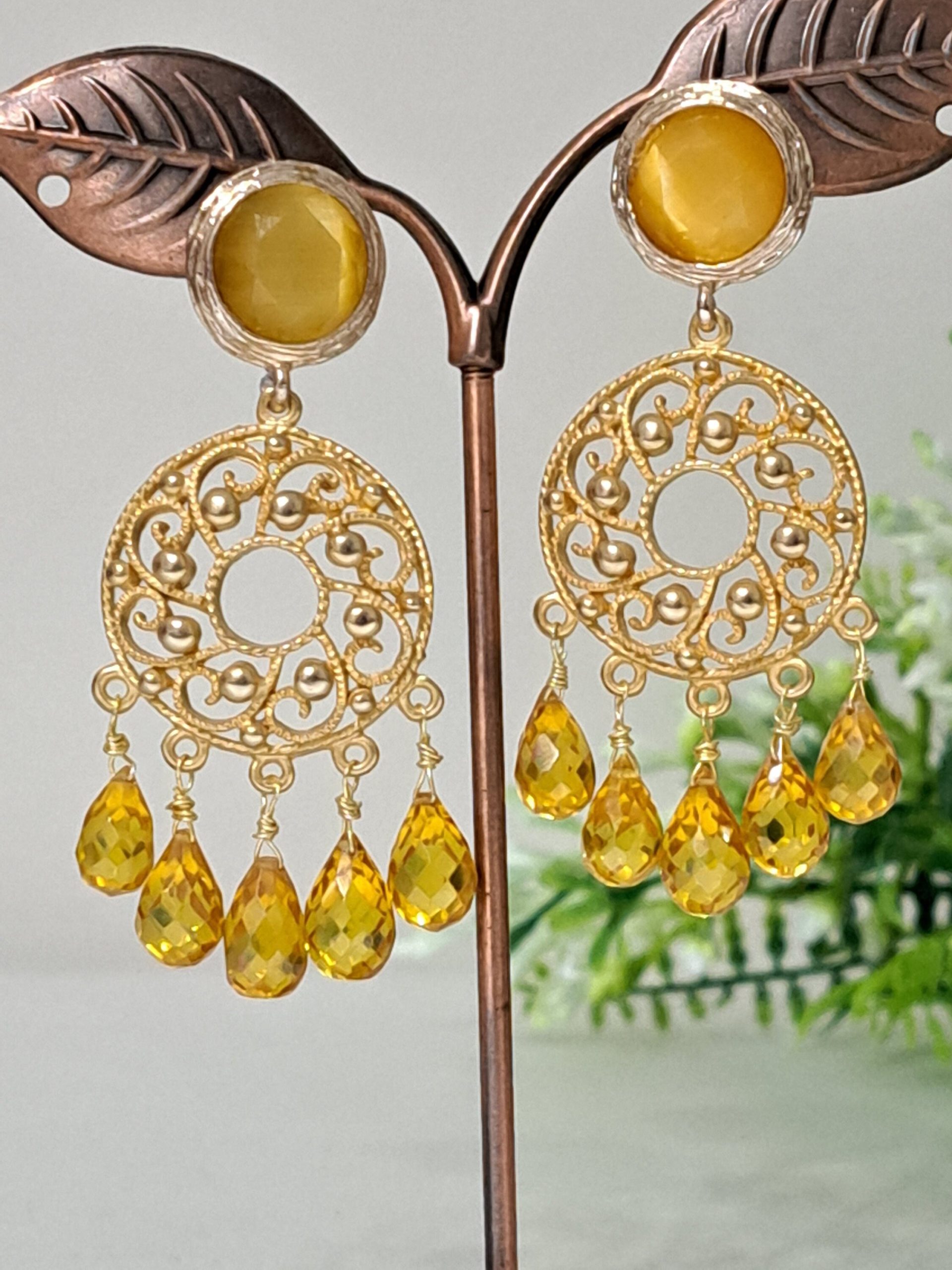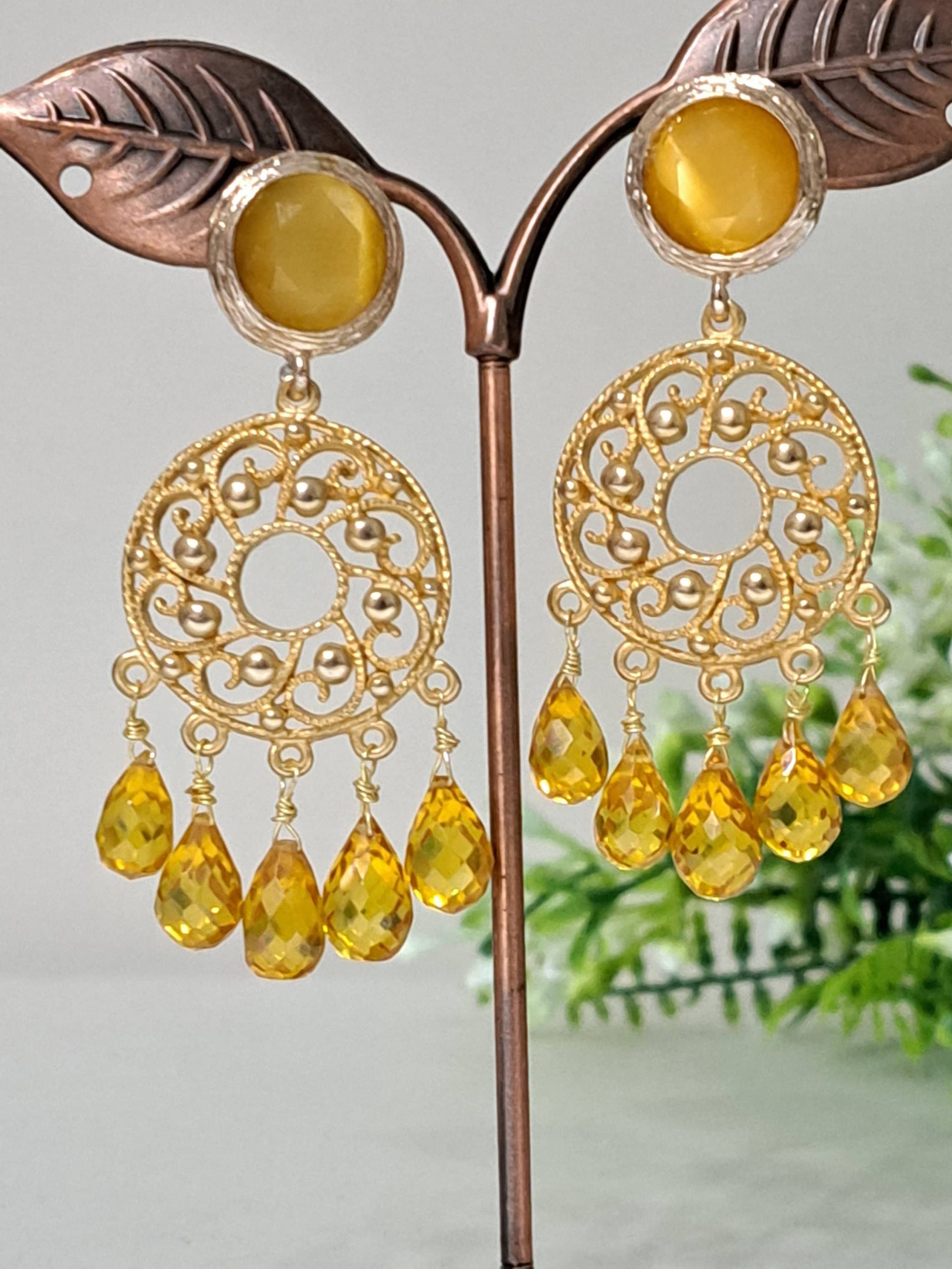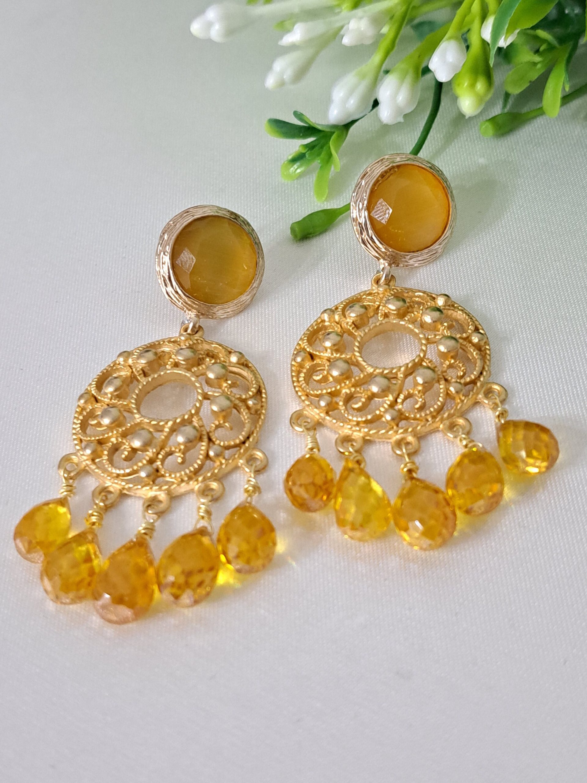 Orecchini pendenti a candelabro in ottone dorato con pietre dure naturali sfaccettate briolette in zirconio giallo, chiusura a perno con farfallina in ottone dorato con quarzo giallo occhio di gatto , lunghezza 6 cm.