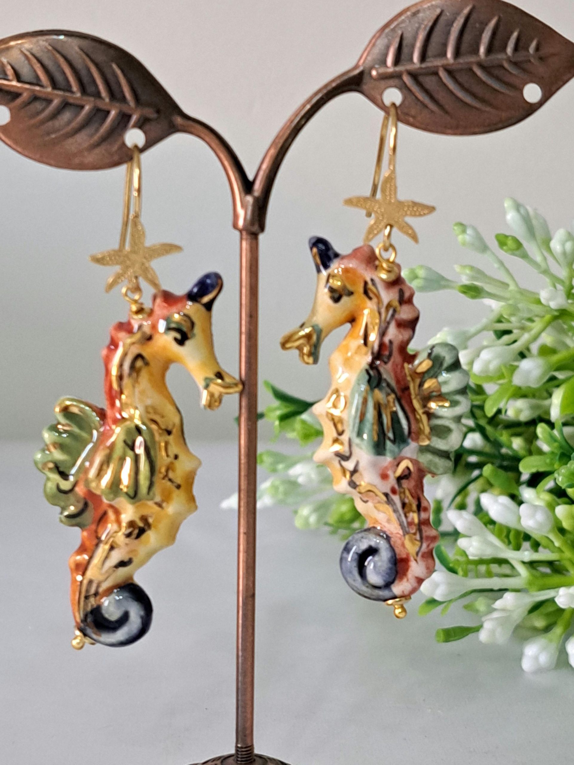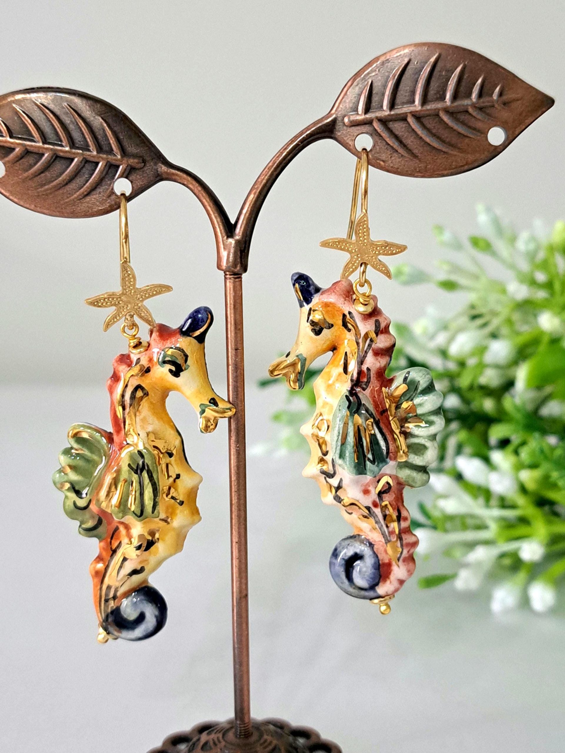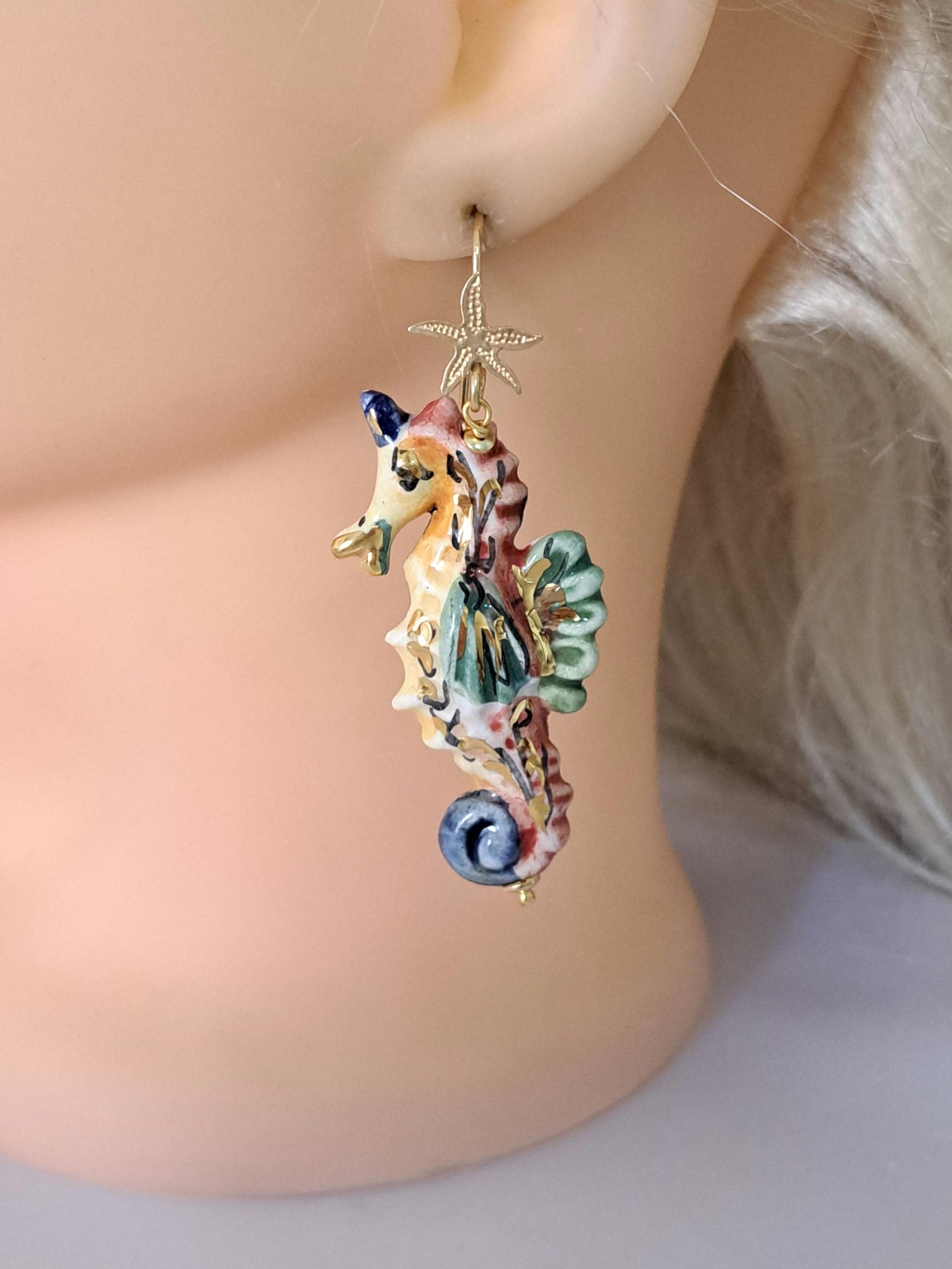 Orecchini cavallucci marini ceramica di Caltagirone con stelle marine , orecchini siciliani