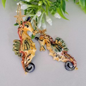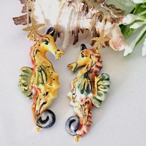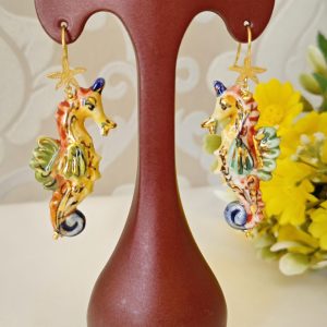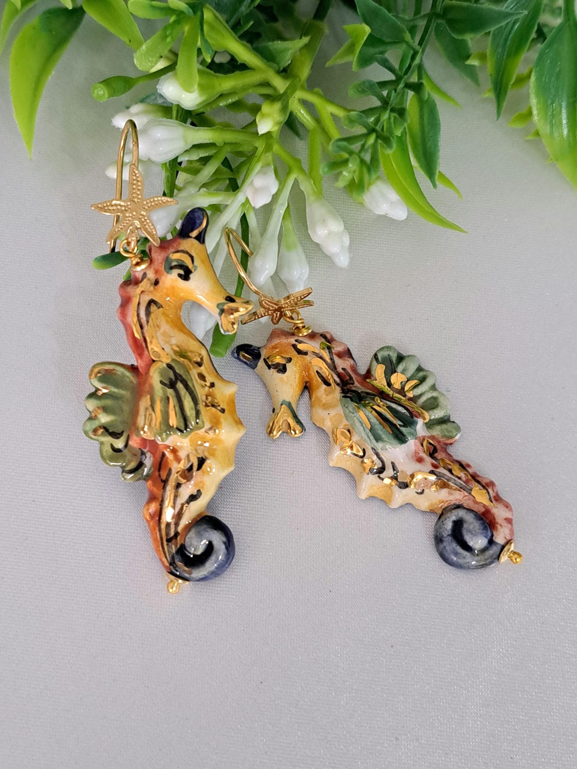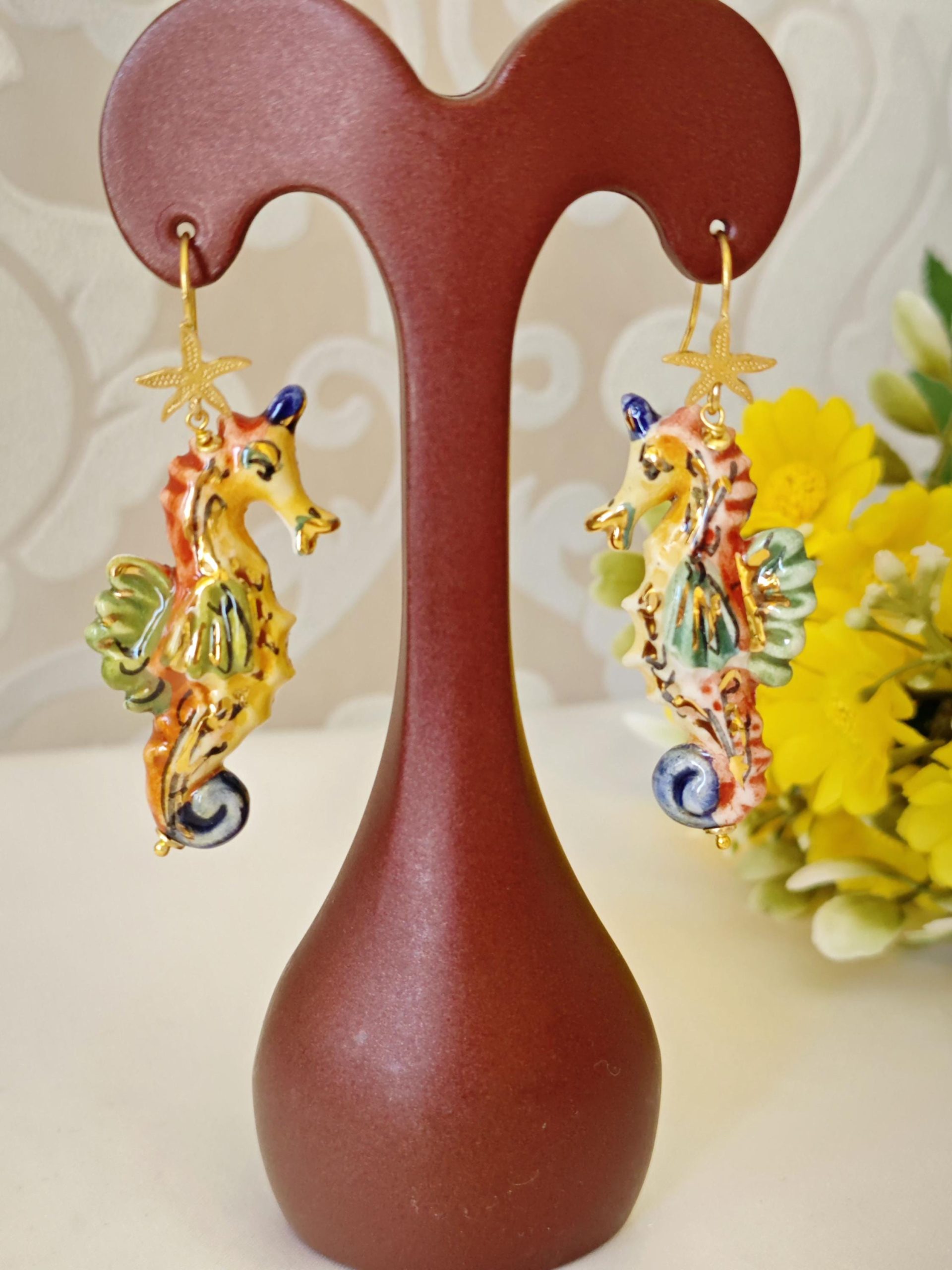 Orecchini cavallucci marini ceramica di Caltagirone con stelle marine , orecchini siciliani