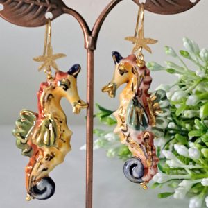 Orecchini pendenti realizzati con cavallucci marini in ceramica di Caltagirone realizzata e dipinta a mano 5 cm dimensioni ,con applicazioni foglia oro 22 kt, chiusura a monachelle a forma di stelle marine in ottone dorato .