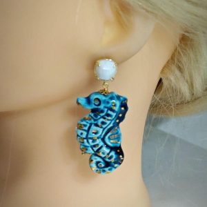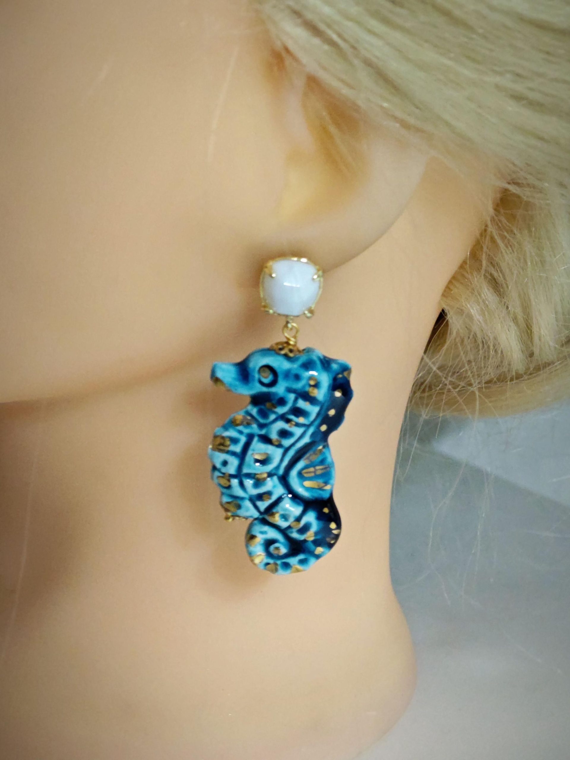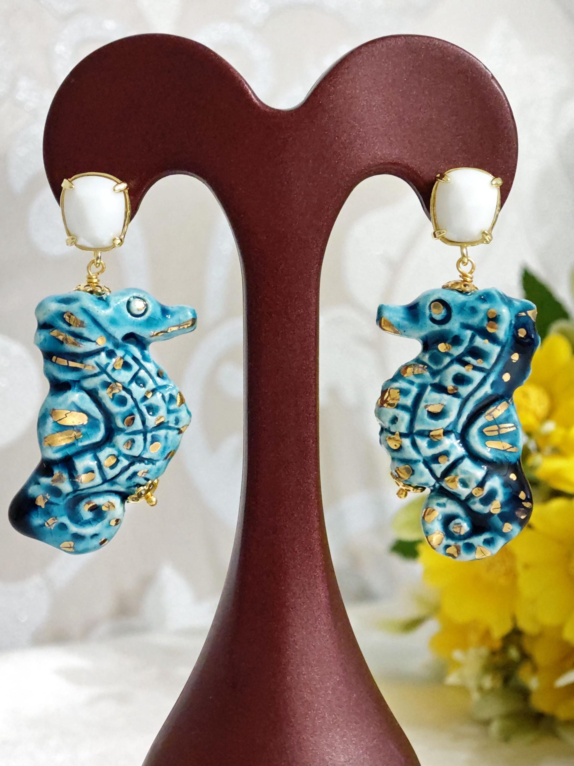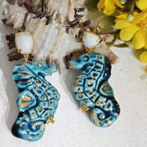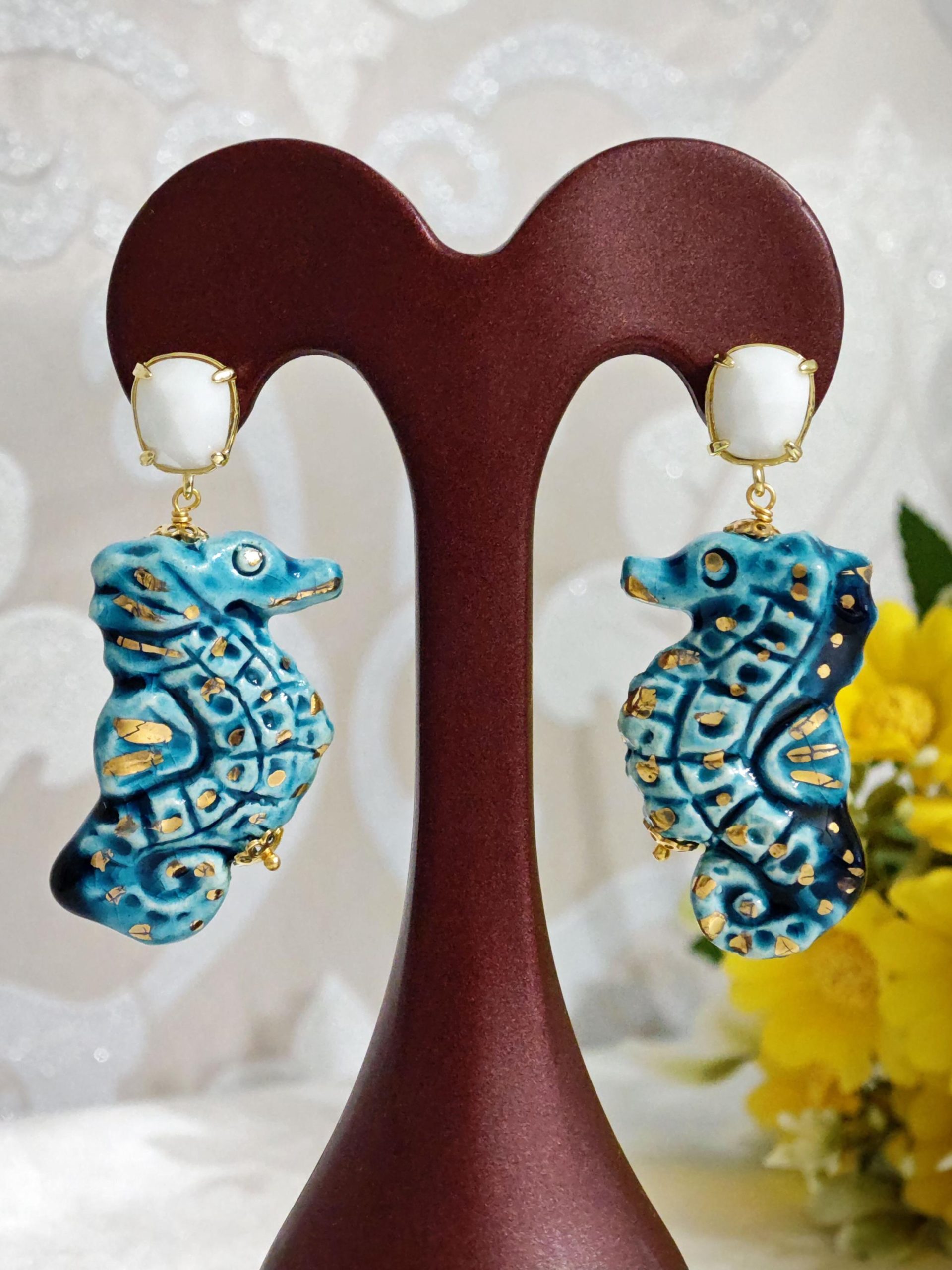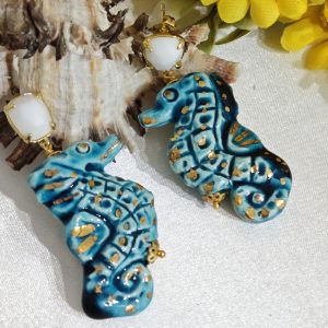 Orecchini cavallucci marini ceramica di Caltagirone con onice bianco, orecchini siciliani