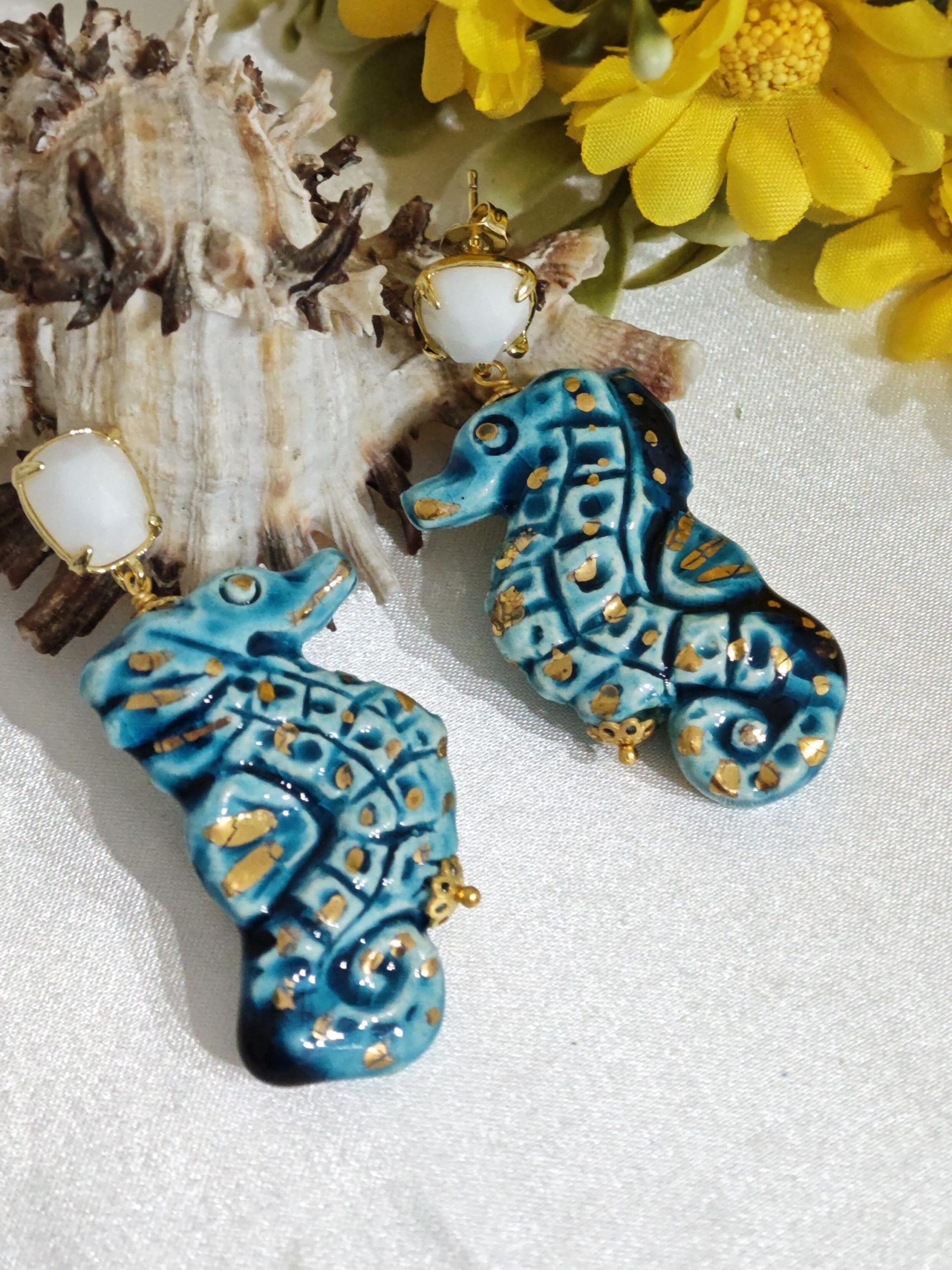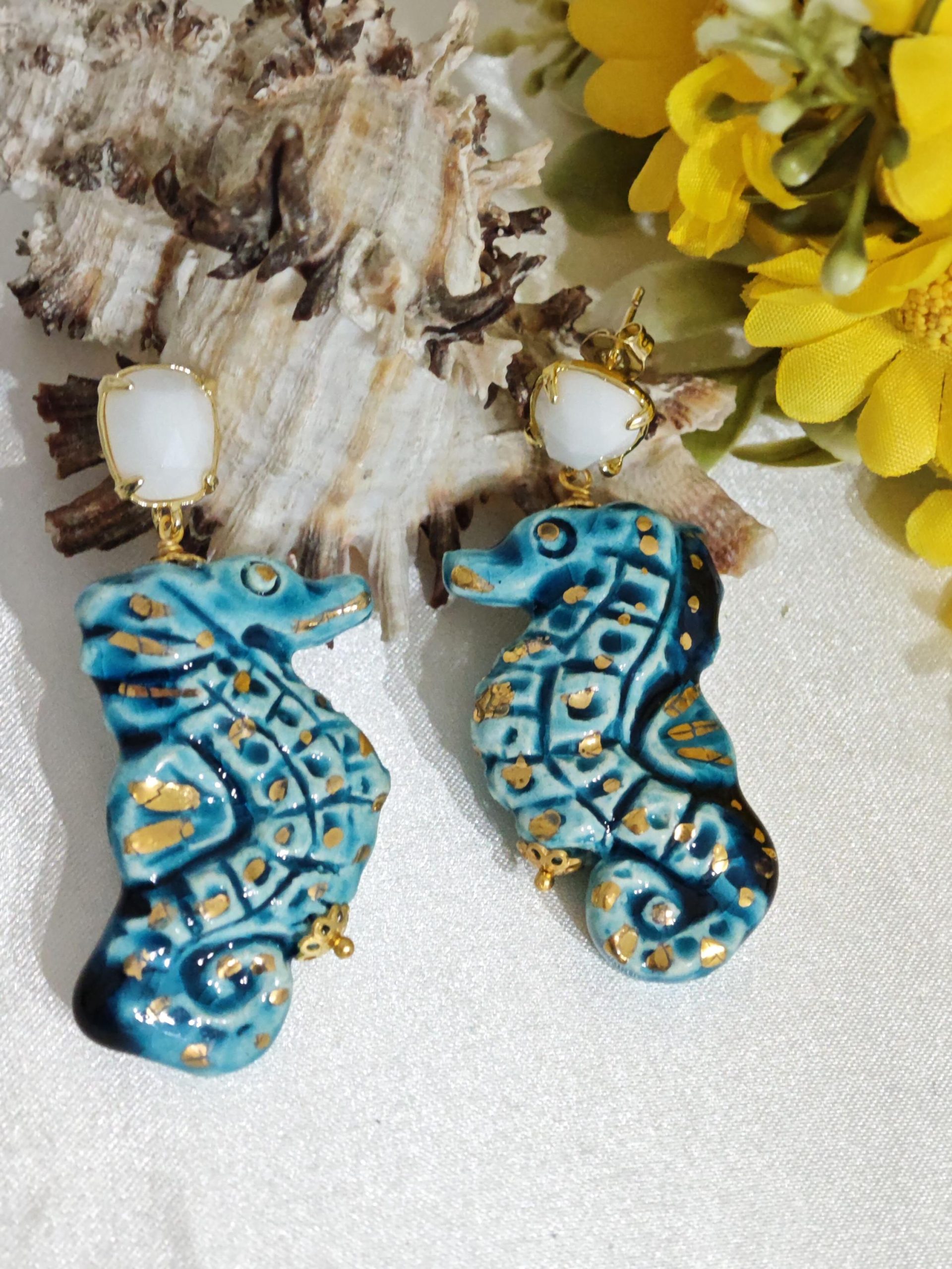 Orecchini pendenti realizzati con cavallucci marini in ceramica di Caltagirone realizzata e dipinta a mano ,con applicazioni foglia oro 22 kt, 4,5 cm dimensioni .