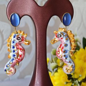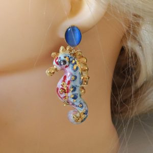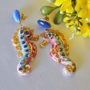Orecchini cavallucci marini ceramica di Caltagirone con quarzo blu, orecchini siciliani