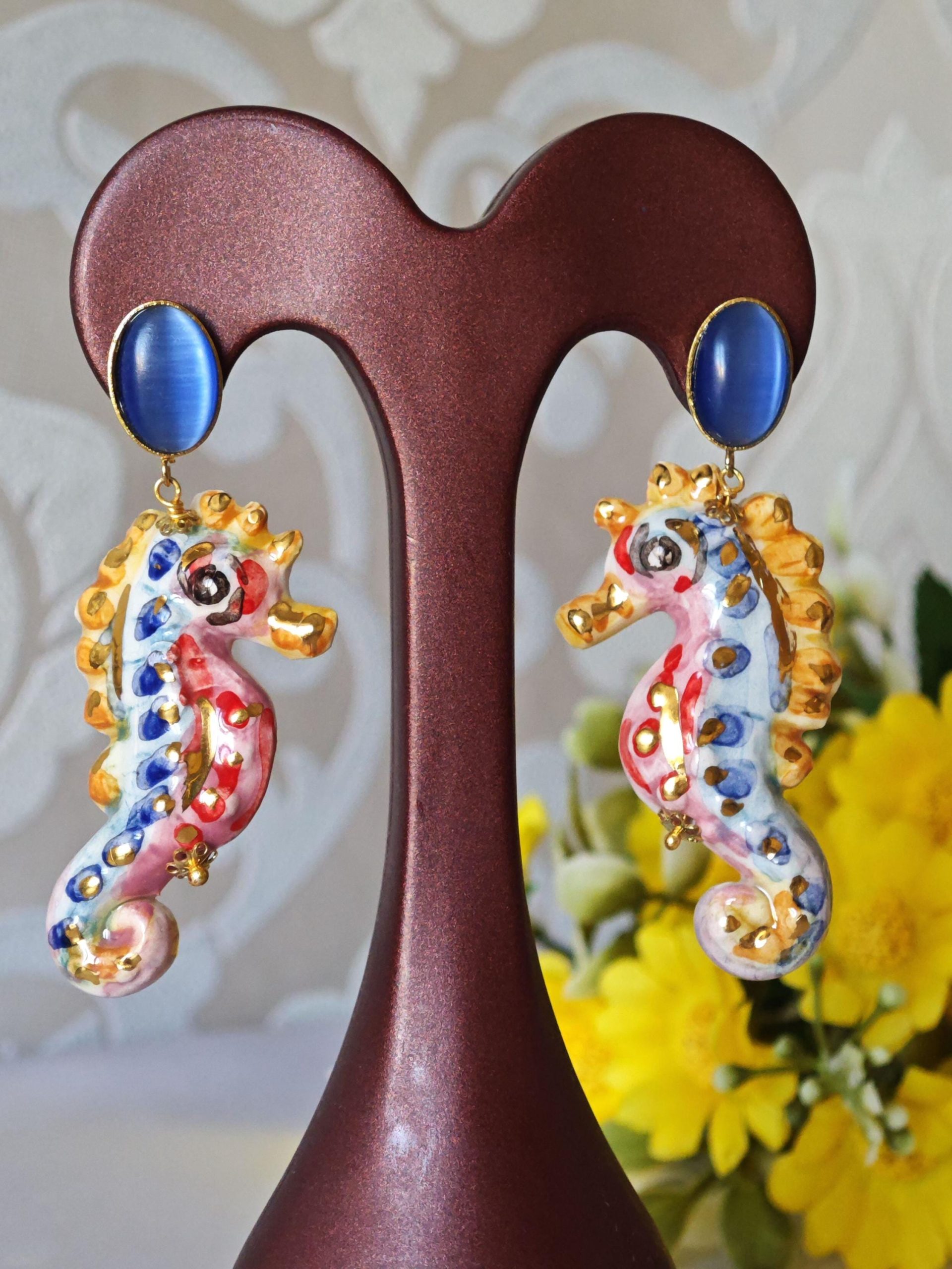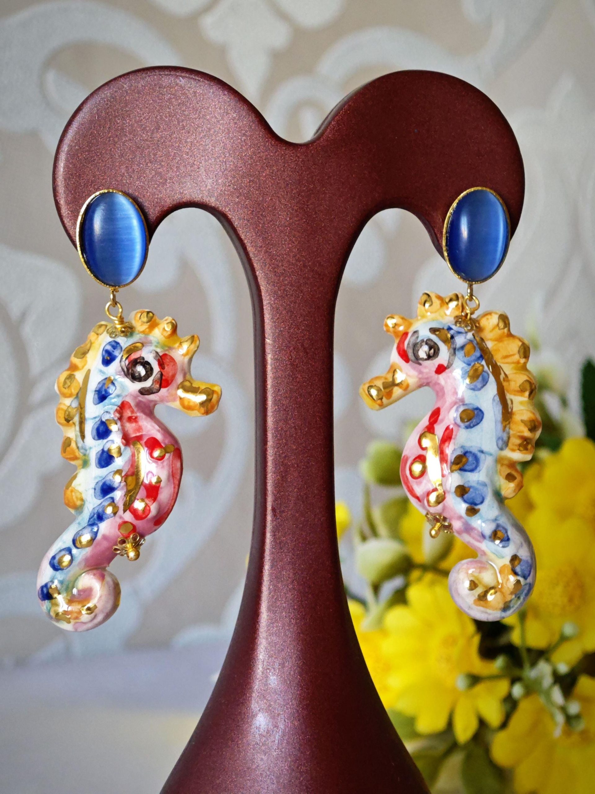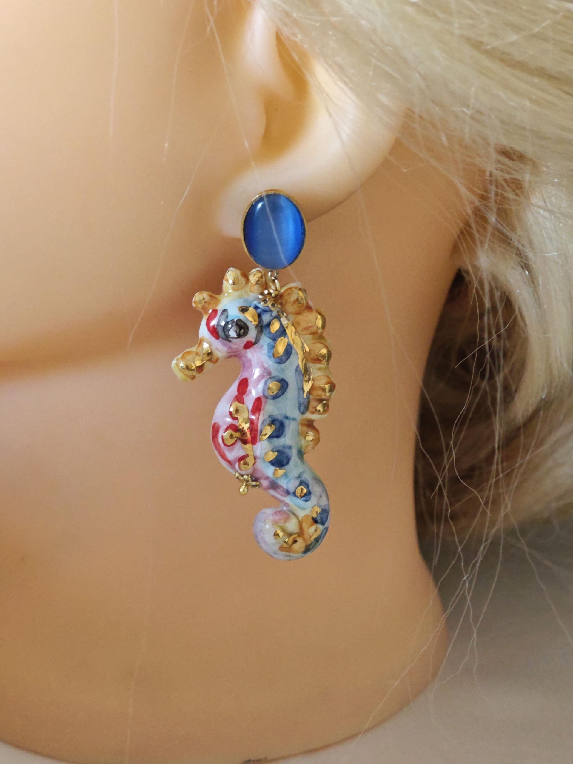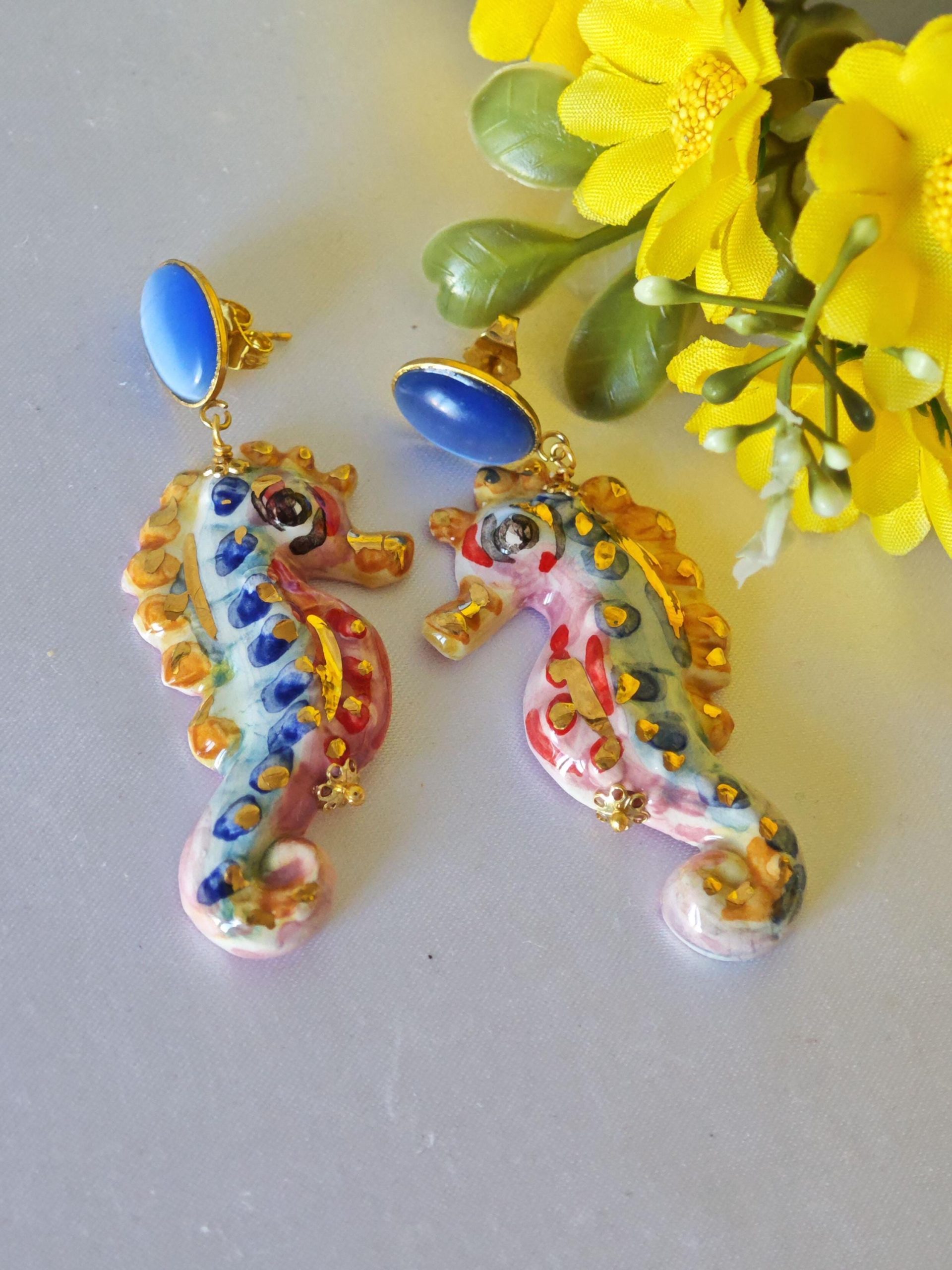 Orecchini pendenti realizzati con cavallucci marini in ceramica di Caltagirone realizzata e dipinta a mano ,con applicazioni foglia oro 22 kt, 5 cm dimensioni .