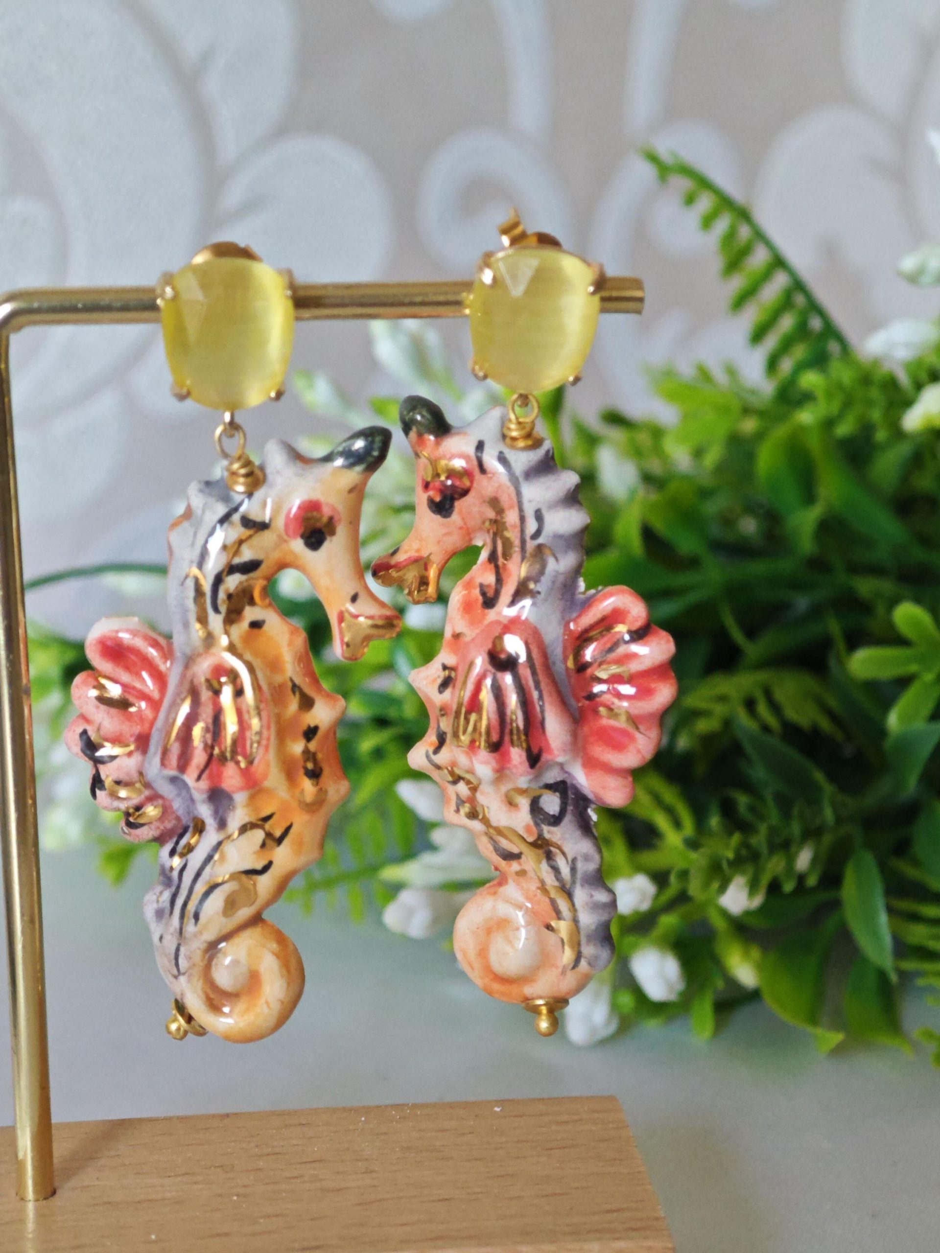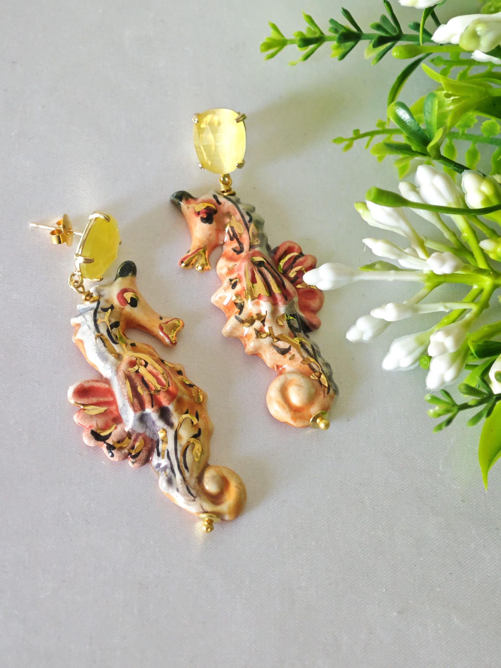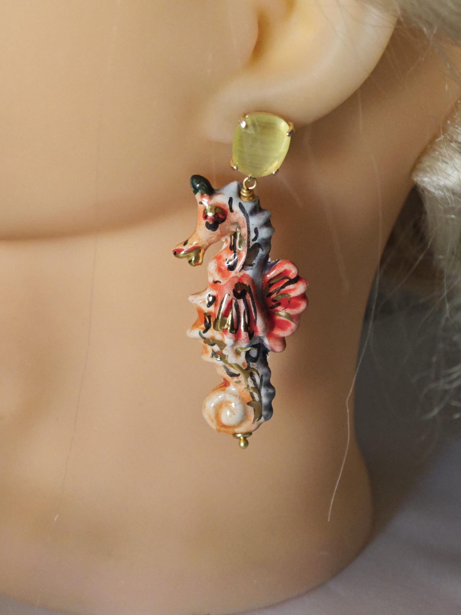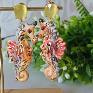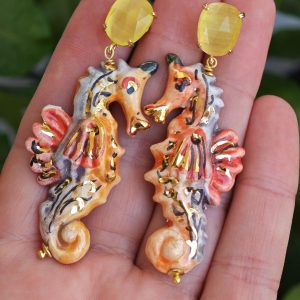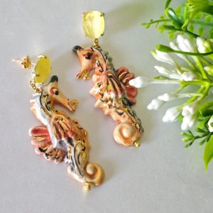 Orecchini cavallucci marini ceramica di Caltagirone con quarzo giallo, orecchini siciliani