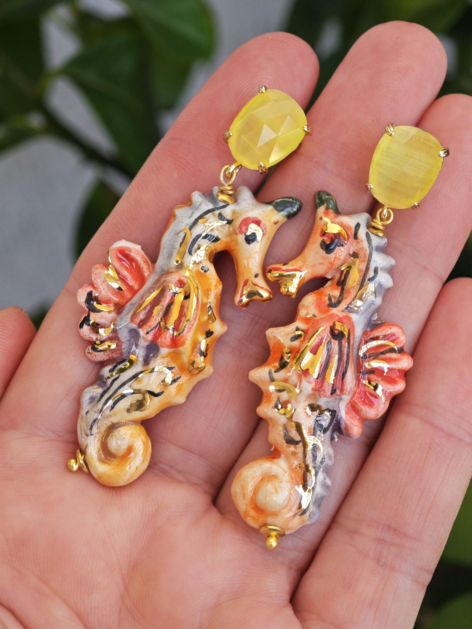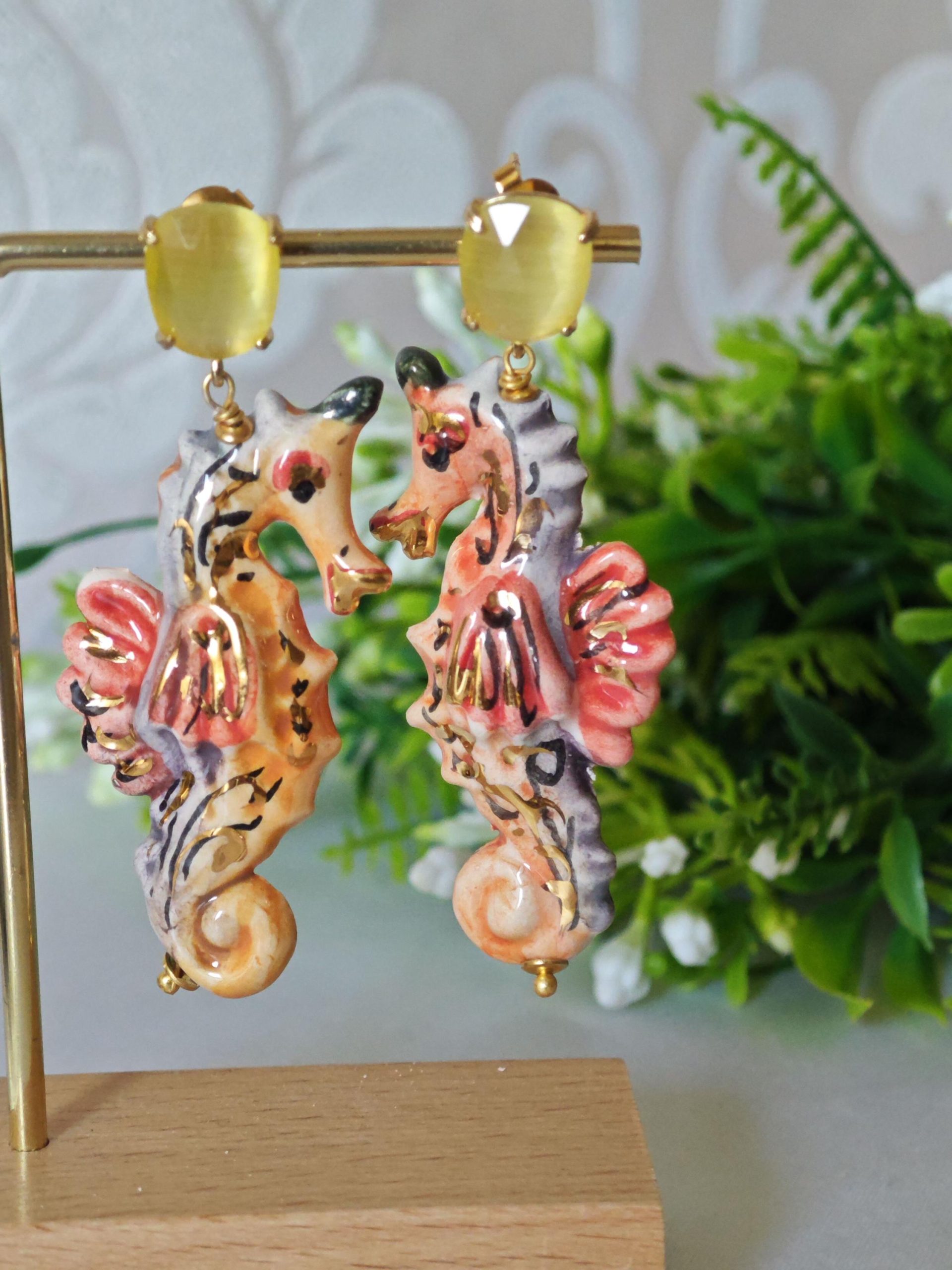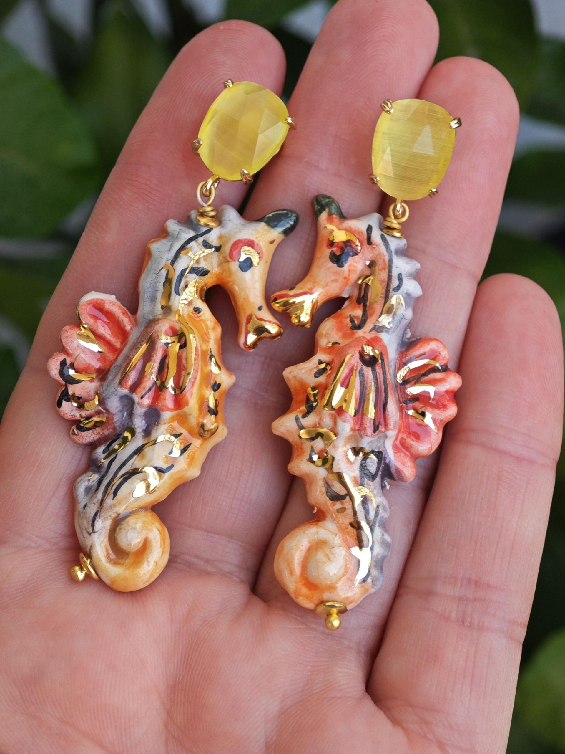 Orecchini cavallucci marini ceramica di Caltagirone con quarzo giallo, orecchini siciliani