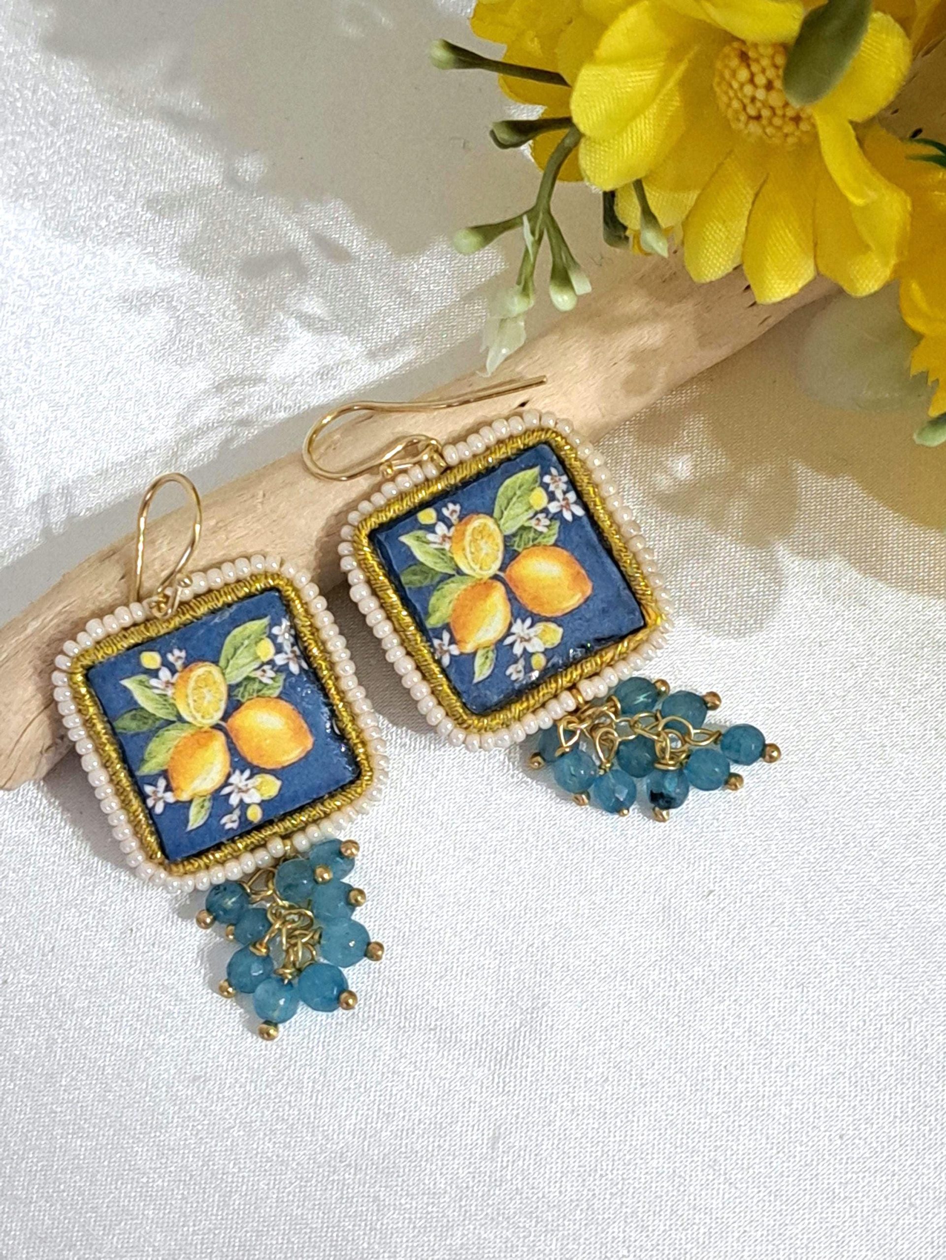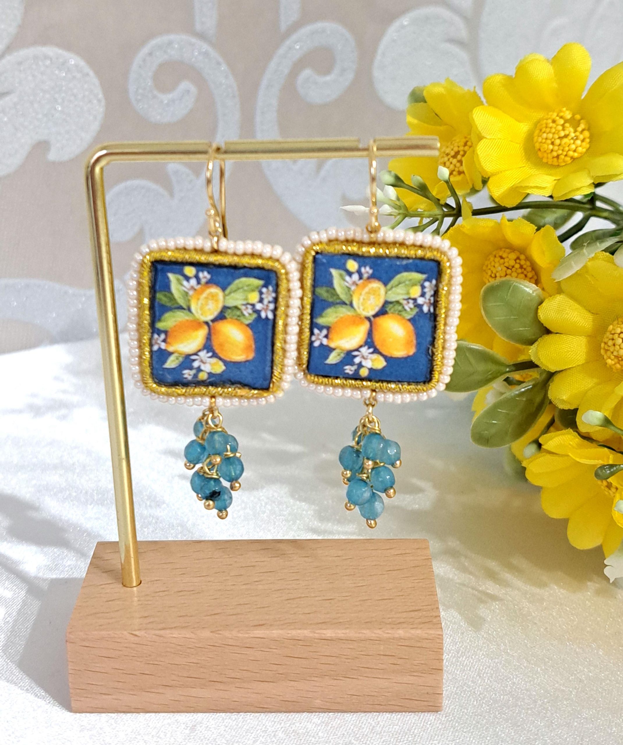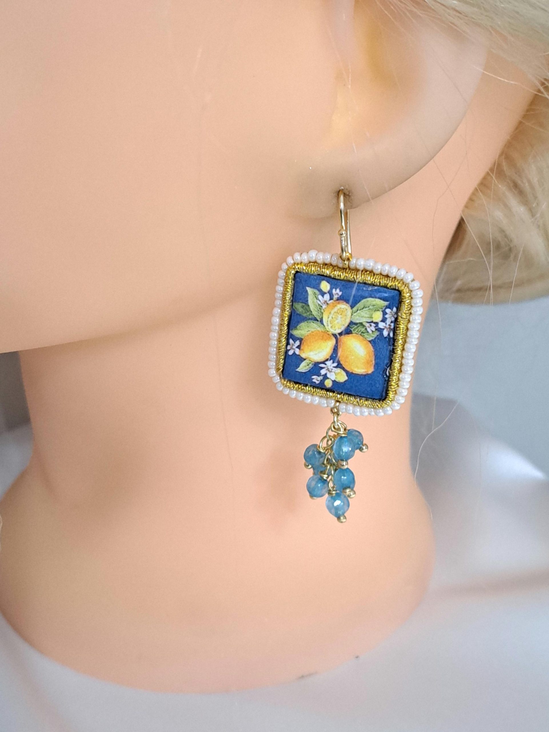 Orecchini pendenti con piastrelle in pietra lavica smaltata con motivi ceramica di Caltagirone realizzata a mano, 2×2 cm dimensioni, cornice perline bianche naturali ,grappolo pietre dure agata blu , chiusura a monachelle in argento 925 placcato oro.