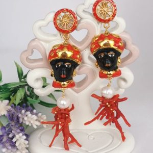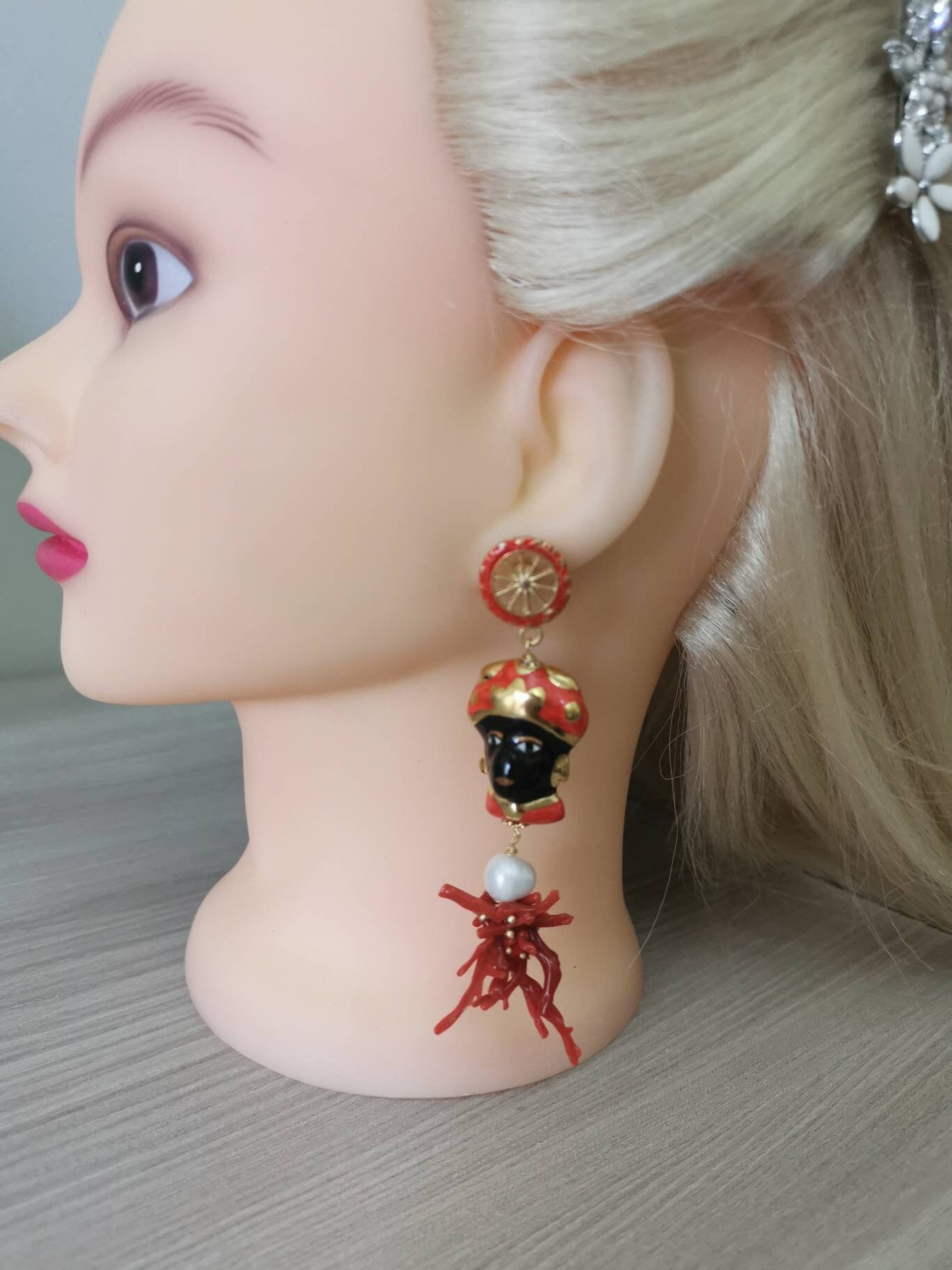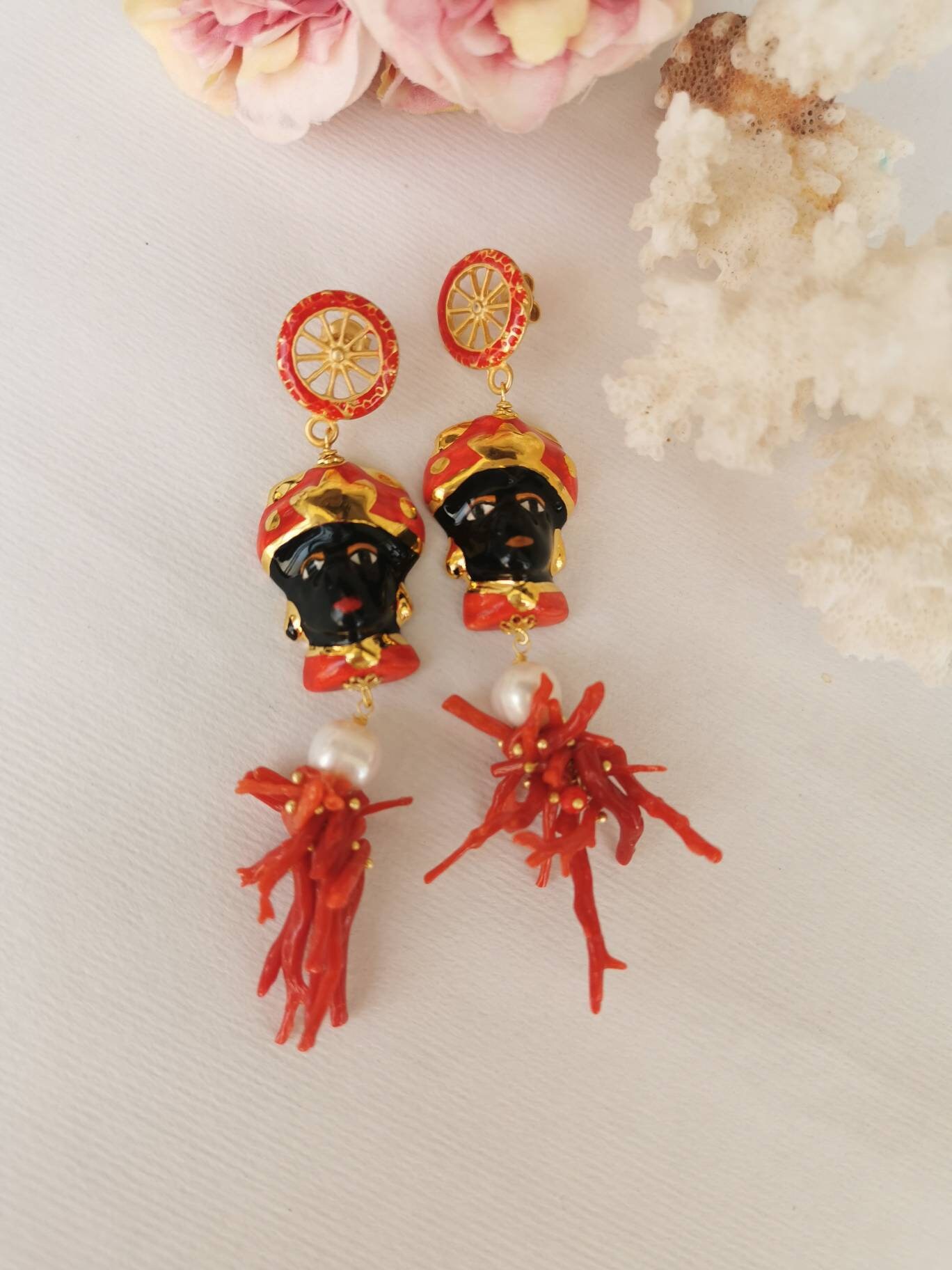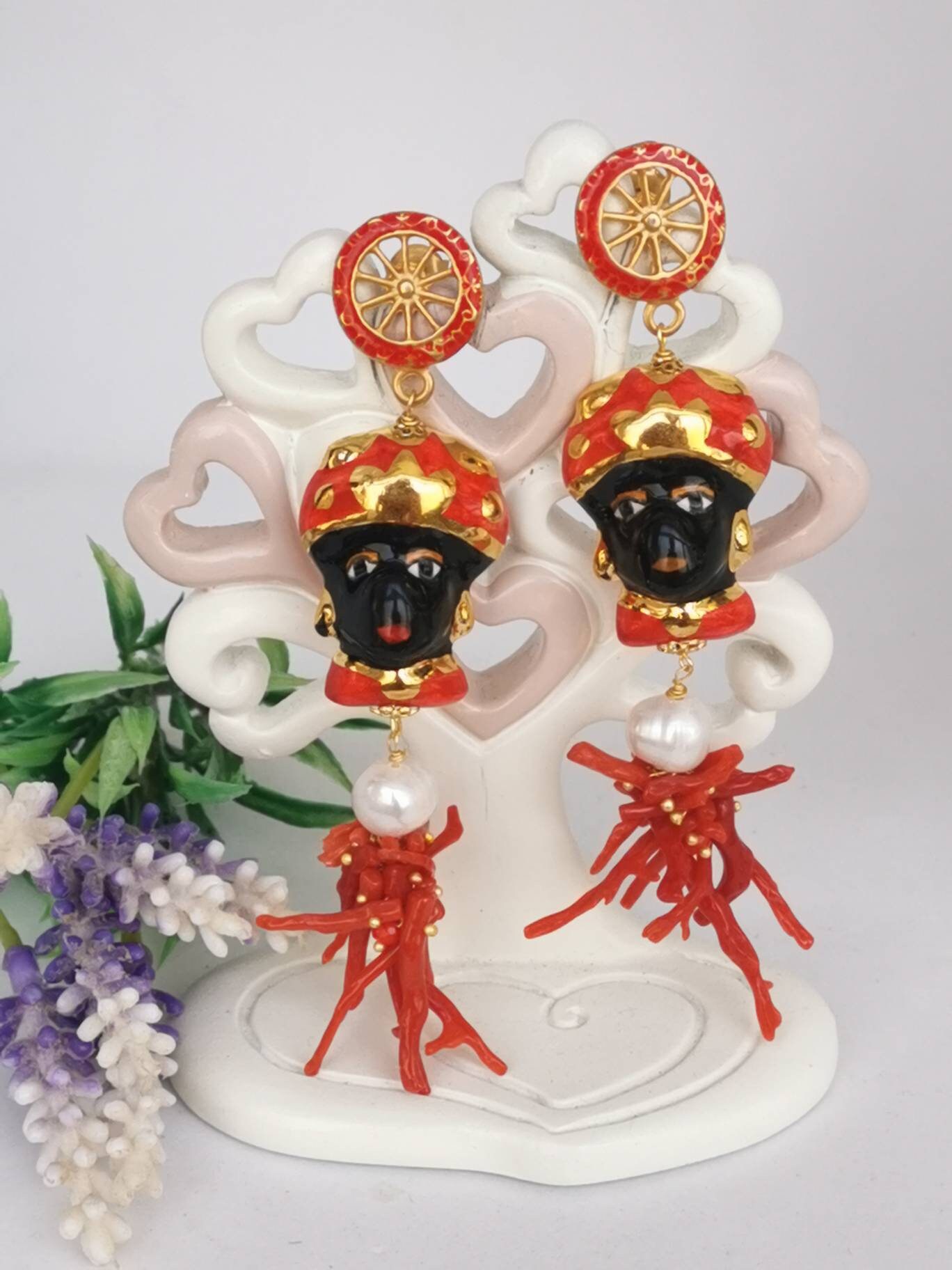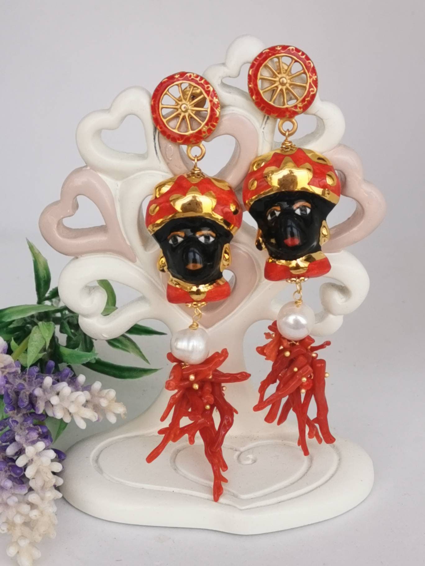 Orecchini pendenti con teste di moro in ceramica di Caltagirone realizzata e dipinta a mano, con applicazioni foglia oro 22 kt, 3 cm dimensioni, e rametti corallo rosso mediterraneo e perle bianche naturali , chiusura a perno con farfallina a forma di ruote carretto siciliano in ottone smaltato , lunghezza totale 9 cm.