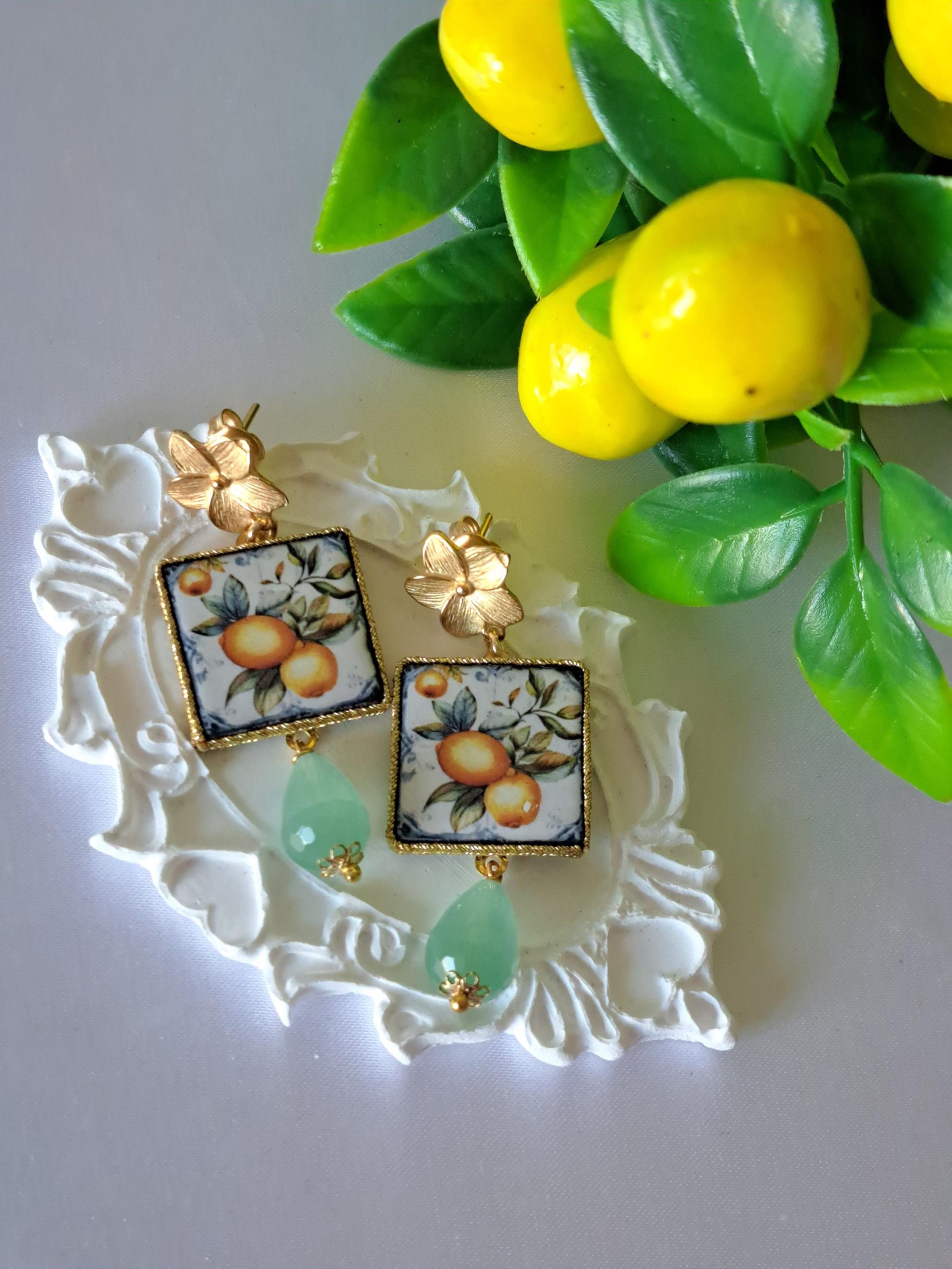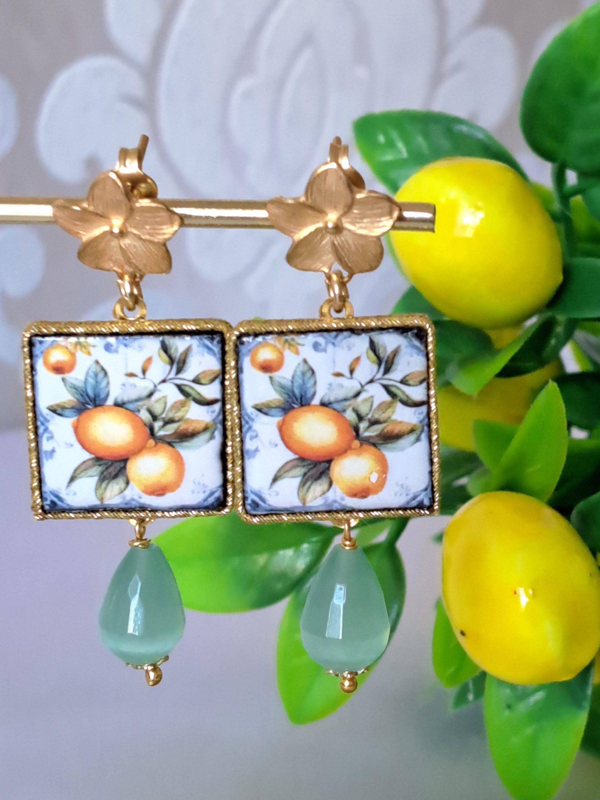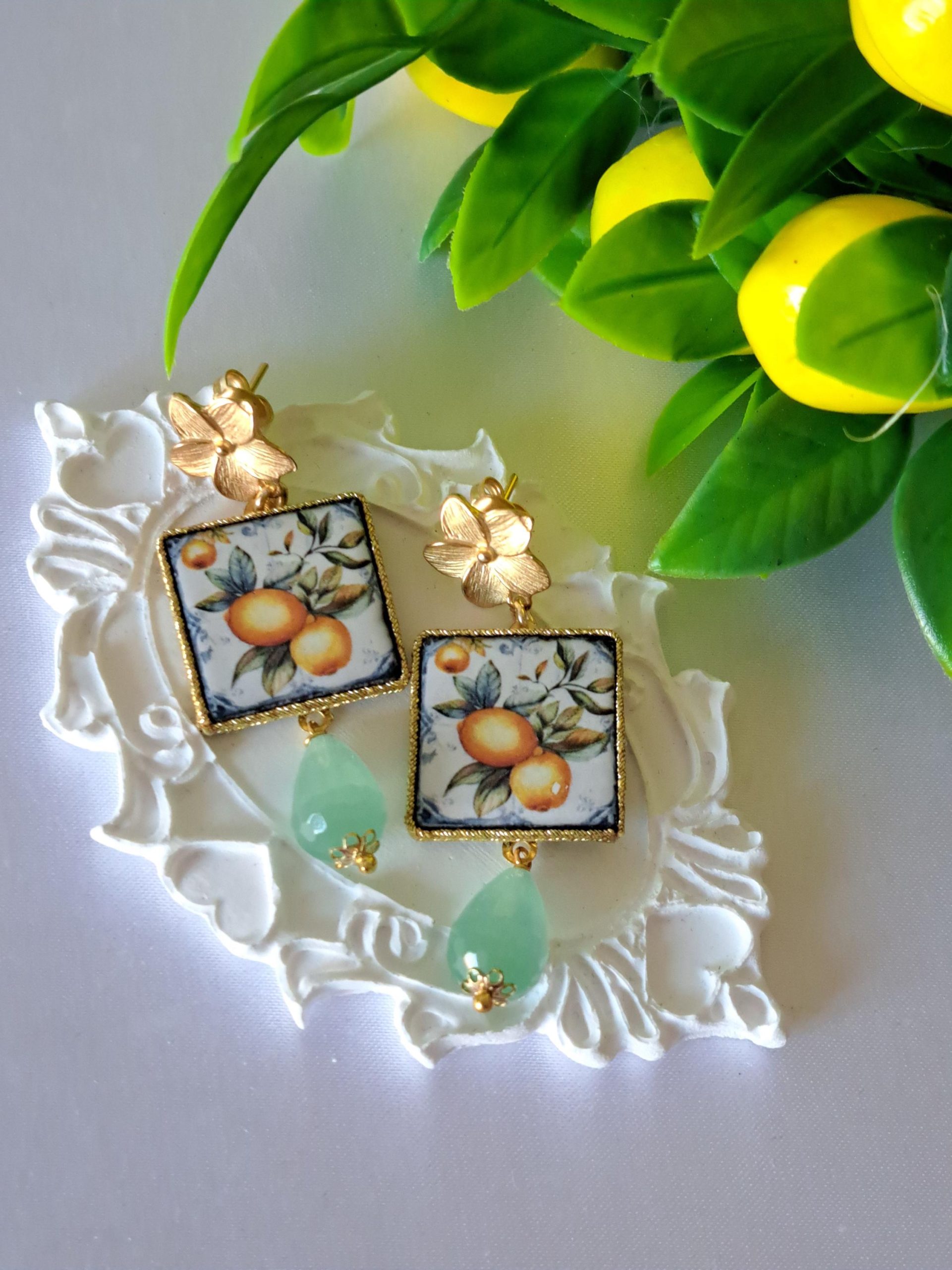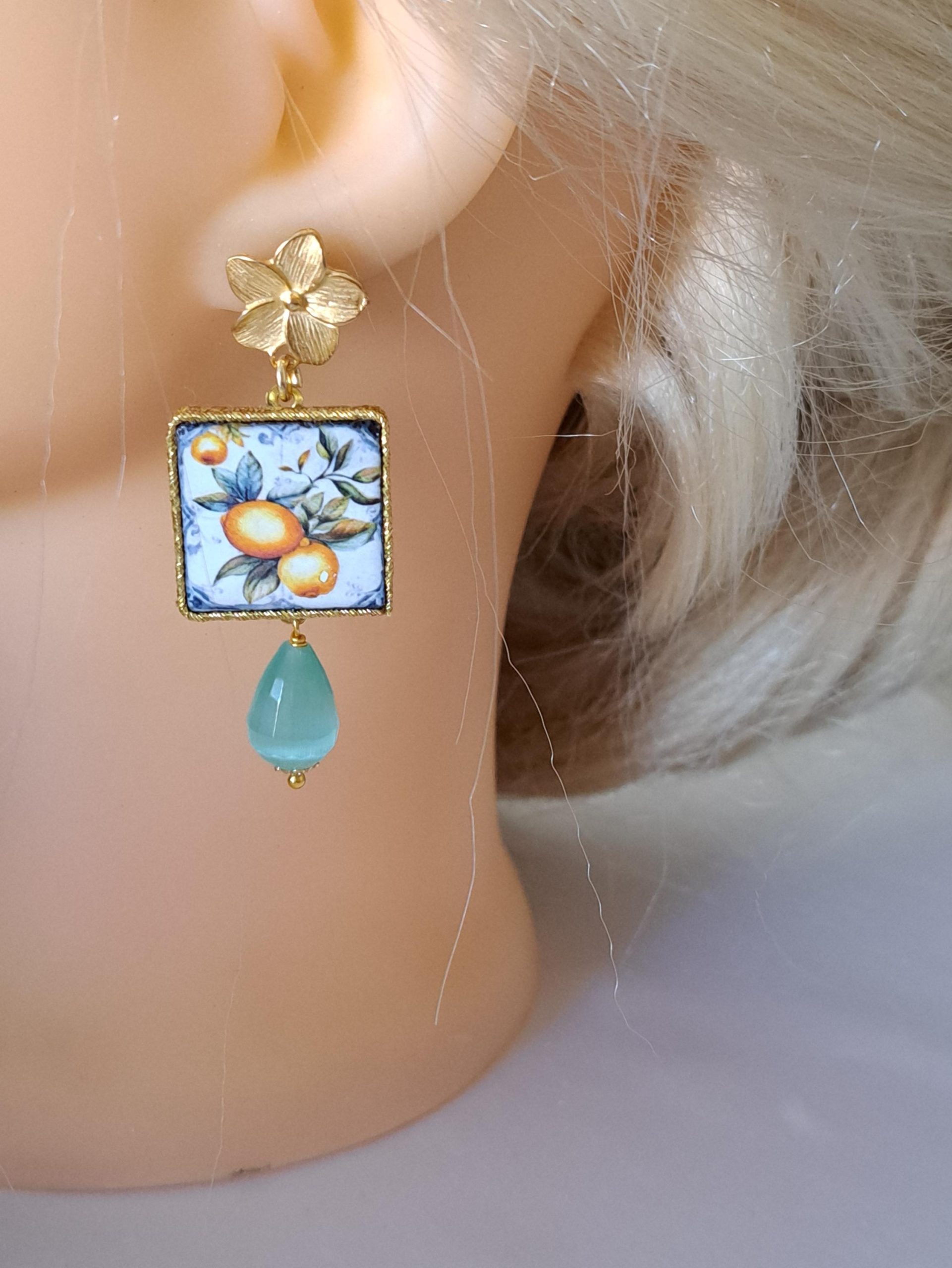 Orecchini pendenti con piastrelle in pietra lavica smaltata con motivi Caltagirone realizzata a mano 2×2 cm dimensioni con pietre goccia quarzo verde acqua.