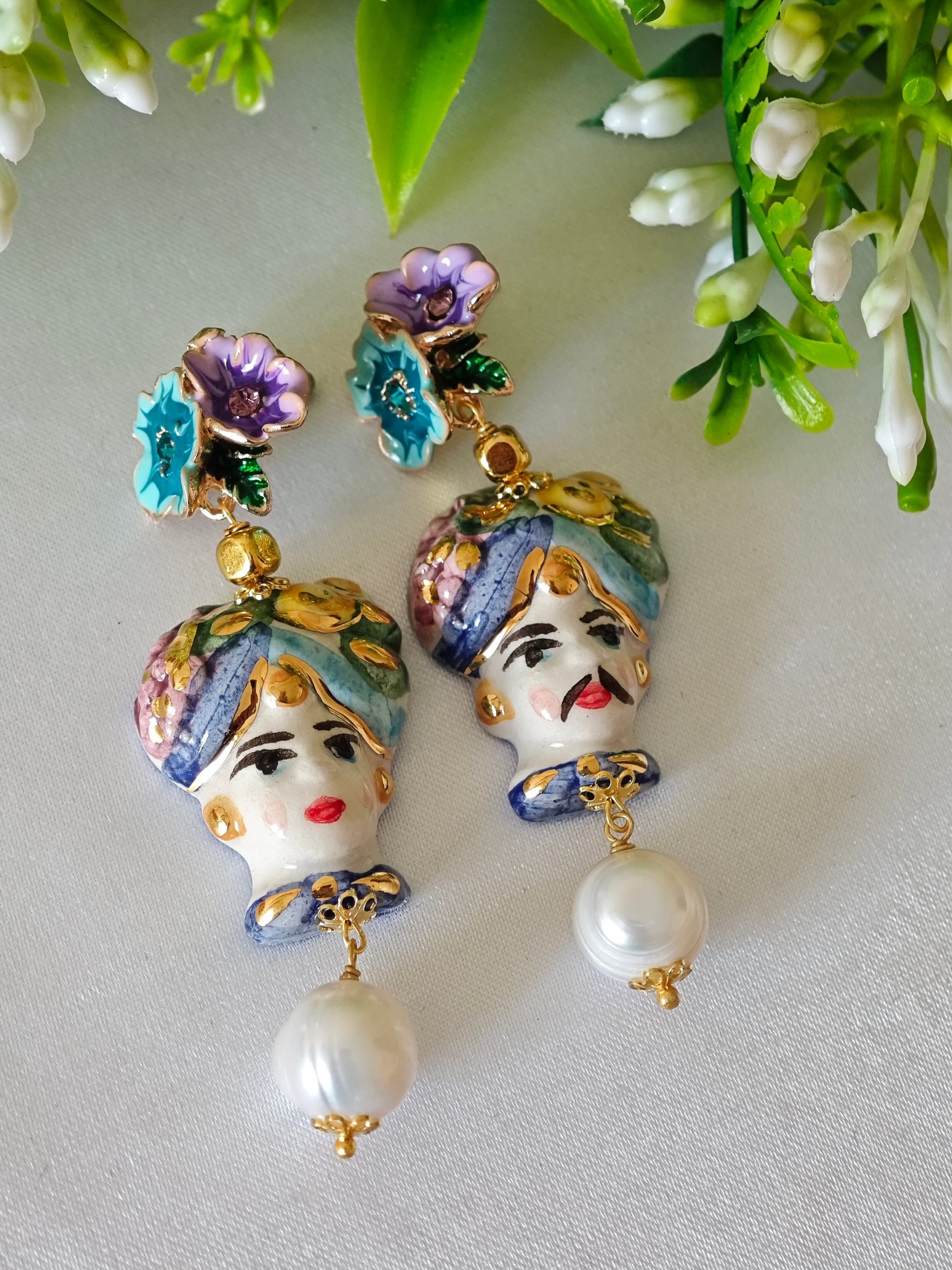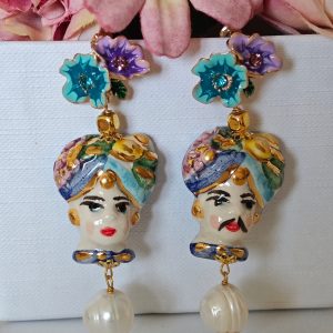 Orecchini ceramica Caltagirone, orecchini teste di moro con rose corallo bianco e gocce imitazione avorio , orecchini siciliani
