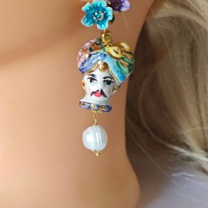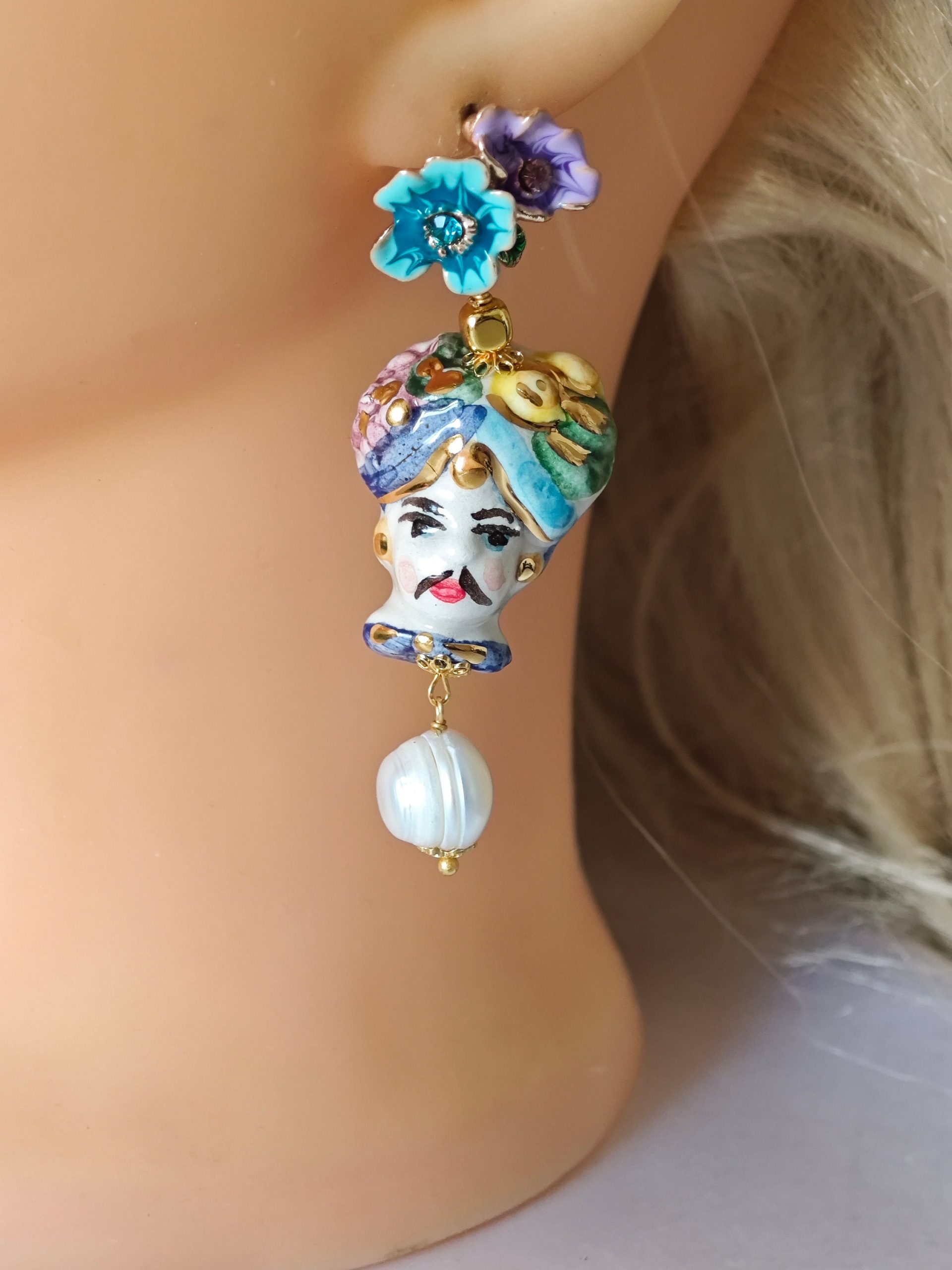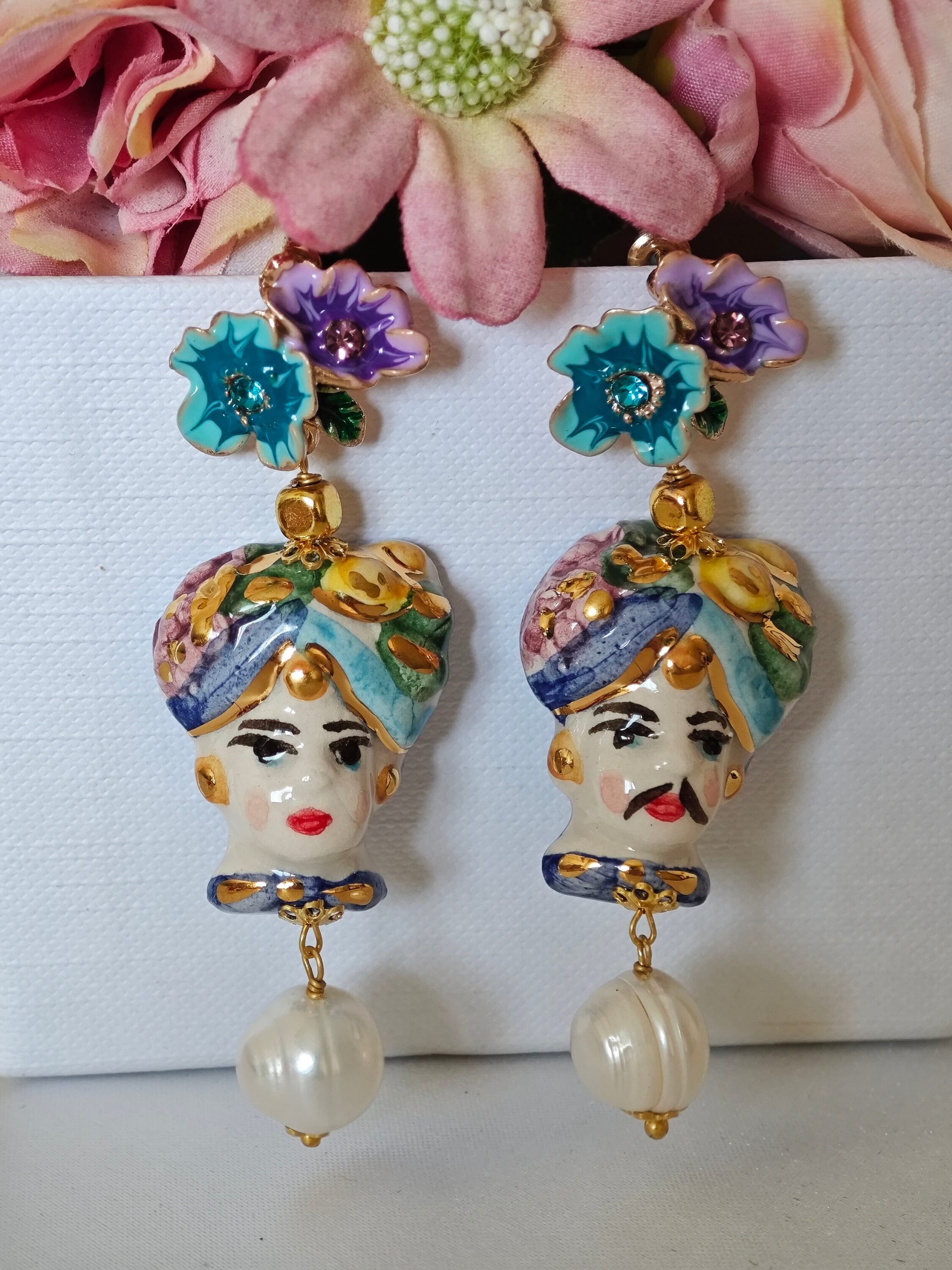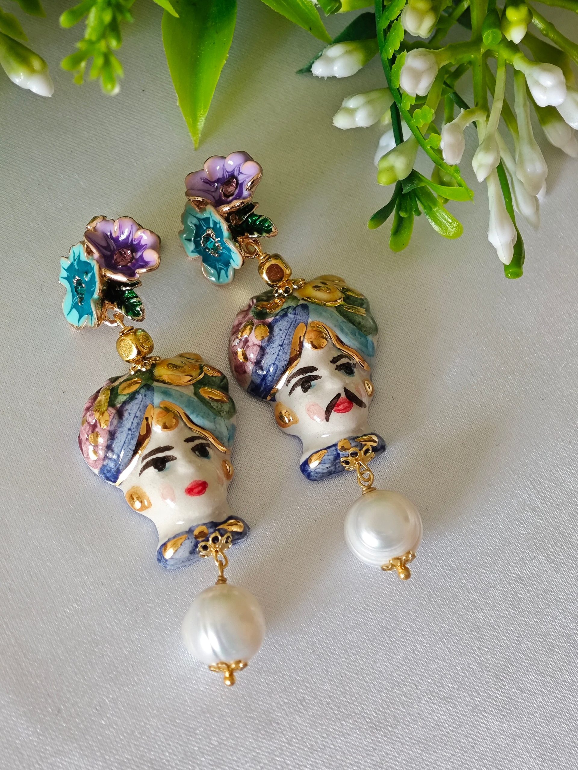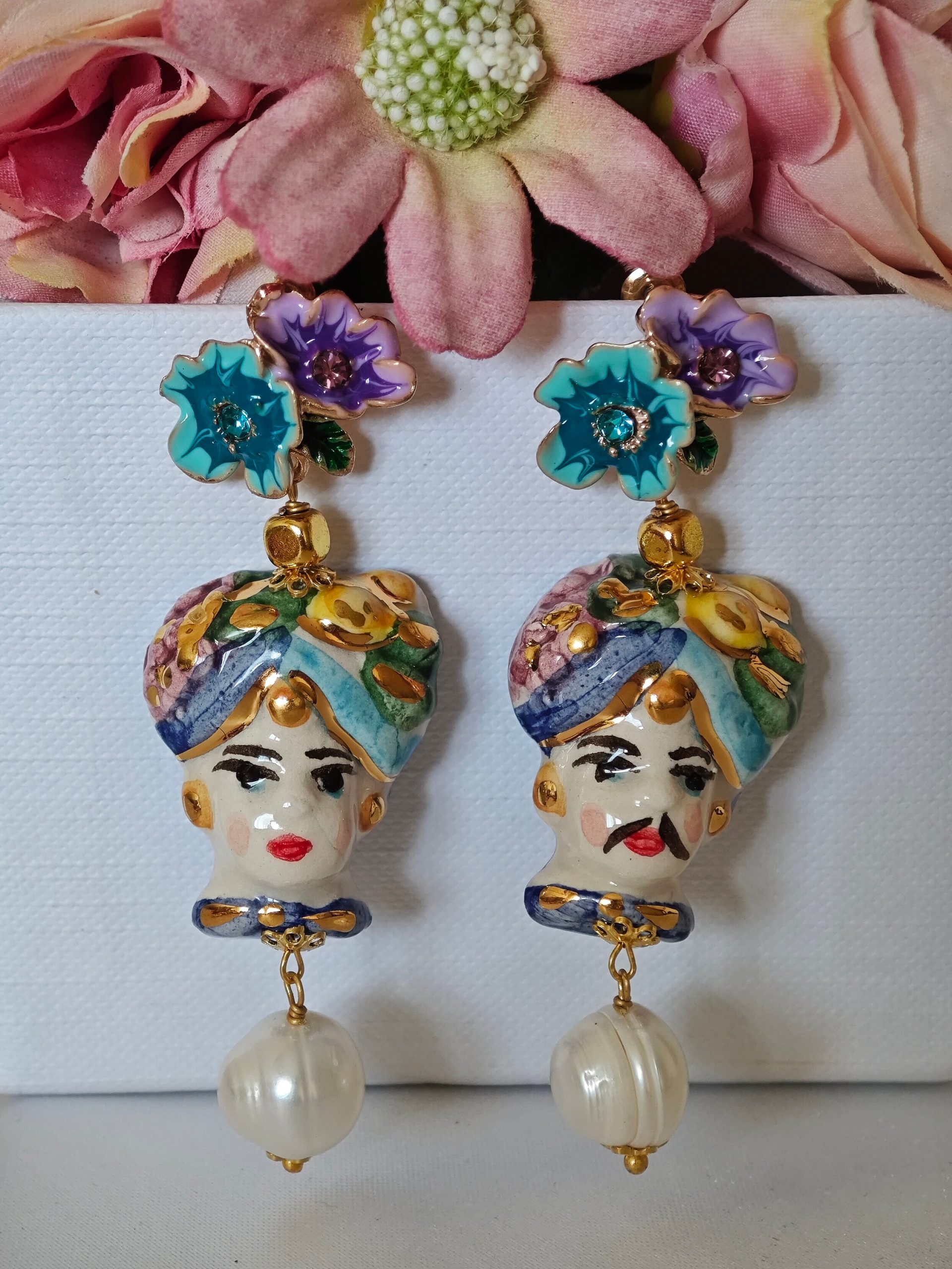 Orecchini pendenti con teste di moro in ceramica Caltagirone realizzate e dipinte a mano, con applicazioni foglia oro 22 kt , 3 cm dimensioni, perle bianche naturali ,chiusura a perno con i fiori in ottone smaltato , lunghezza totale 6 cm.