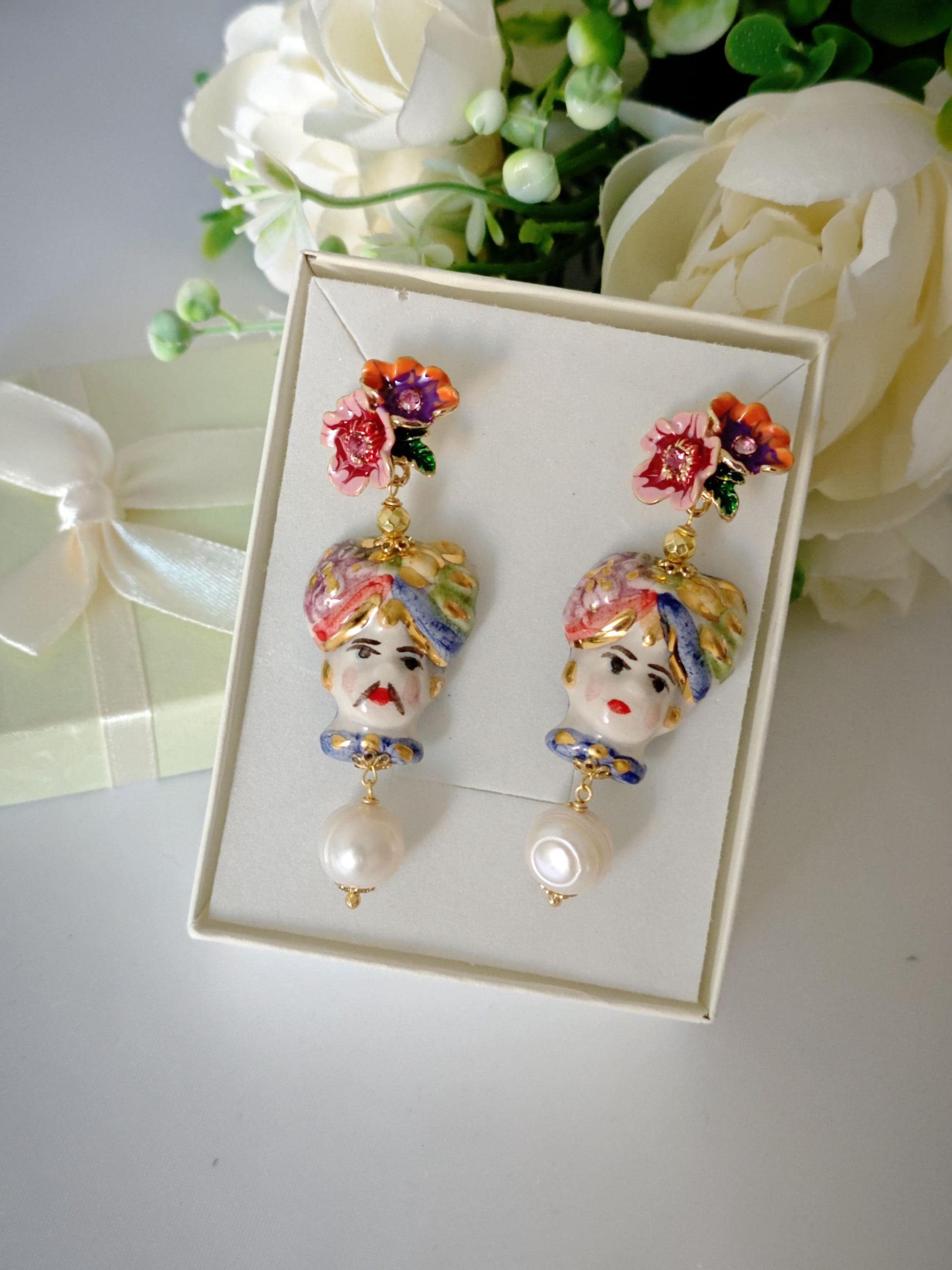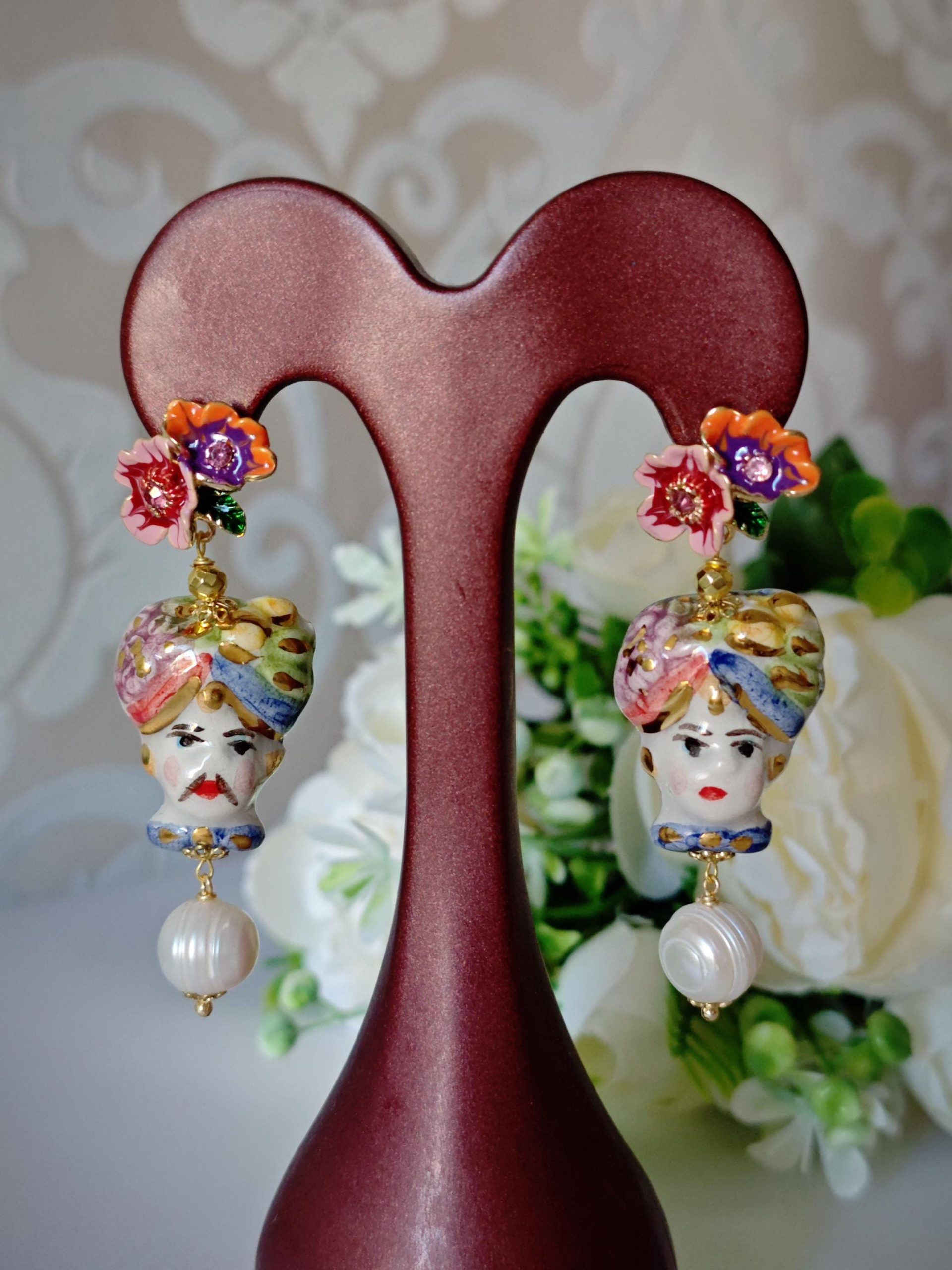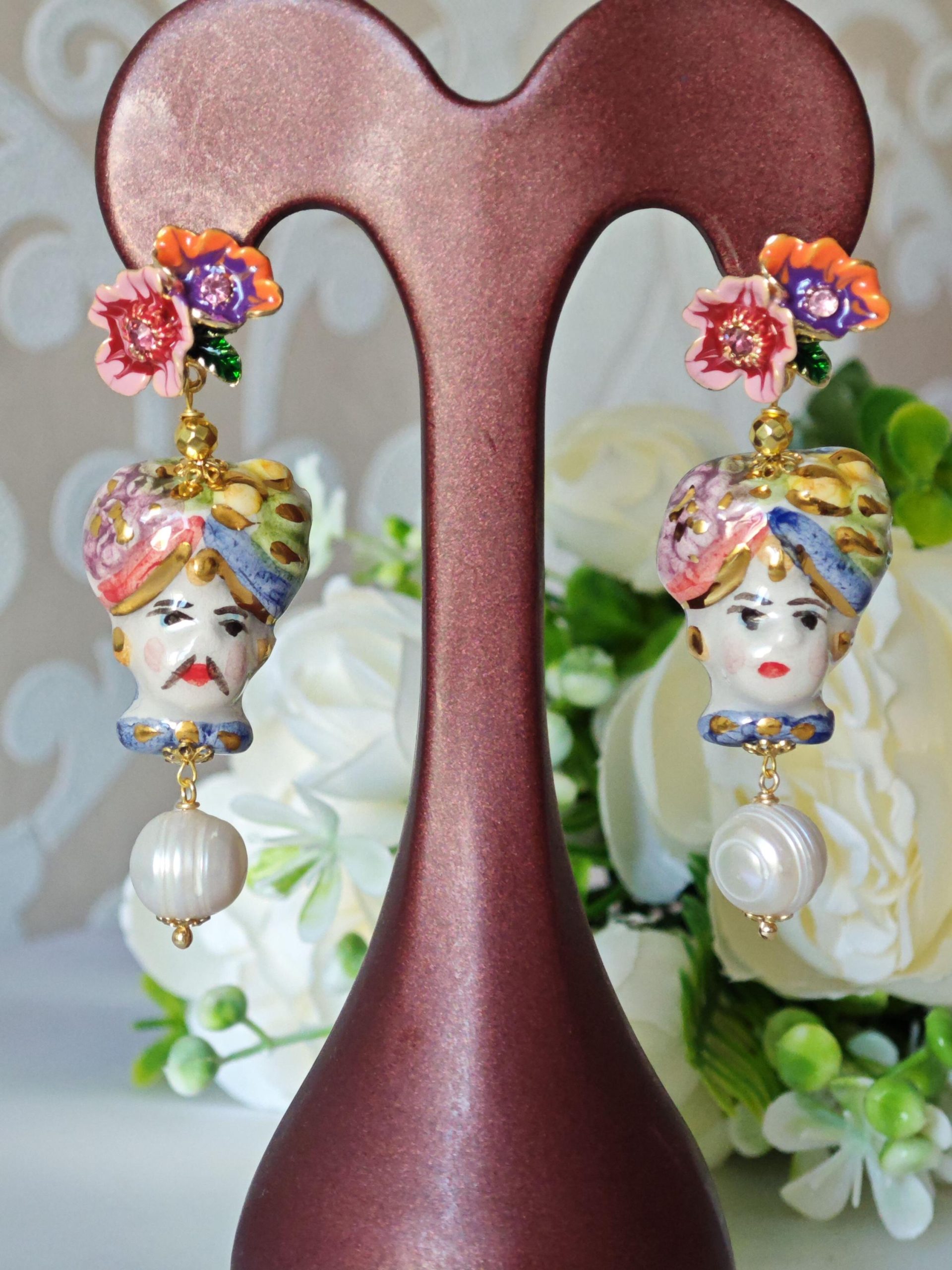 Orecchini ceramica Caltagirone e perle bianche , orecchini teste di moro e fiori smaltati, orecchini siciliani