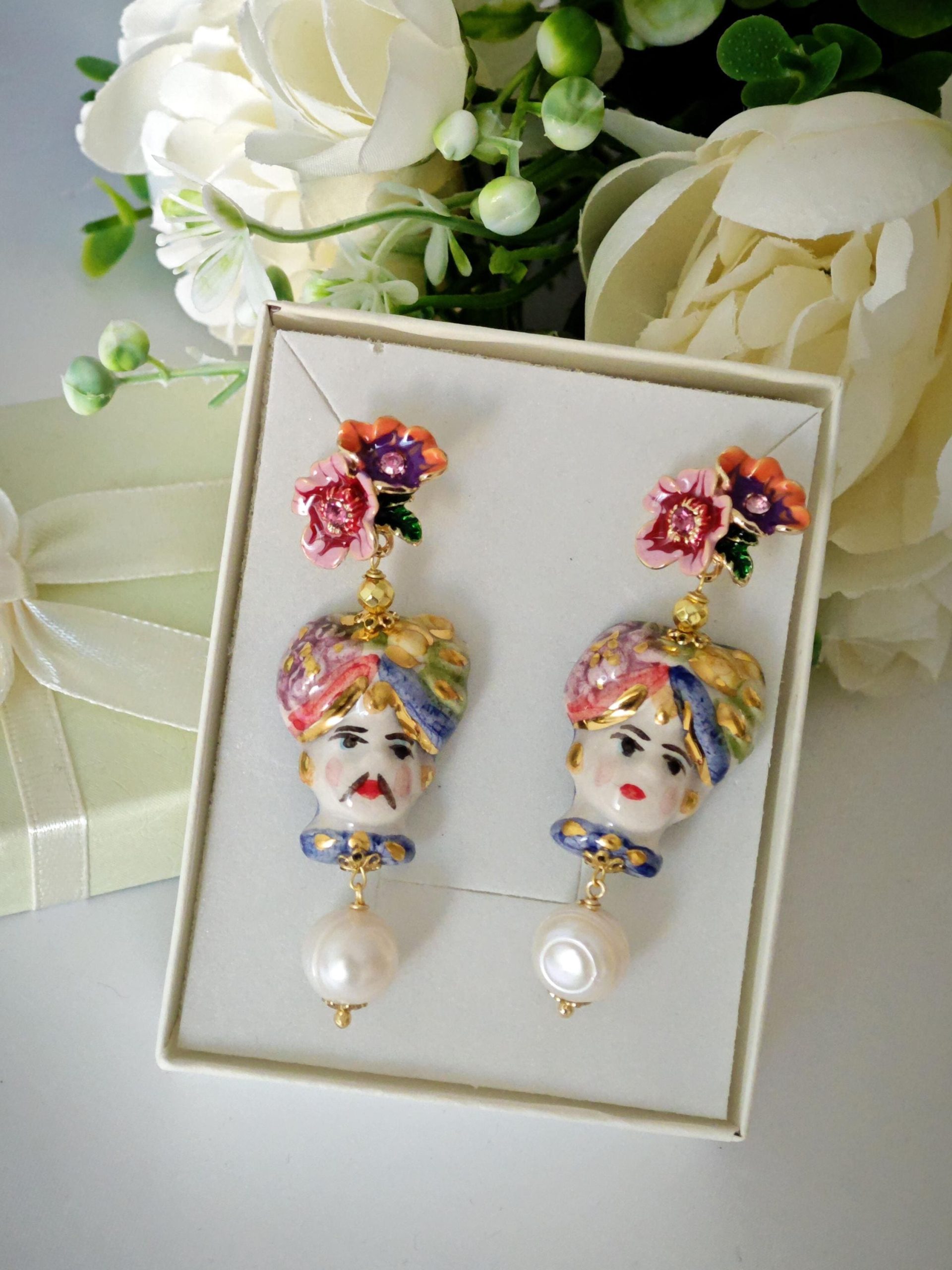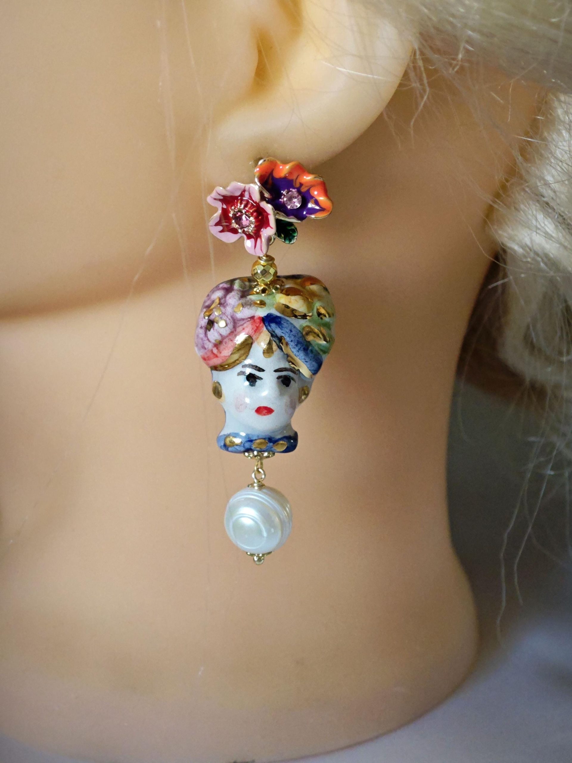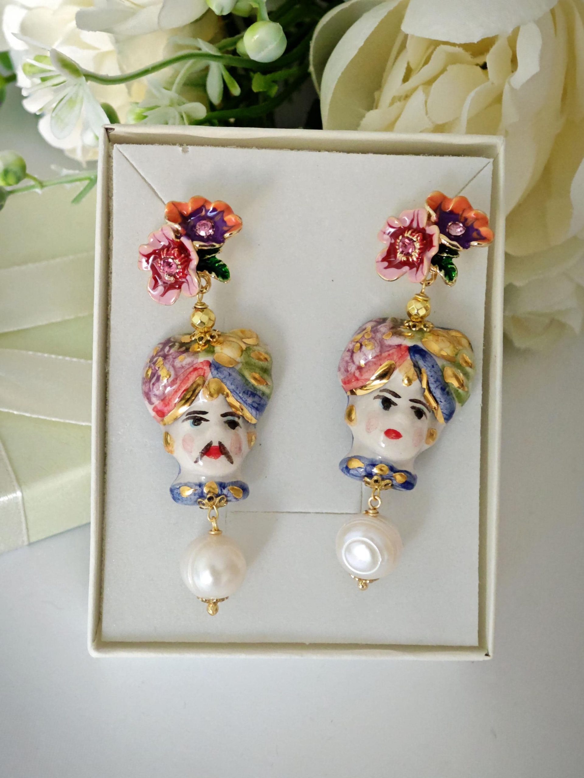 Orecchini ceramica Caltagirone e perle bianche , orecchini teste di moro e fiori smaltati, orecchini siciliani