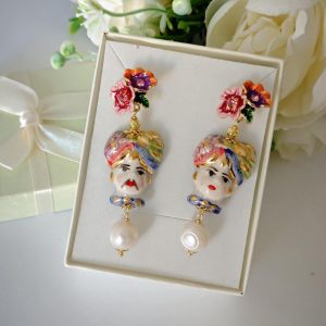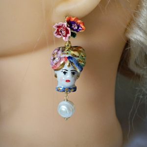 Orecchini ceramica Caltagirone , orecchini teste di moro con fiori smaltati, orecchini siciliani