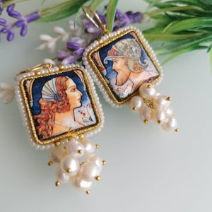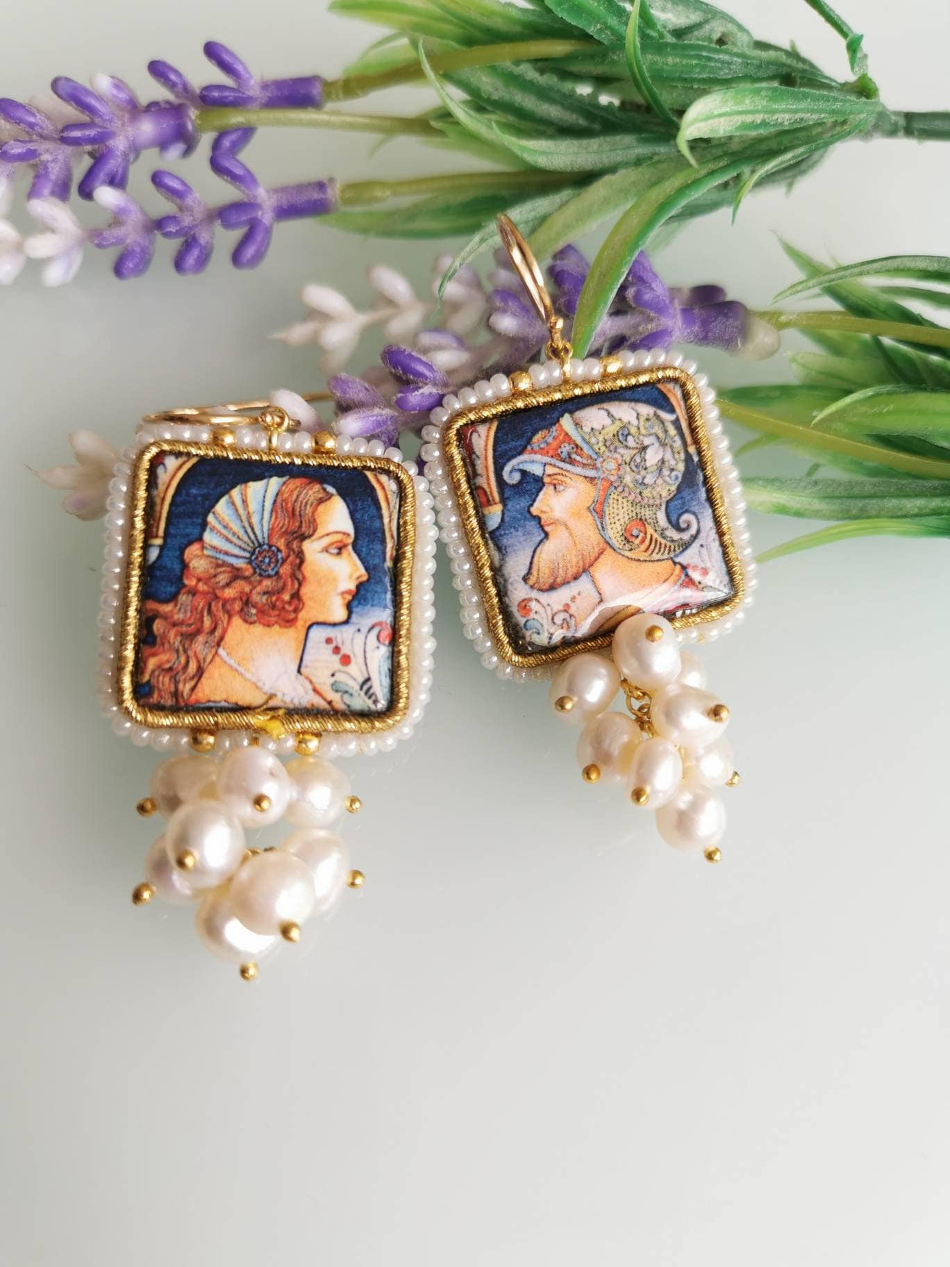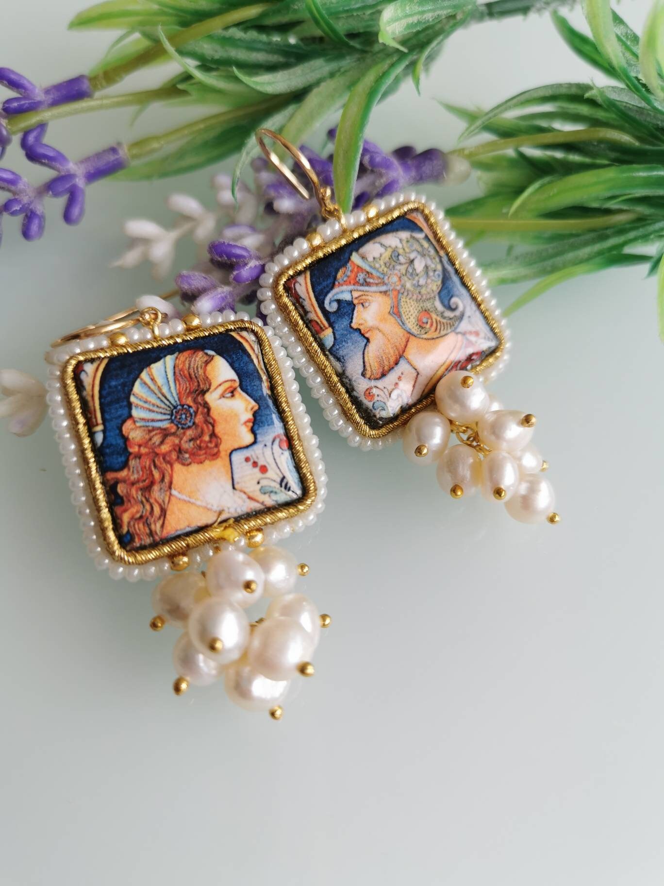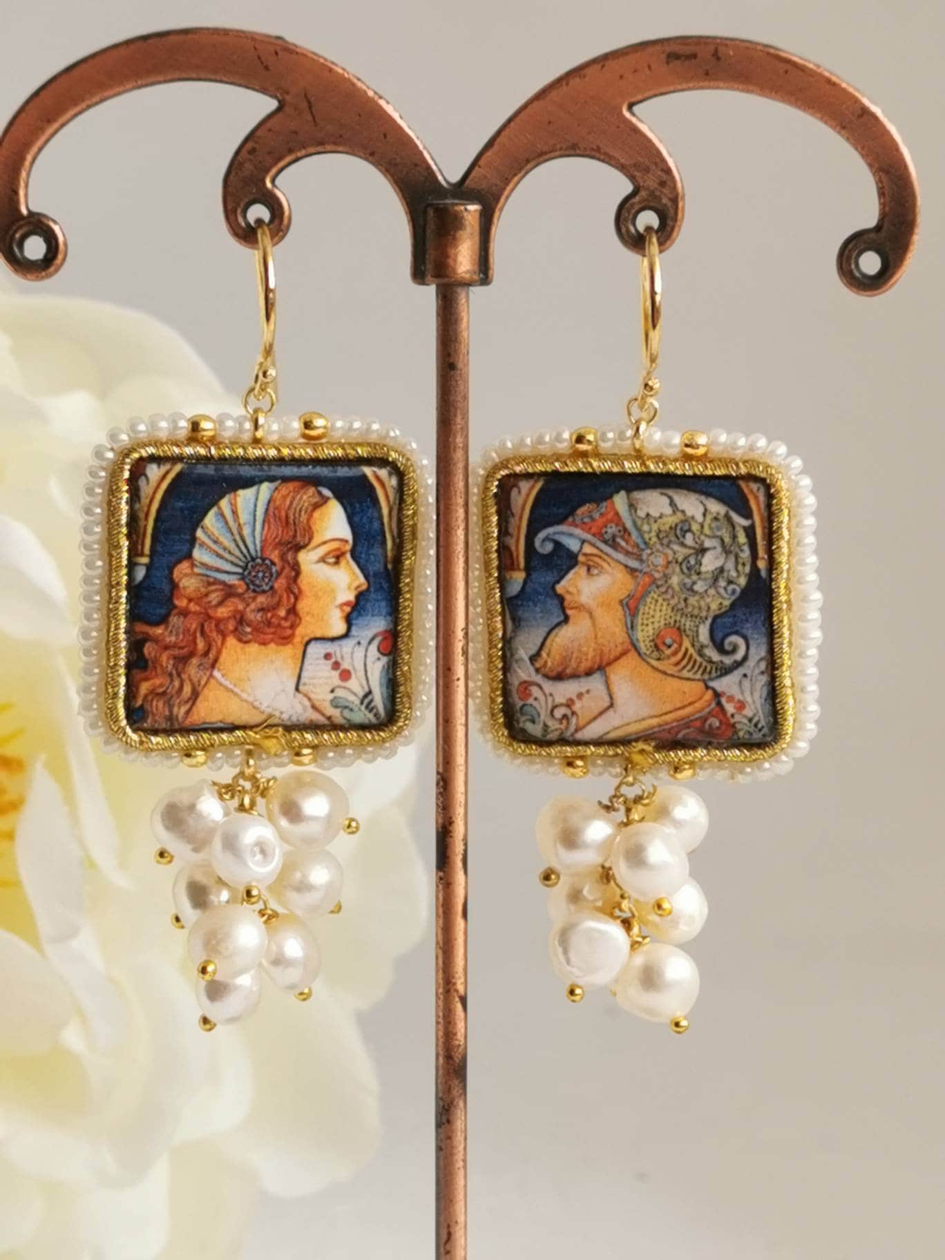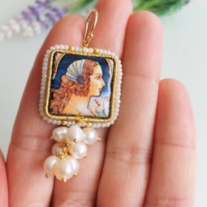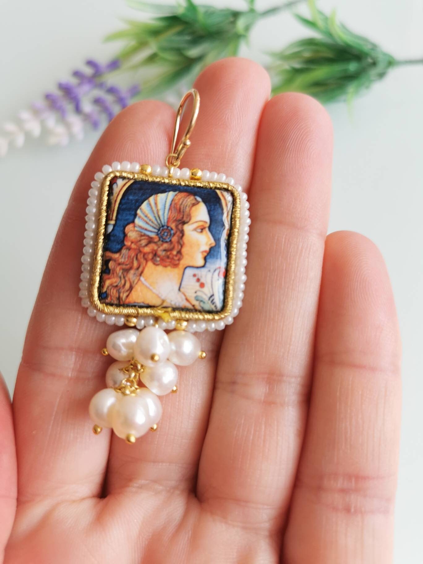 Orecchini piastrelle ceramica Caltagirone con grappolo perle bianche  , orecchini siciliani