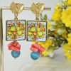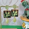 Orecchini pendenti con piastrelle pietra lavica smaltata con motivi Caltagirone realizzata a mano 2×2 cm grappolo perle bianche naturali , monachelle placcato oro , lunghezza totale 6 cm.