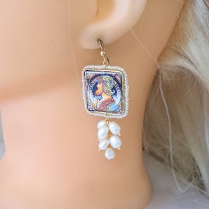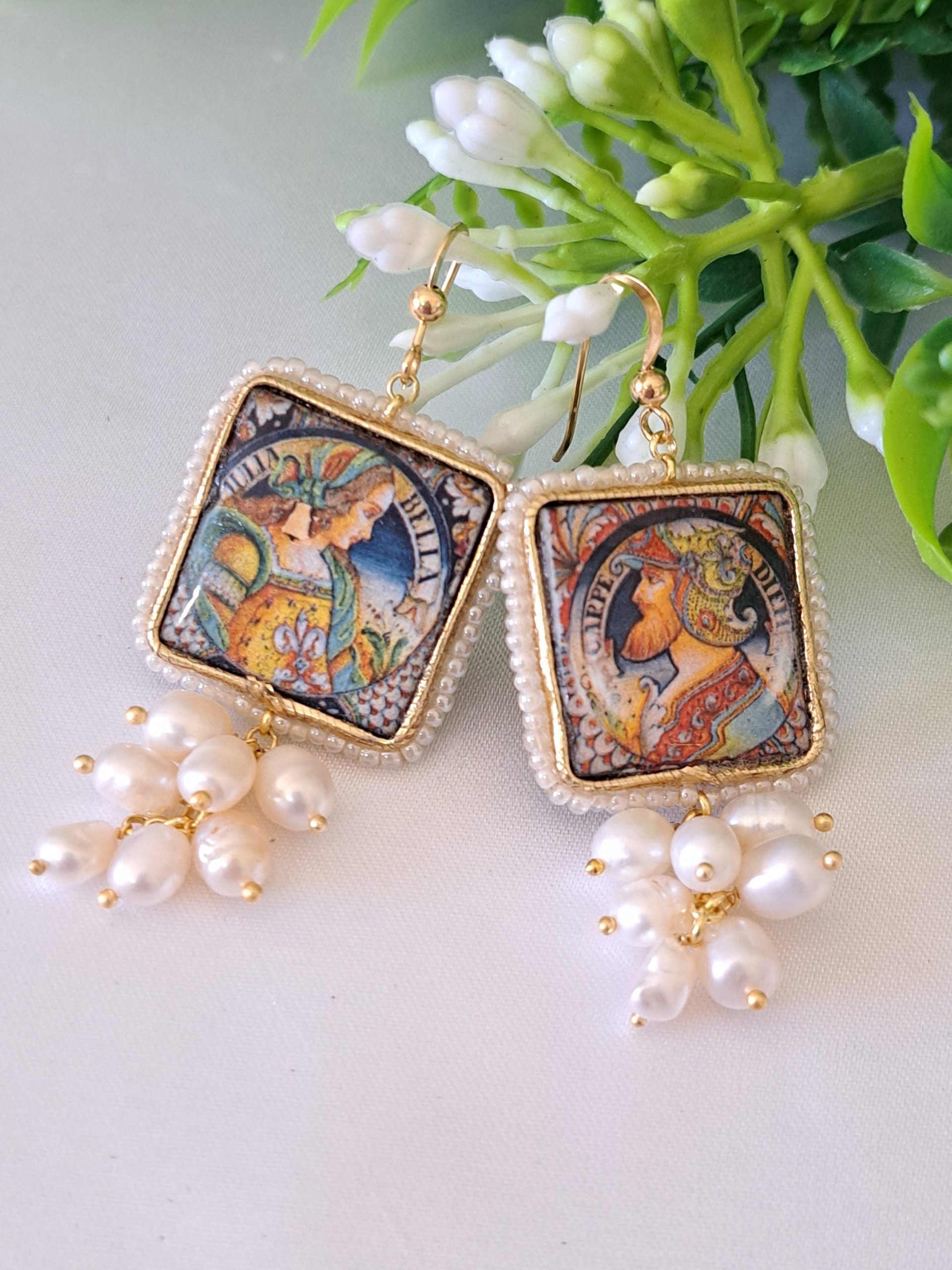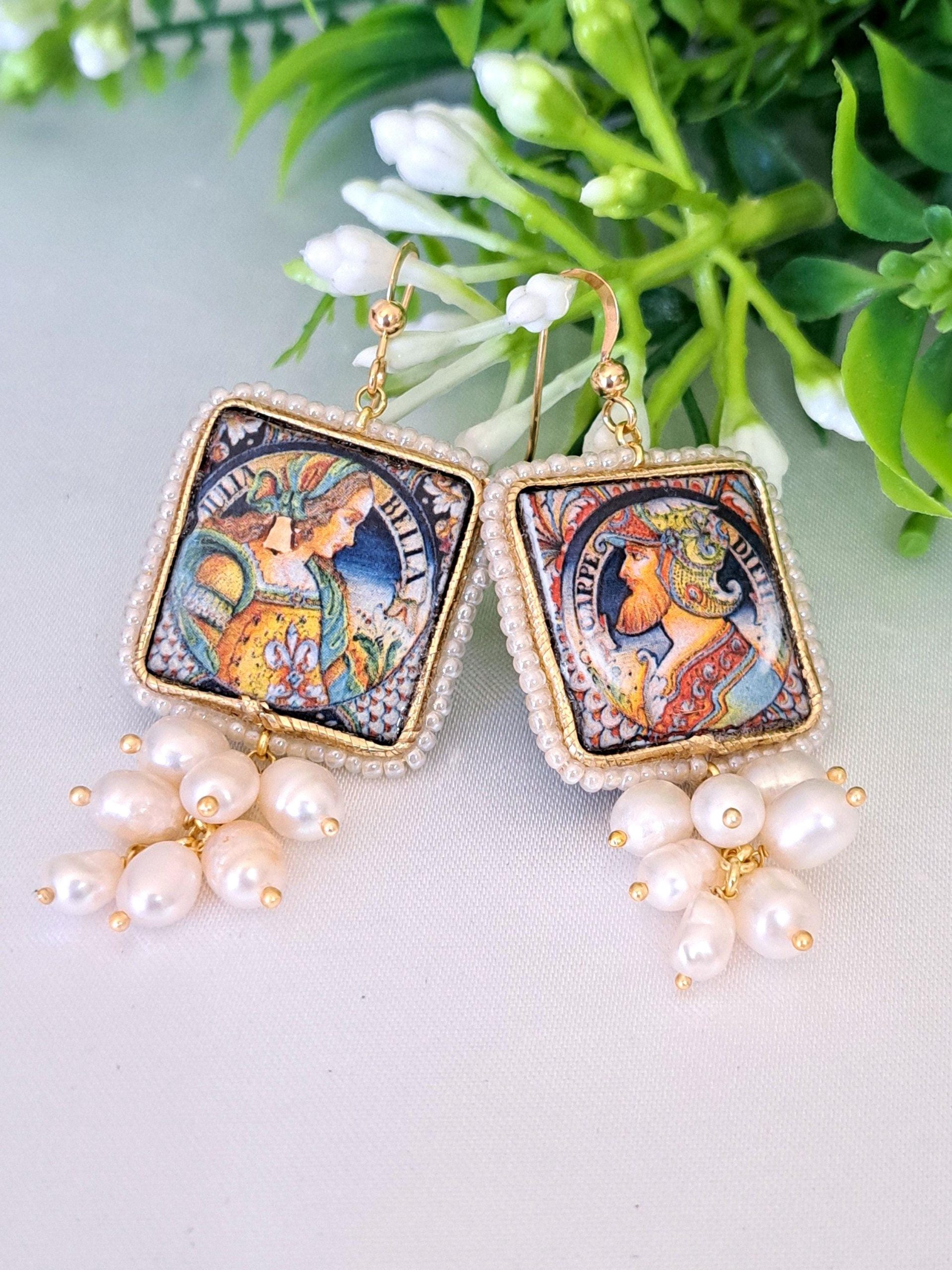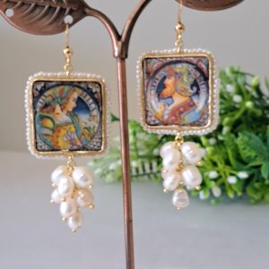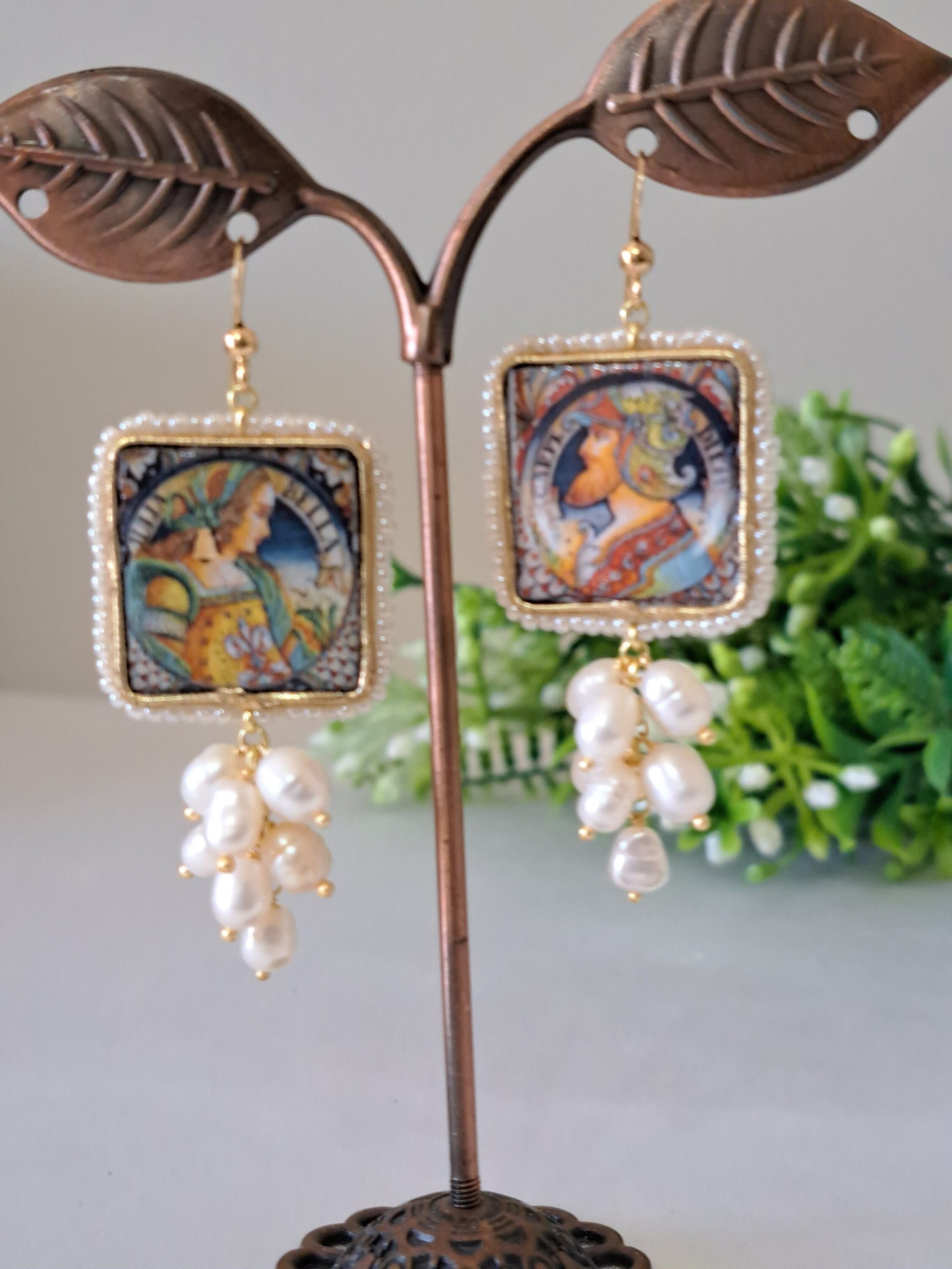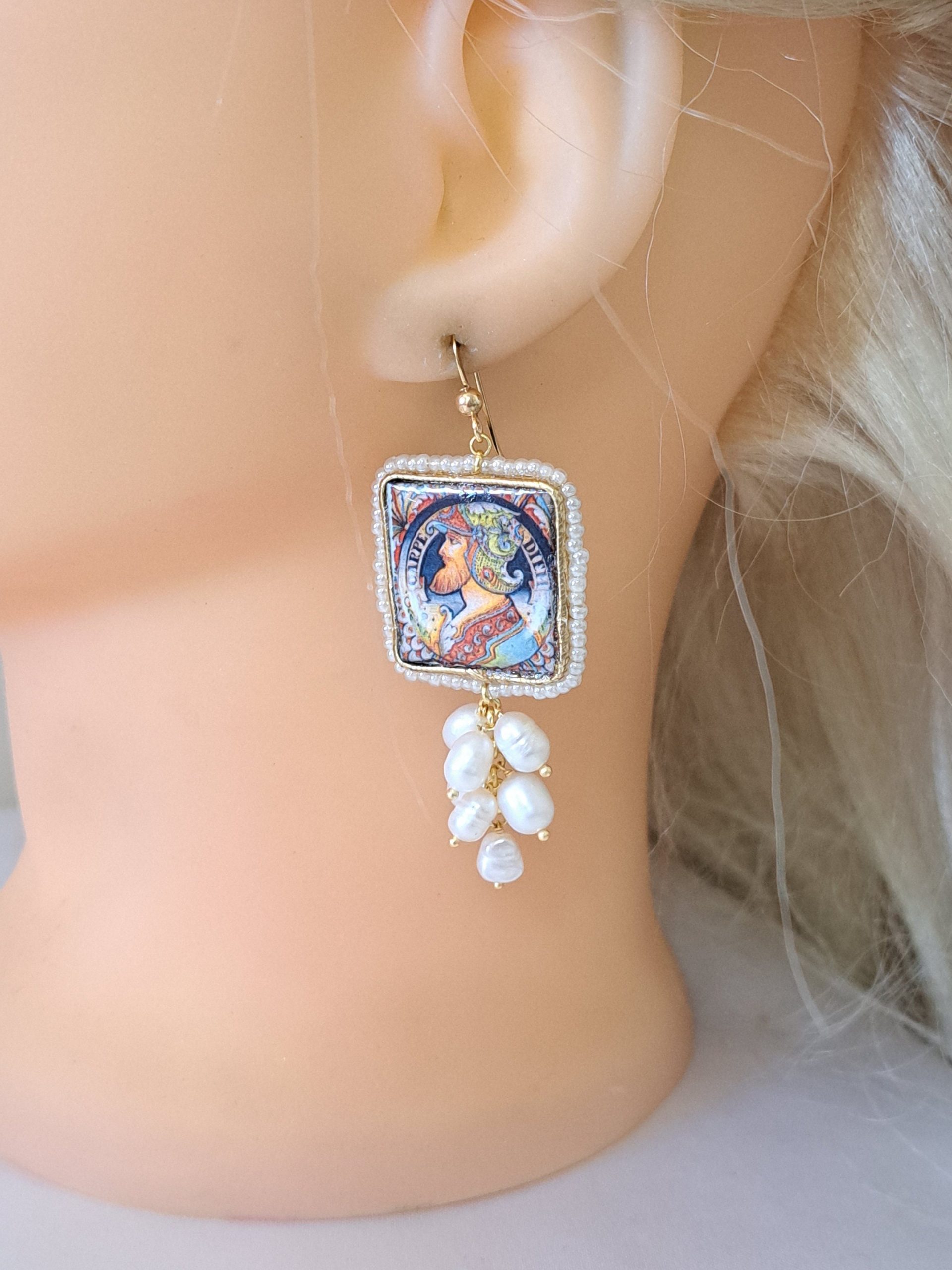 Orecchini pendenti con piastrelle pietra lavica smaltata con motivi Caltagirone realizzata a mano 2×2 cm grappolo perle bianche naturali , monachelle placcato oro , lunghezza totale 6 cm.