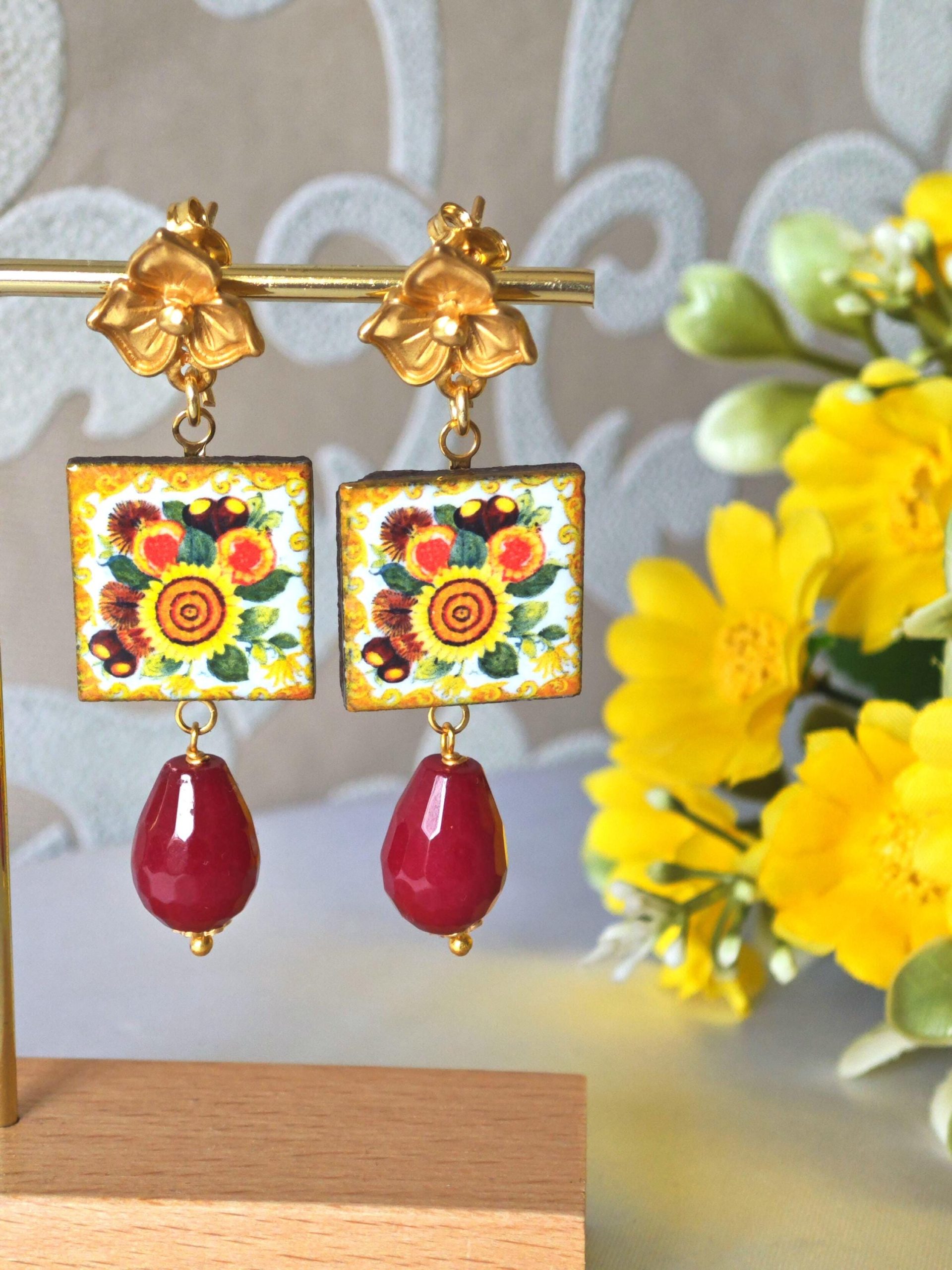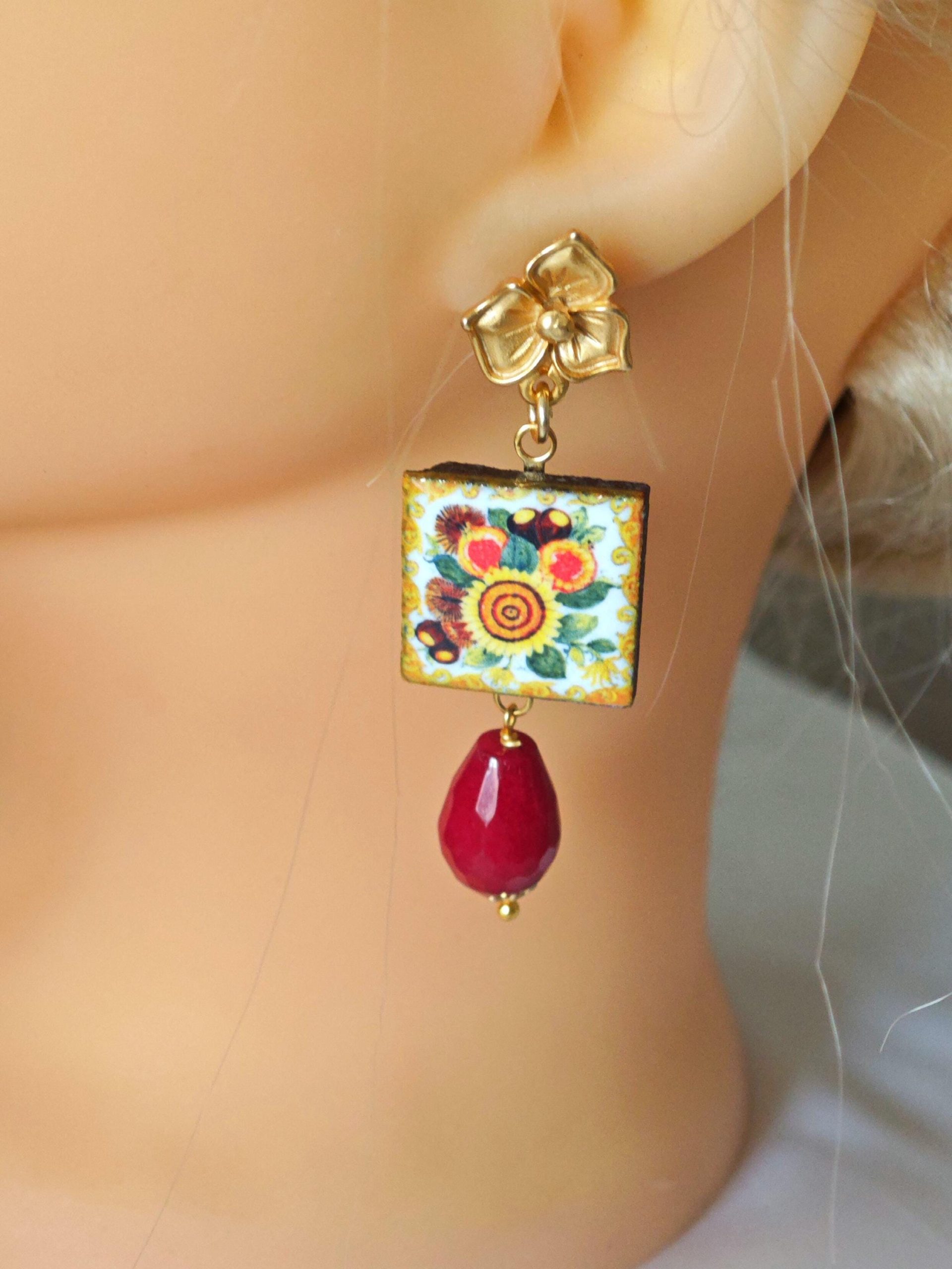 Orecchini pendenti con piastrelle in pietra lavica smaltata con motivi Caltagirone realizzata a mano 2×2 cm dimensioni, gocce ceramica rosso bordeaux , chiusura a perno con farfallina a forma di fiori in ottone dorato satinato.