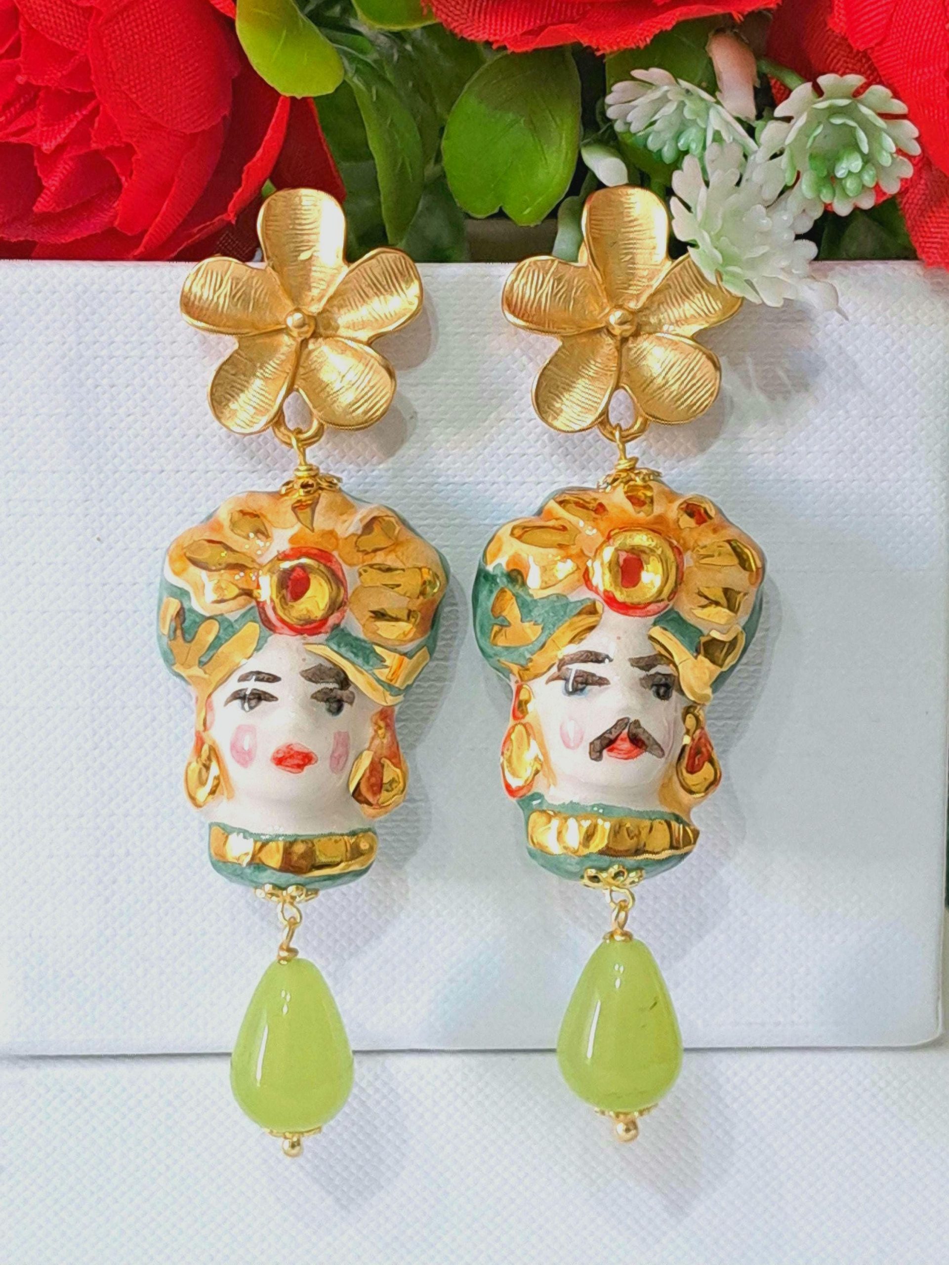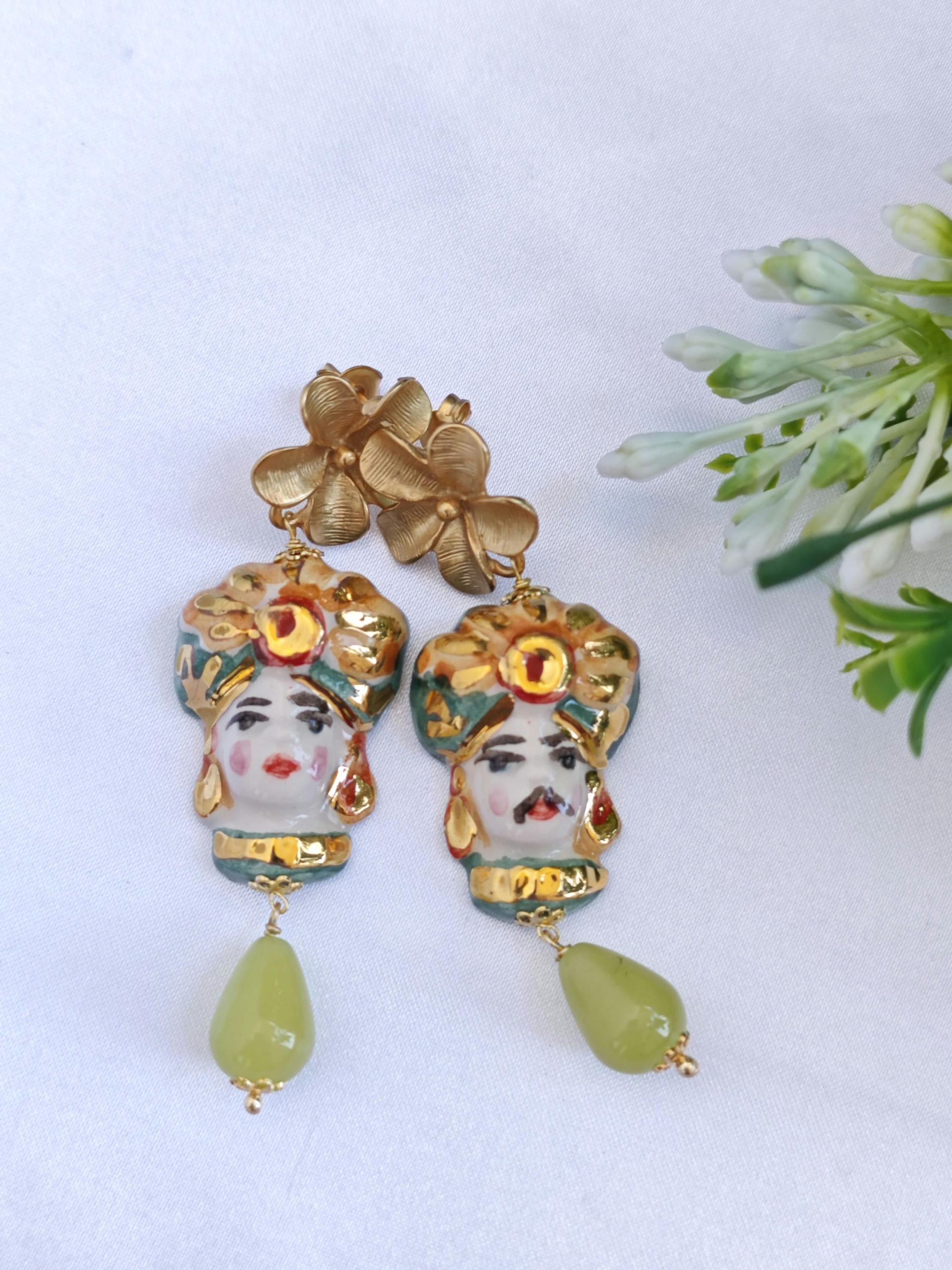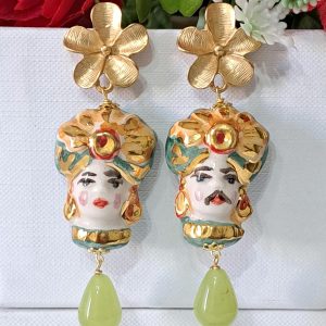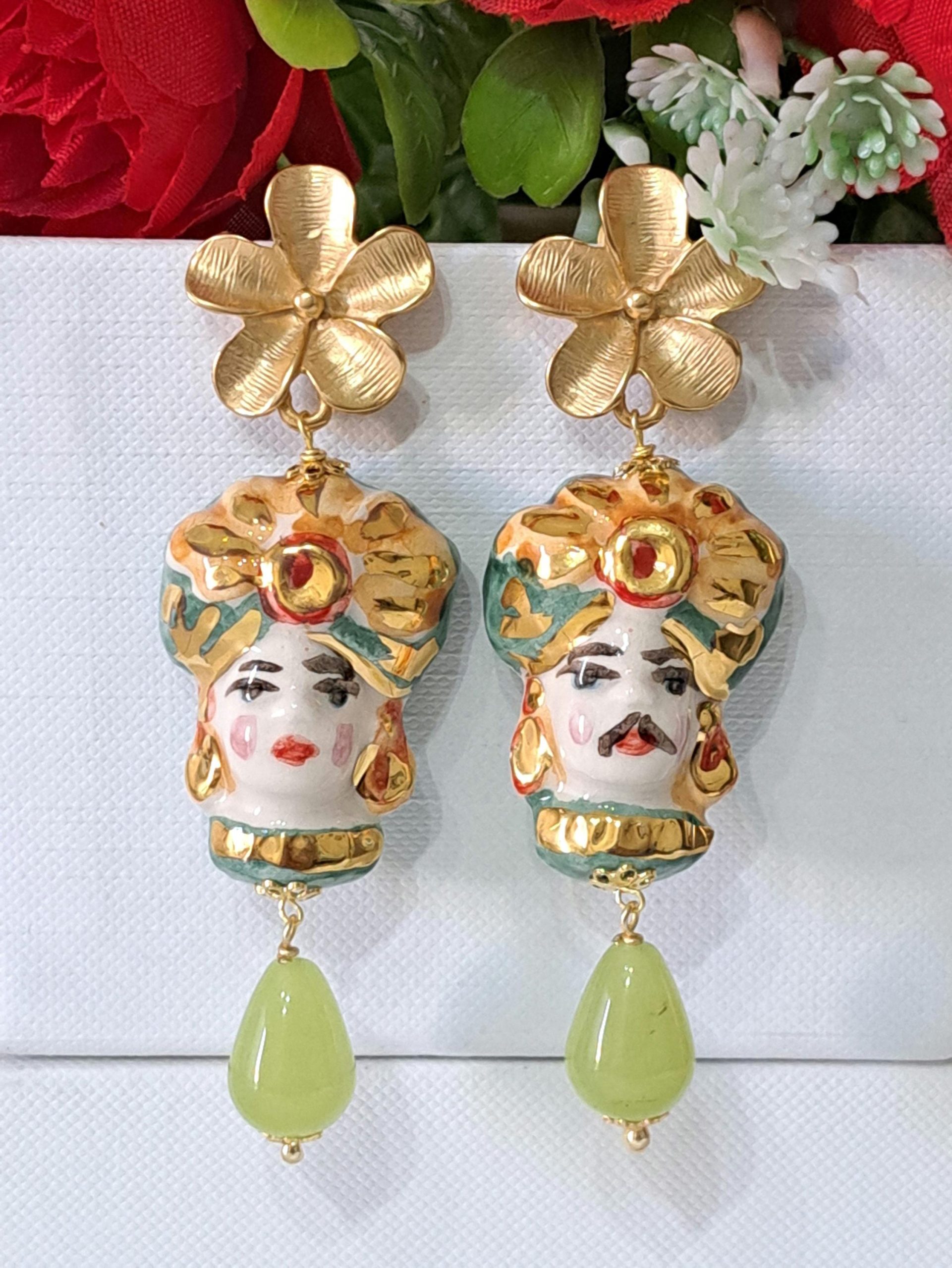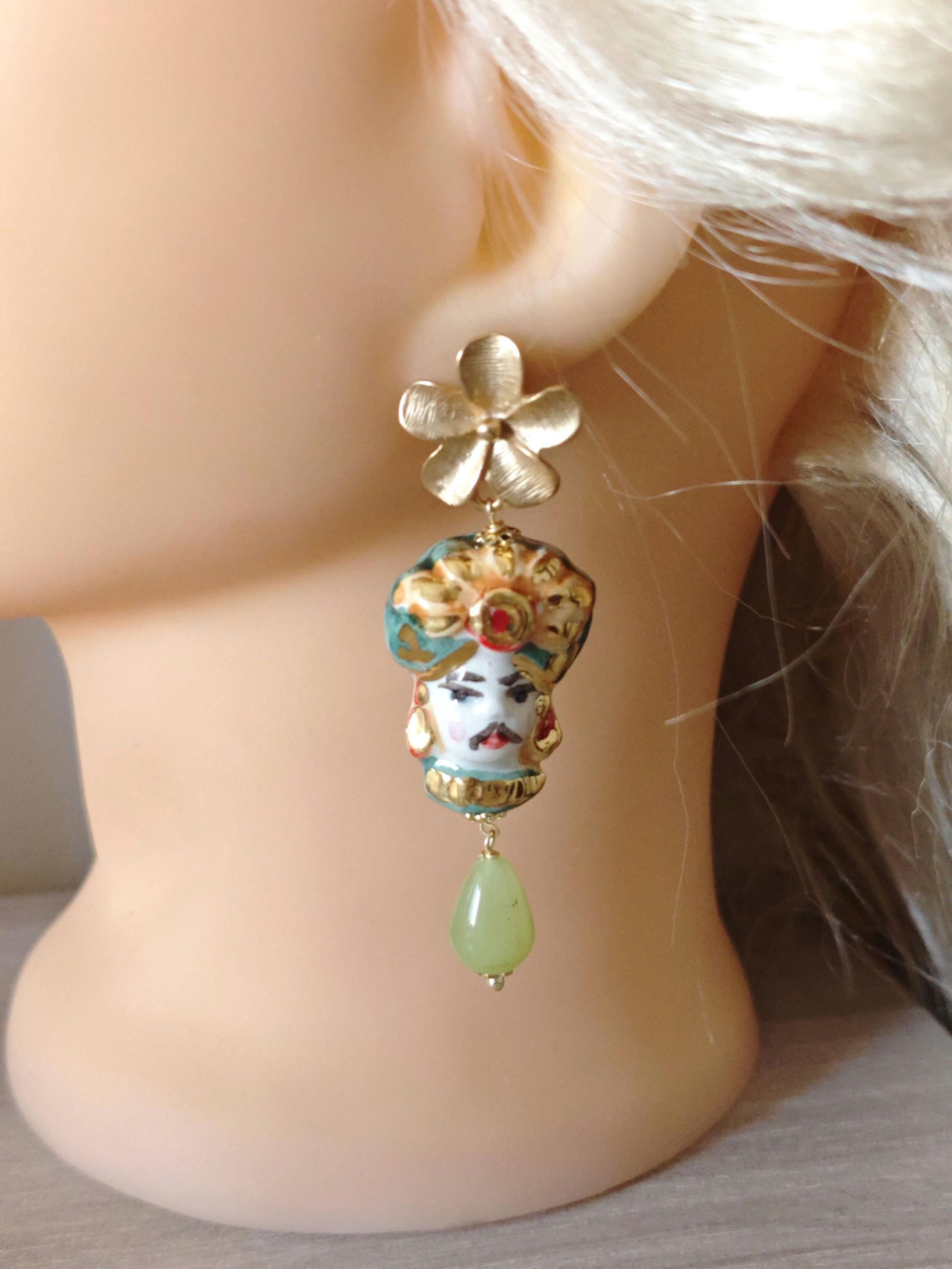 Orecchini pendenti con teste di moro in ceramica Caltagirone realizzate e dipinte a mano, con applicazioni foglia oro 22 kt , 3 cm dimensioni, pietre dure a goccia in quarzo verde ,chiusura a perno con farfallina a forma di fiori in ottone dorato satinato.