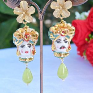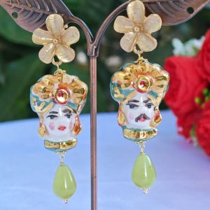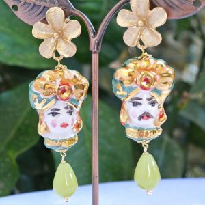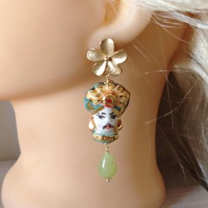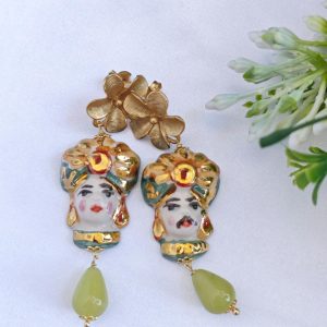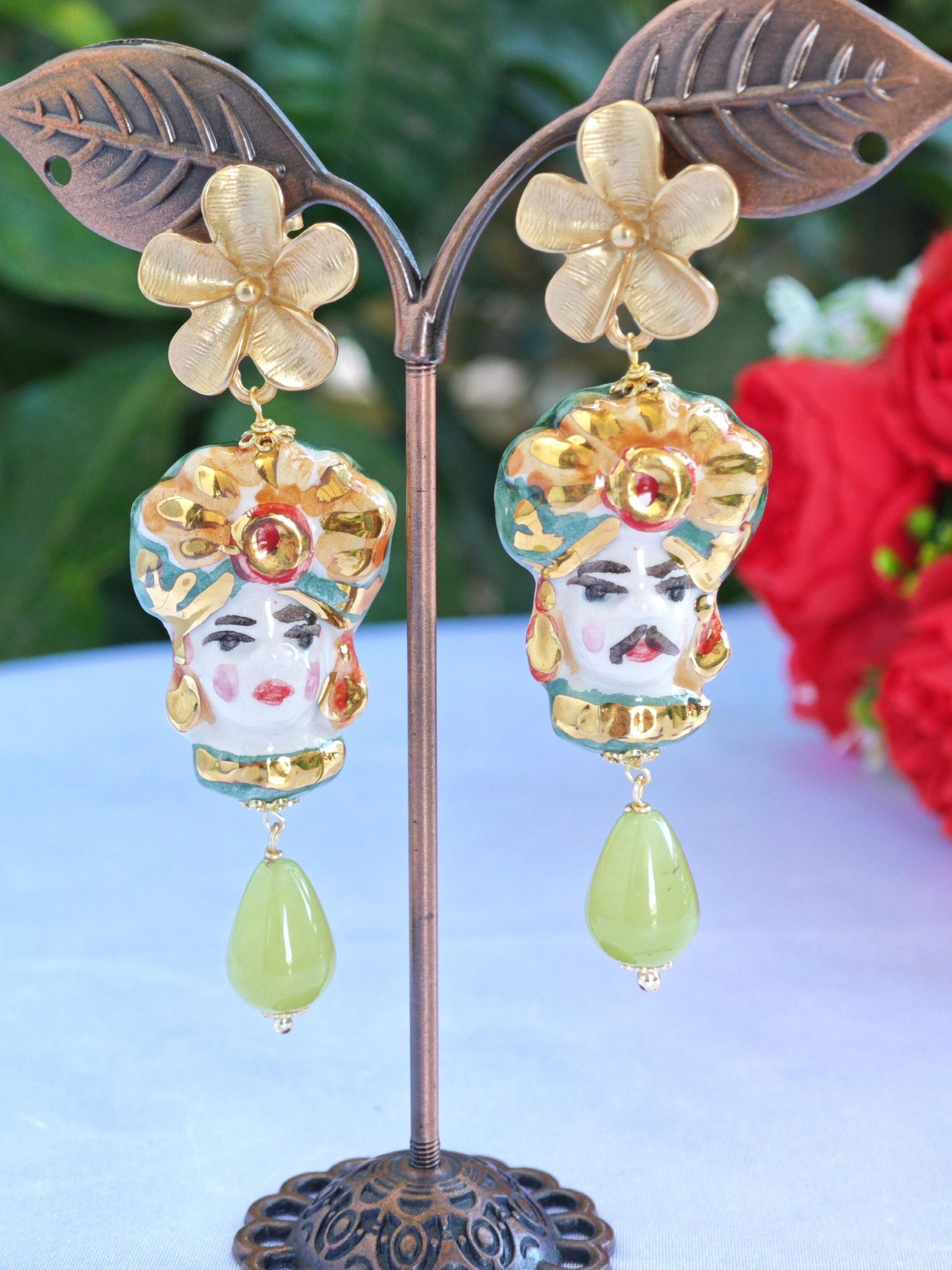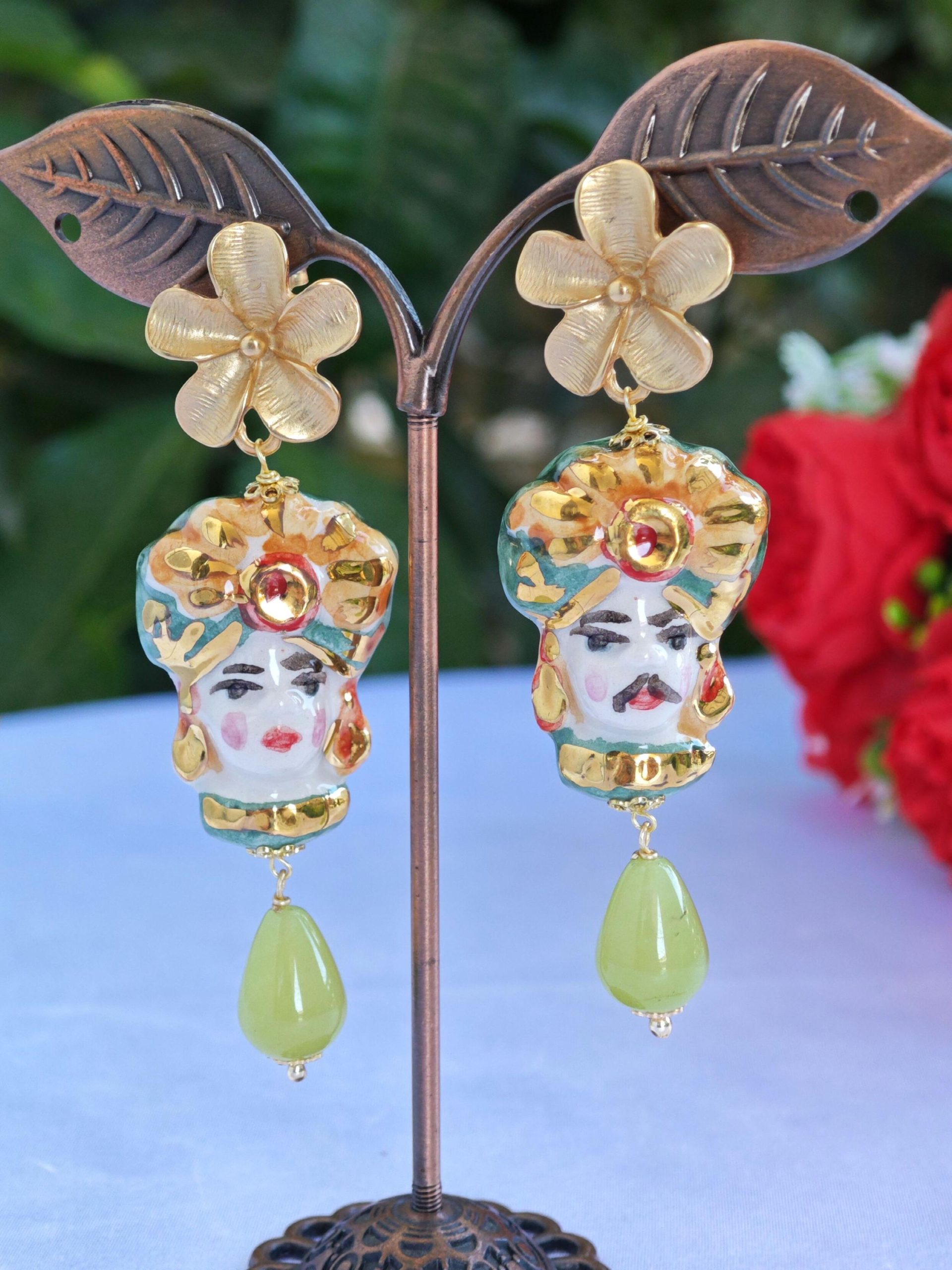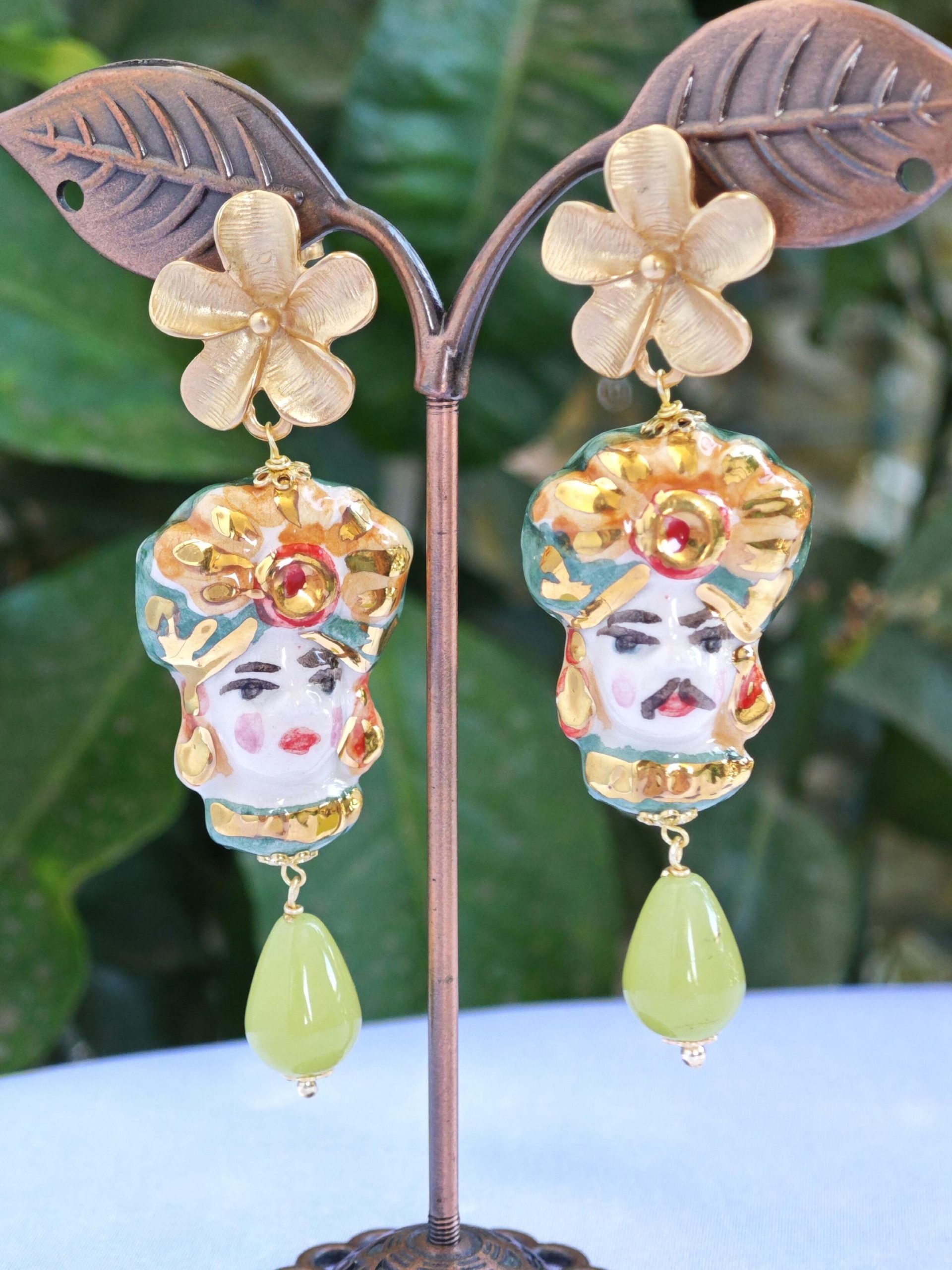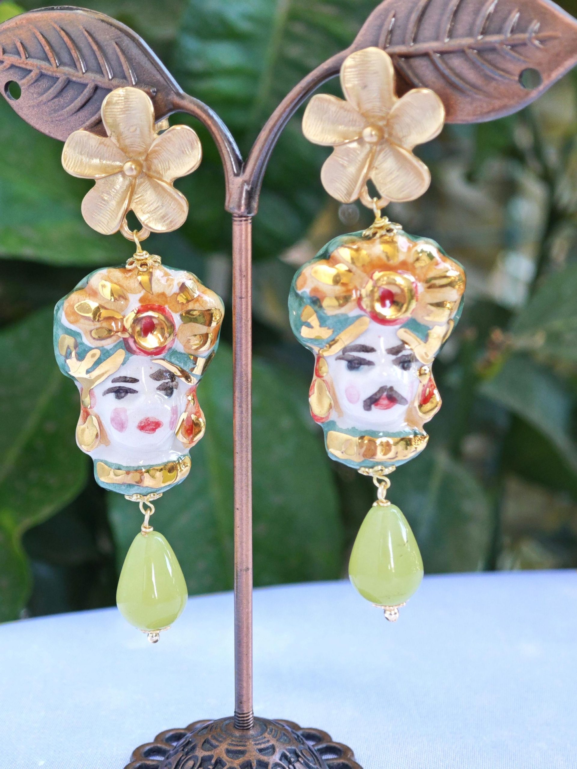 Orecchini pendenti con teste di moro in ceramica Caltagirone realizzate e dipinte a mano, con applicazioni foglia oro 22 kt , 3 cm dimensioni, pietre dure a goccia in quarzo verde ,chiusura a perno con farfallina a forma di fiori in ottone dorato satinato.