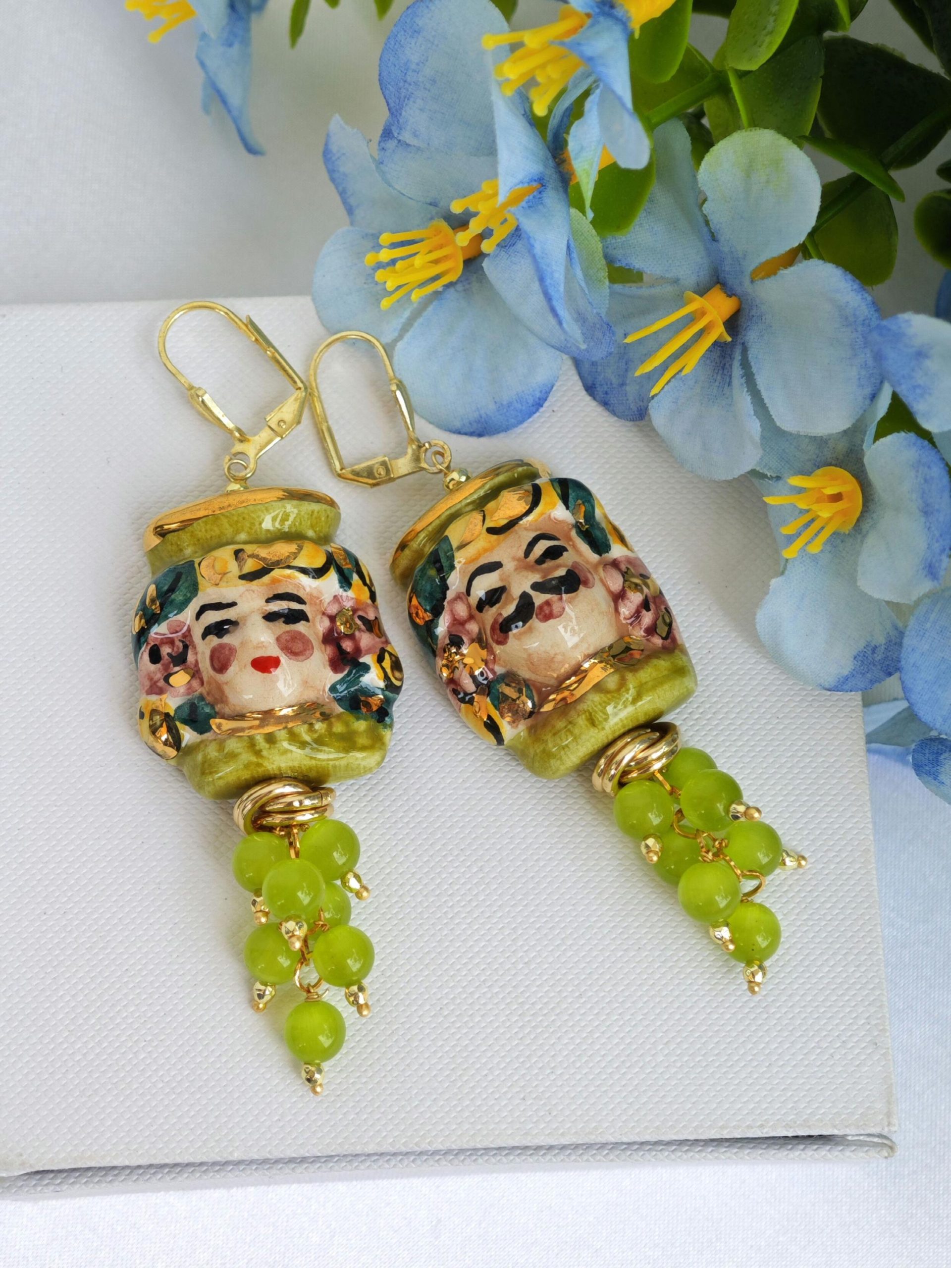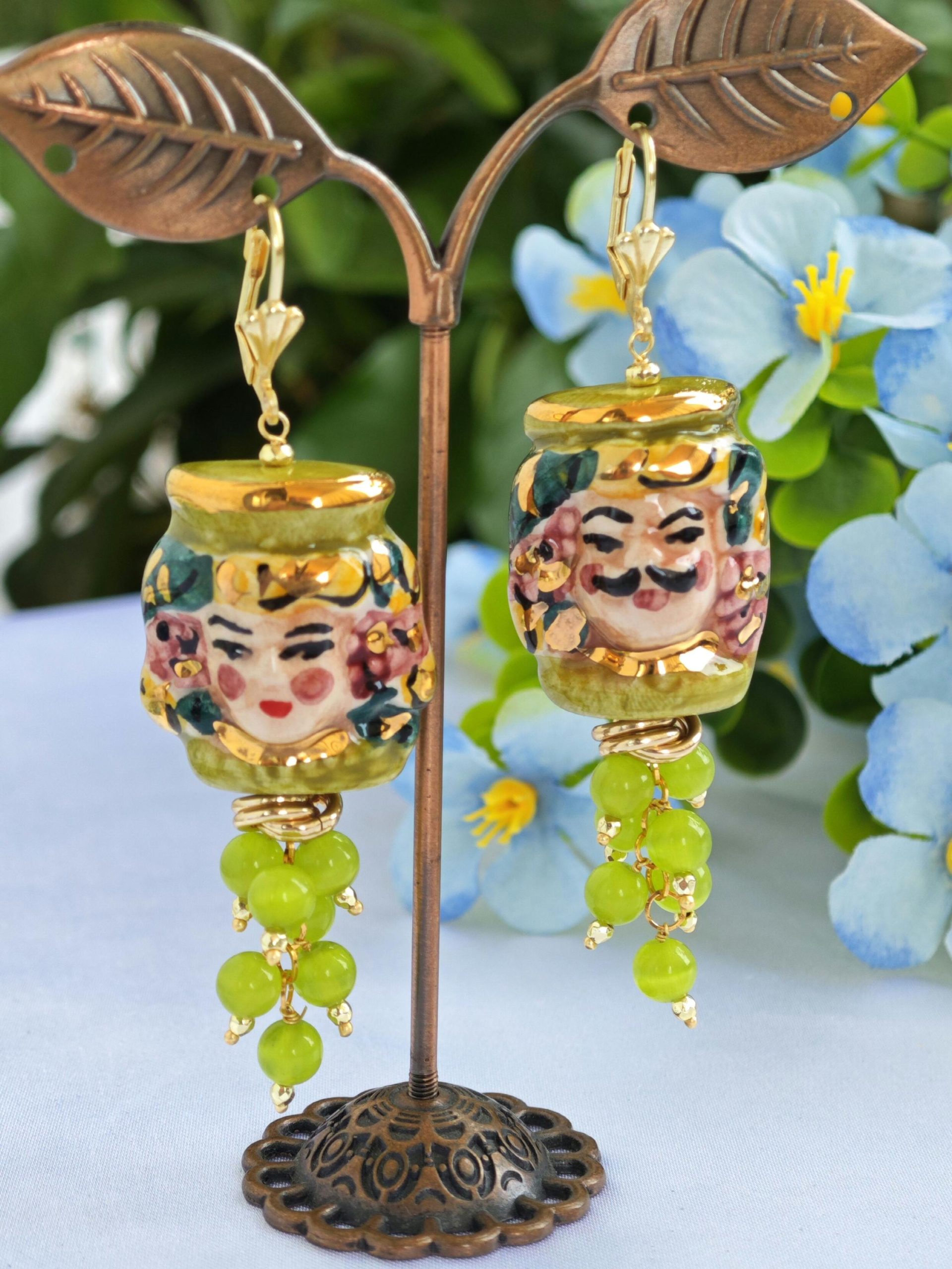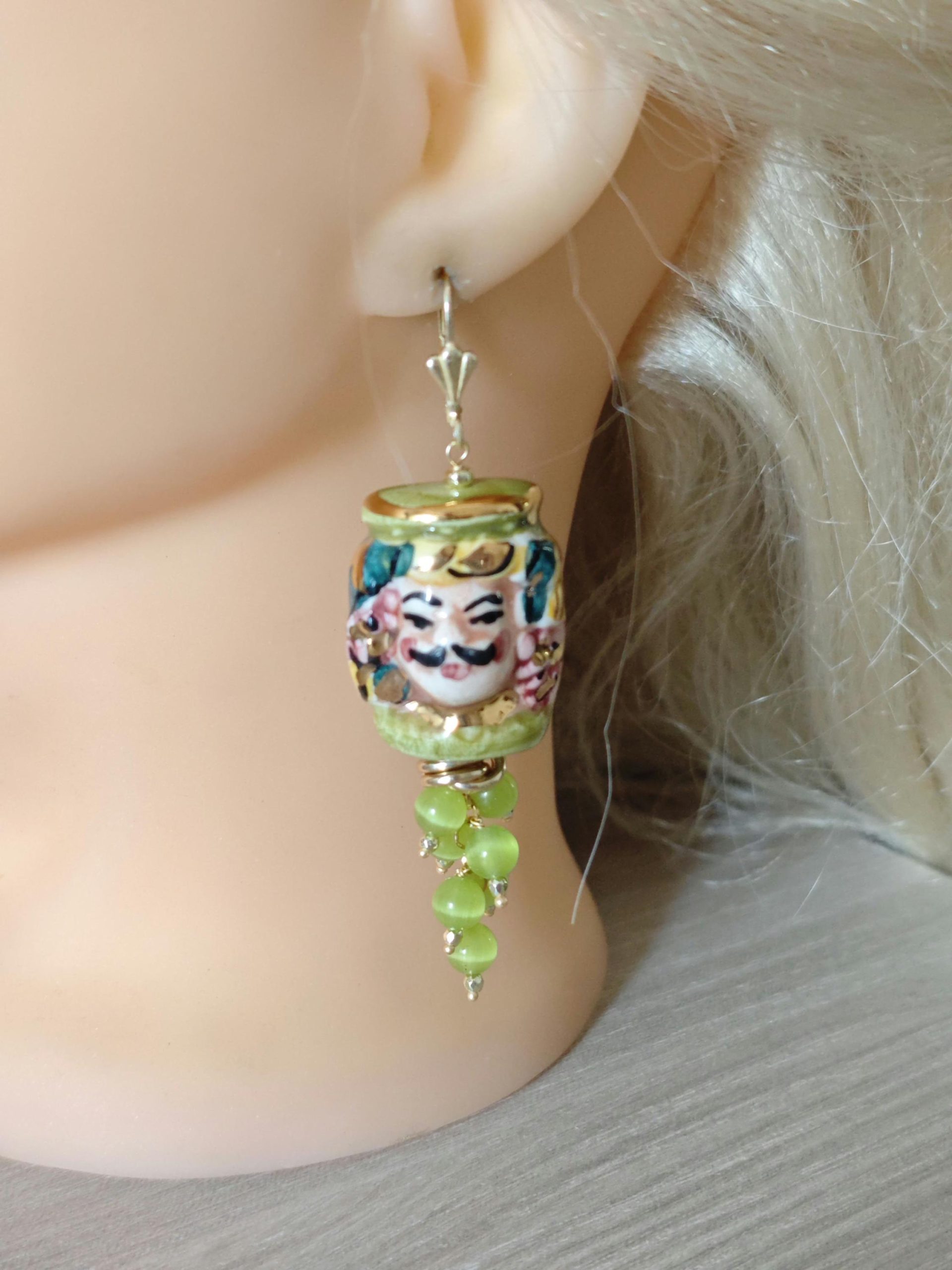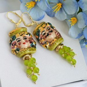 Orecchini ceramica Caltagirone, orecchini grappolo pietre quarzo verde, orecchini teste di moro siciliani