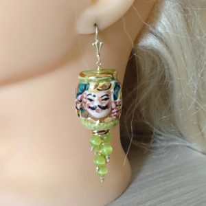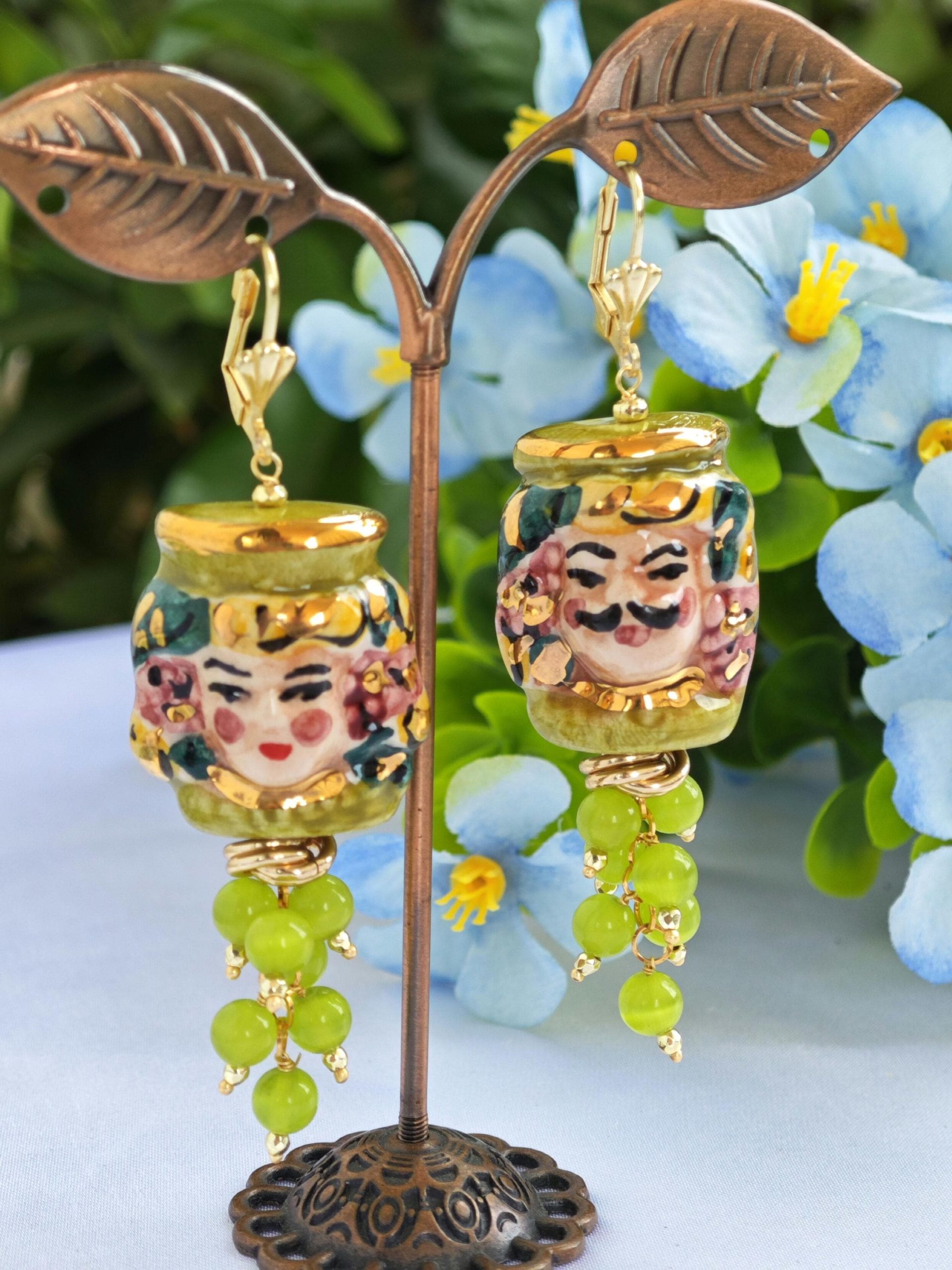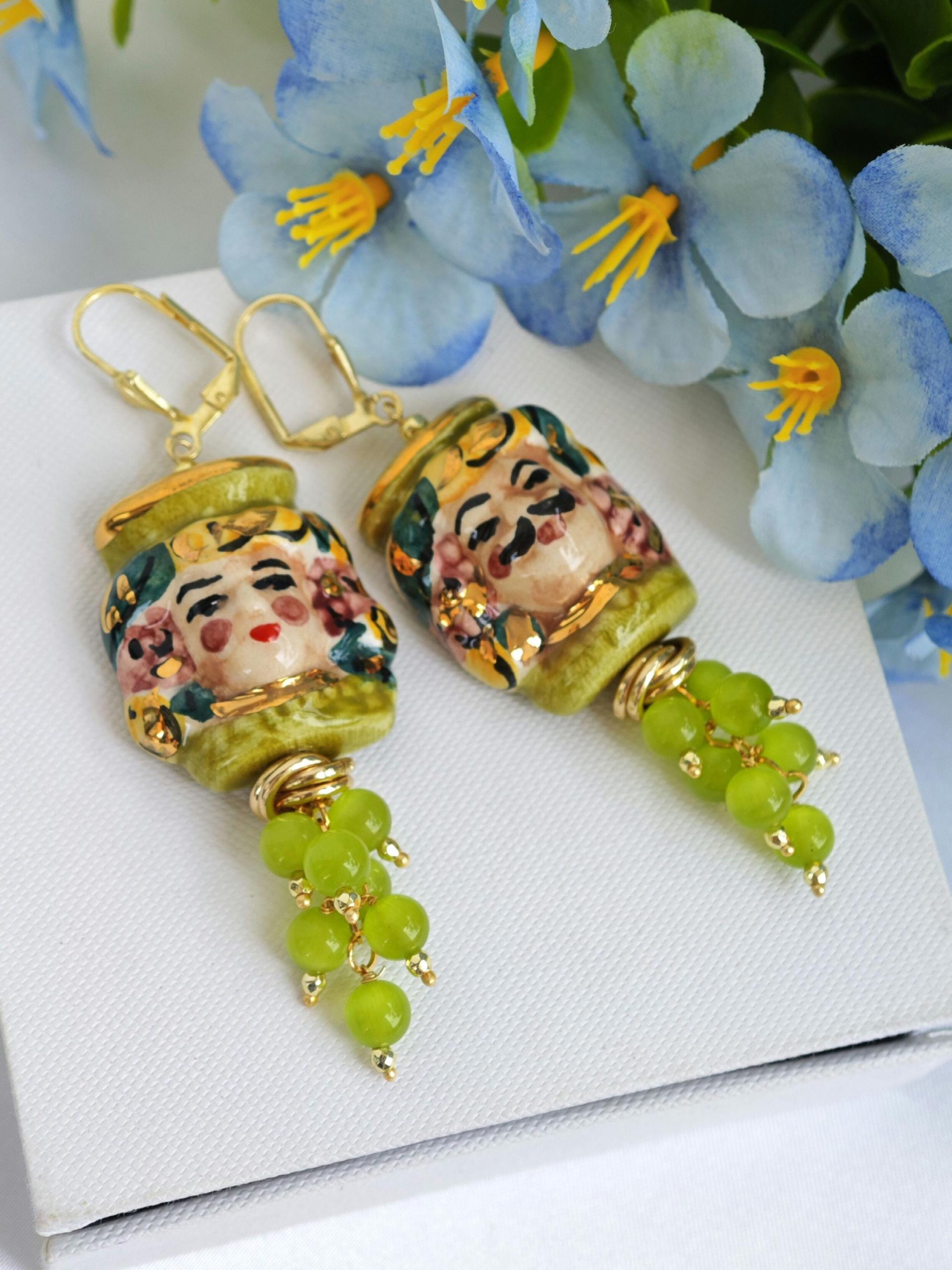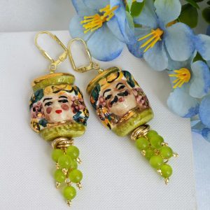 Orecchini ceramica Caltagirone, orecchini grappolo pietre quarzo verde, orecchini teste di moro siciliani
