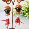 Orecchini pendenti con teste di moro in ceramica di Caltagirone realizzata e dipinta a mano con applicazioni foglia d’oro 22 kt, 4 cm dimensioni, grappolo perle pasta di turchese.